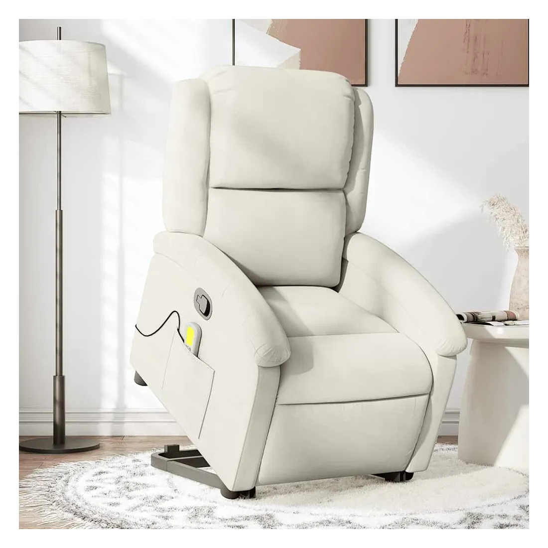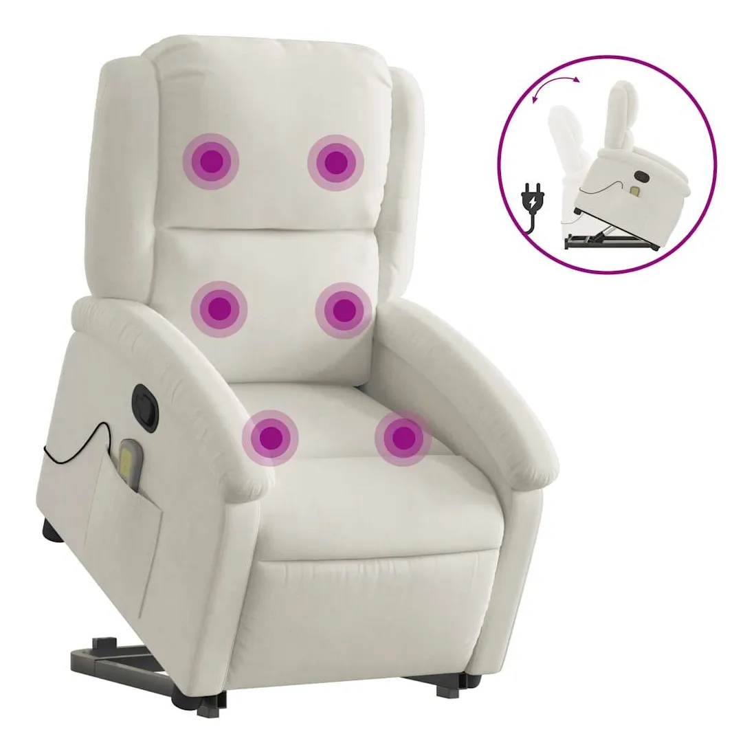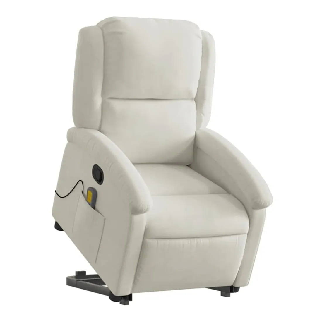 Asseyez-vous et détendez-vous dans ce fauteuil inclinable de massage très confortable ! Fonction de levage électrique : ce fauteuil inclinable pour personnes âgées est équipé d'un moteur électrique pour la fonction de levage. Grâce à la fonction qui pousse toute la chaise vers le haut, vous pouvez facilement vous tenir debout sans stresser votre dos et vos genoux en appuyant simplement sur le bouton.Fonction d'inclinaison manuelle : ce fauteuil inclinable est doté d'une poignée du côté droit. Vous pouvez régler manuellement le repose-pieds et le dossier dans n'importe quelle position selon votre confort en tirant simplement sur la poignée. Cette fonction permet une inclinaison maximale de 135 degrés. De plus, le dossier peut revenir rapidement à sa position d'origine en tirant simplement sur la poignée.Fonction de vibration : les 6 points de massage vous permettent de faire l'expérience d'un massage mieux ciblé. De plus, la télécommande incluse vous permet de choisir différents programmes de massage. La fonction de massage est alimentée par le connecteur USB qui nécessite une source d'alimentation USB certifiée de 5 V (non fournie).Expérience d'assise confortable : le siège, le dossier et les larges accoudoirs rembourrés épais recouverts de velours procurent une sensation confortable et chaleureuse, vous faisant vous sentir enlacé lorsque vous êtes assis. Le velours est un tissu doux et confortable qui est agréable sur la peau.Poche latérale pratique : ce fauteuil est doté d'une poche latérale pour ranger votre télécommande ou garder vos objets essentiels à portée de main.Cadre solide et stable : le cadre en bois et en métal offre une structure solide et une grande stabilité. Ce fauteuil inclinable est confortable et durable.