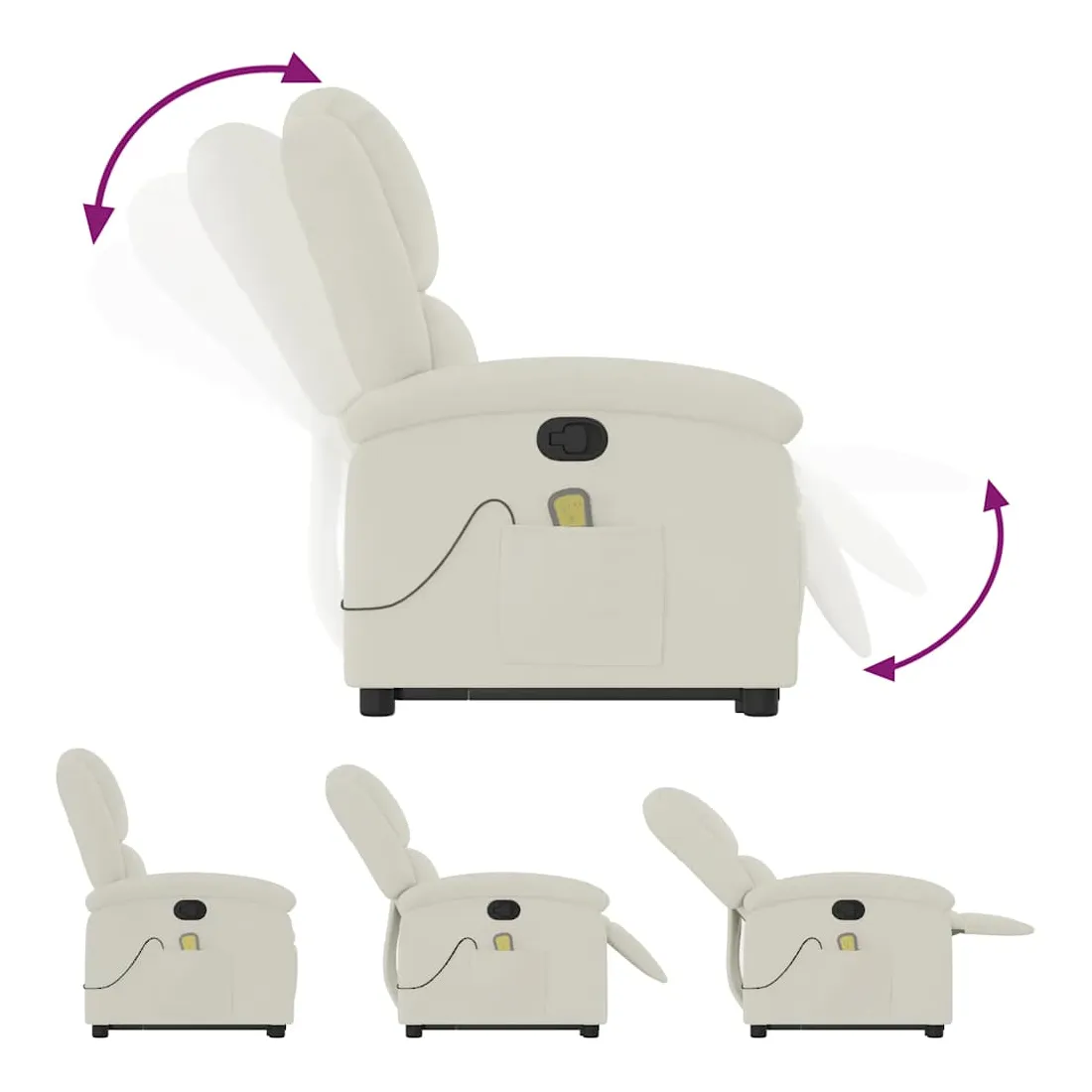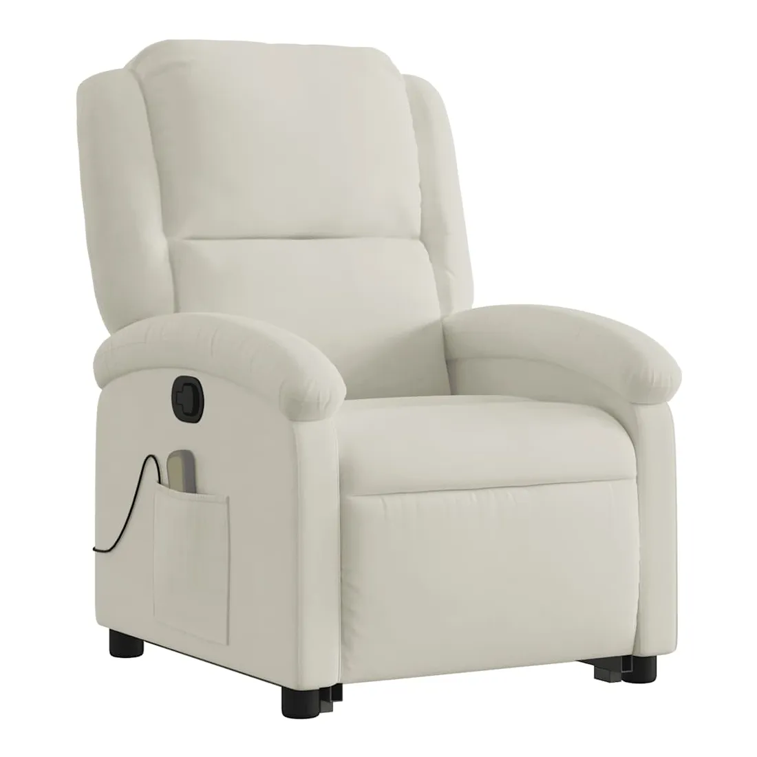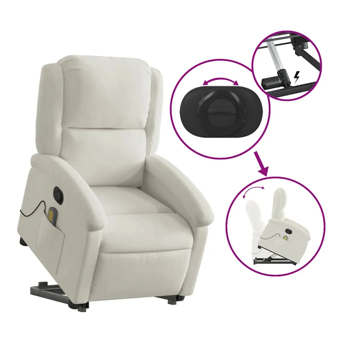 Asseyez-vous et détendez-vous dans ce fauteuil inclinable de massage très confortable ! Fonction de levage électrique : ce fauteuil inclinable pour personnes âgées est équipé d'un moteur électrique pour la fonction de levage. Grâce à la fonction qui pousse toute la chaise vers le haut, vous pouvez facilement vous tenir debout sans stresser votre dos et vos genoux en appuyant simplement sur le bouton.Fonction d'inclinaison manuelle : ce fauteuil inclinable est doté d'une poignée du côté droit. Vous pouvez régler manuellement le repose-pieds et le dossier dans n'importe quelle position selon votre confort en tirant simplement sur la poignée. Cette fonction permet une inclinaison maximale de 135 degrés. De plus, le dossier peut revenir rapidement à sa position d'origine en tirant simplement sur la poignée.Fonction de vibration : les 6 points de massage vous permettent de faire l'expérience d'un massage mieux ciblé. De plus, la télécommande incluse vous permet de choisir différents programmes de massage. La fonction de massage est alimentée par le connecteur USB qui nécessite une source d'alimentation USB certifiée de 5 V (non fournie).Expérience d'assise confortable : le siège, le dossier et les larges accoudoirs rembourrés épais recouverts de velours procurent une sensation confortable et chaleureuse, vous faisant vous sentir enlacé lorsque vous êtes assis. Le velours est un tissu doux et confortable qui est agréable sur la peau.Poche latérale pratique : ce fauteuil est doté d'une poche latérale pour ranger votre télécommande ou garder vos objets essentiels à portée de main.Cadre solide et stable : le cadre en bois et en métal offre une structure solide et une grande stabilité. Ce fauteuil inclinable est confortable et durable.