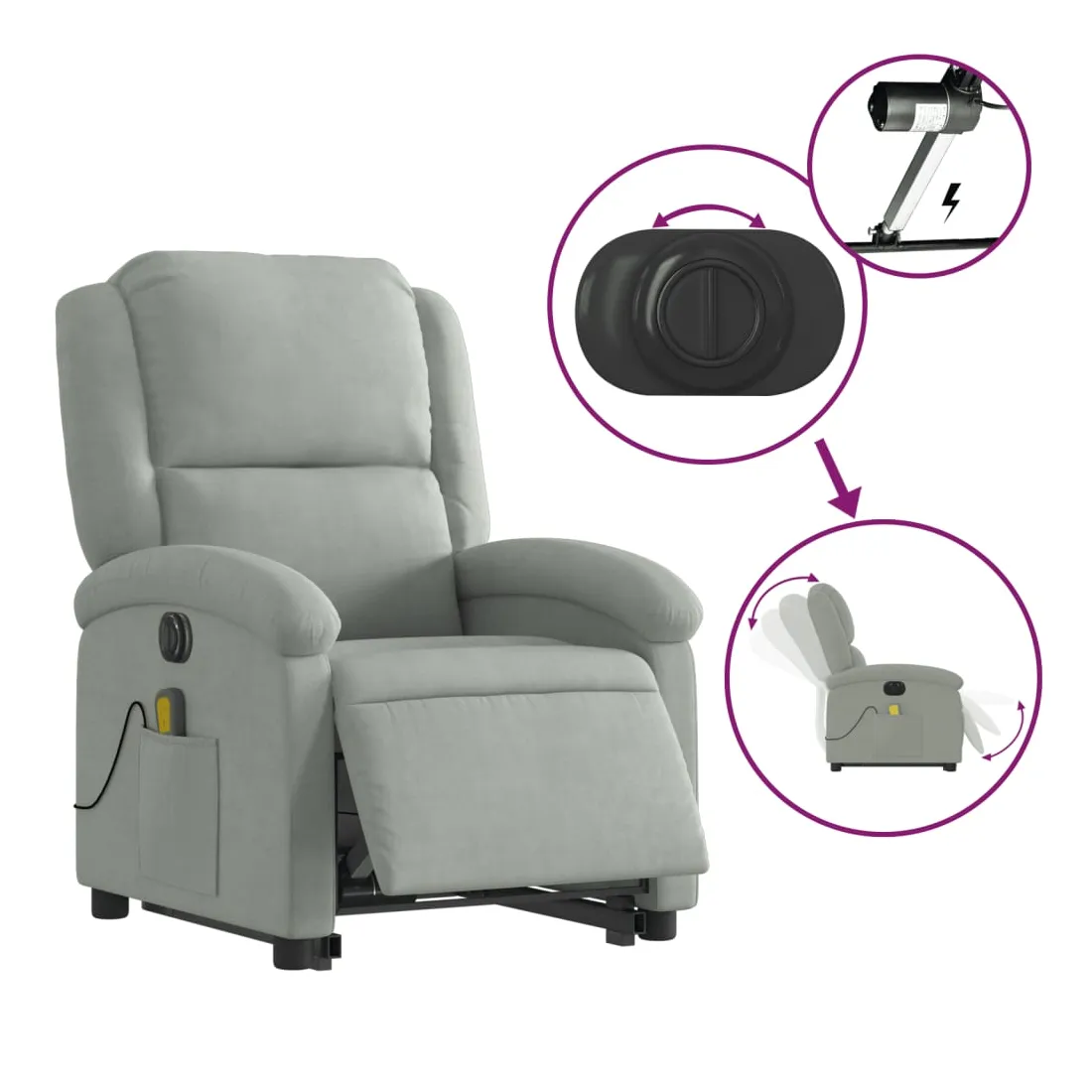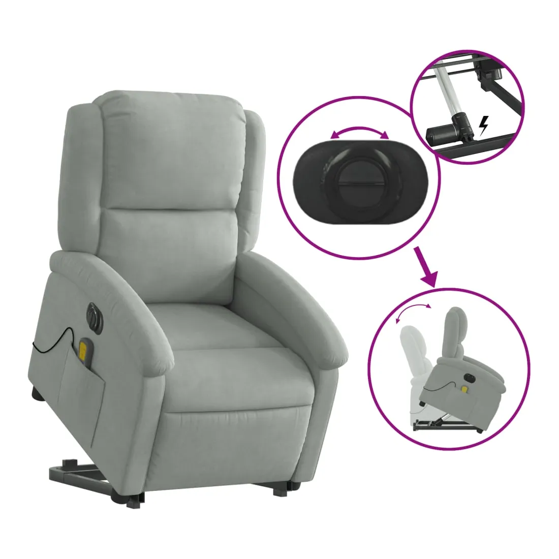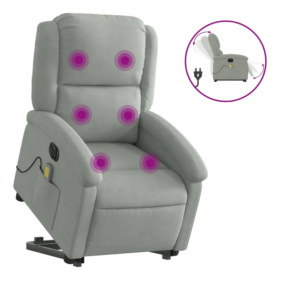 Asseyez-vous et détendez-vous dans ce fauteuil inclinable de massage électrique très confortable ! Fonction de levage électrique : ce fauteuil inclinable pour personnes âgées est équipé d'un moteur électrique pour la fonction de levage. Grâce à la fonction qui pousse toute la chaise vers le haut, vous pouvez facilement vous tenir debout sans stresser votre dos et vos genoux en appuyant simplement sur le bouton.Fonction d'inclinaison électrique : ce fauteuil inclinable est également équipé d'un moteur électrique qui permet de régler automatiquement le repose-pied et le dossier dans n'importe quelle position, selon votre confort, en appuyant simplement sur le bouton situé sur le côté du fauteuil. Cette fonction permet une inclinaison maximale de 135 degrés. En outre, le dossier peut revenir automatiquement à sa position d'origine par une simple pression sur le bouton.Fonction de vibration : les 6 points de massage vous permettent de faire l'expérience d'un massage mieux ciblé. De plus, la télécommande incluse vous permet de choisir différents programmes de massage. La fonction de massage est alimentée par le connecteur USB qui nécessite une source d'alimentation USB certifiée de 5 V (non fournie).Expérience d'assise confortable : le siège, le dossier et les larges accoudoirs rembourrés épais recouverts de velours procurent une sensation confortable et chaleureuse, vous faisant vous sentir enlacé lorsque vous êtes assis. Le velours est un tissu doux et confortable qui est agréable sur la peau.Poche latérale pratique : ce fauteuil est doté d'une poche latérale pour ranger votre télécommande ou garder vos objets essentiels à portée de main.Cadre solide et stable : le cadre en bois et en métal offre une structure solide et une grande stabilité. Ce fauteuil inclinable est confortable et durable.