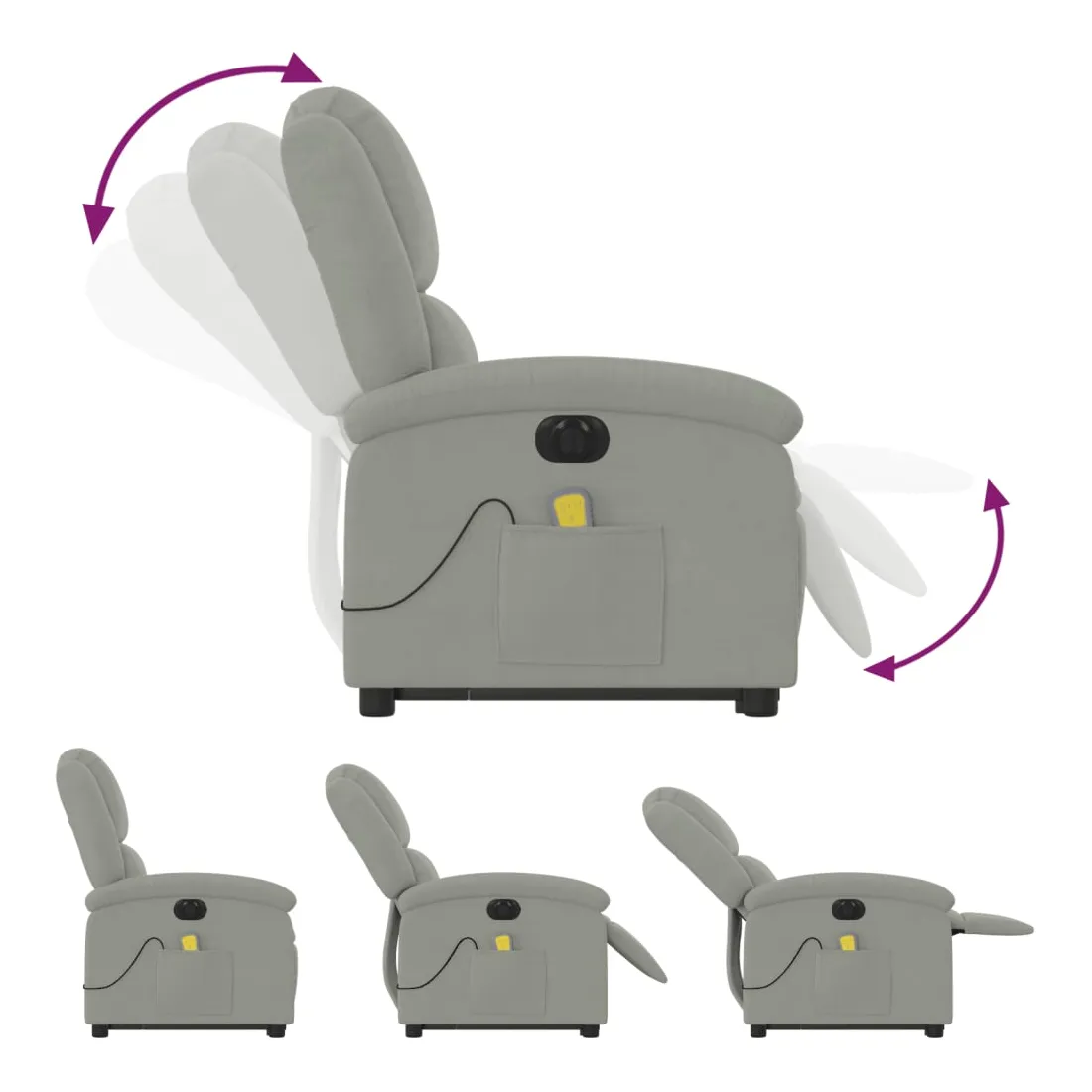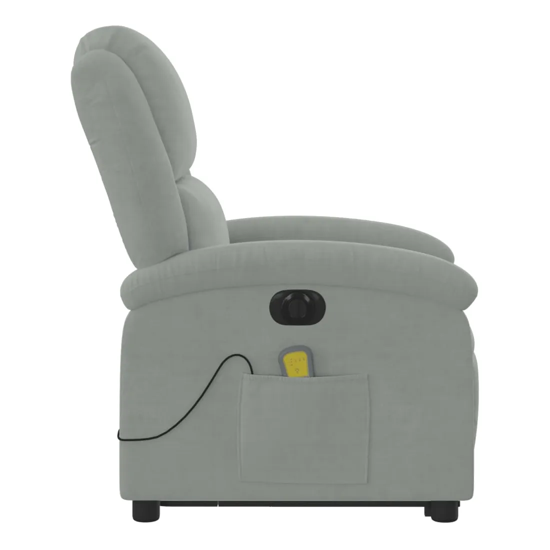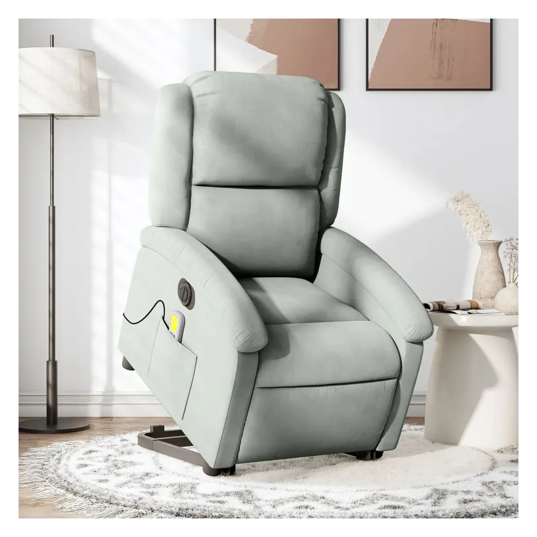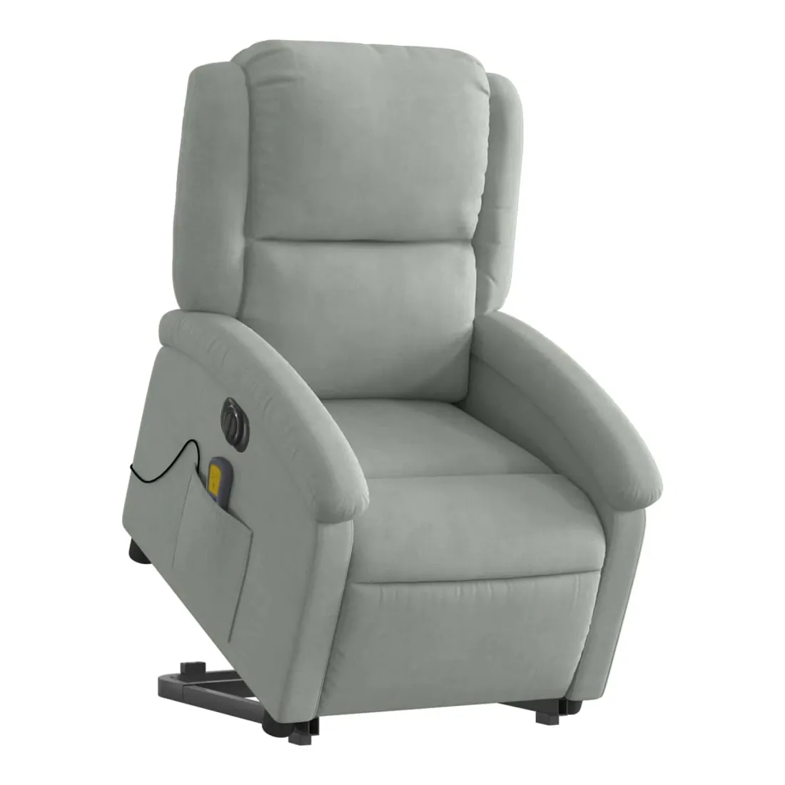 Asseyez-vous et détendez-vous dans ce fauteuil inclinable de massage électrique très confortable ! Fonction de levage électrique : ce fauteuil inclinable pour personnes âgées est équipé d'un moteur électrique pour la fonction de levage. Grâce à la fonction qui pousse toute la chaise vers le haut, vous pouvez facilement vous tenir debout sans stresser votre dos et vos genoux en appuyant simplement sur le bouton.Fonction d'inclinaison électrique : ce fauteuil inclinable est également équipé d'un moteur électrique qui permet de régler automatiquement le repose-pied et le dossier dans n'importe quelle position, selon votre confort, en appuyant simplement sur le bouton situé sur le côté du fauteuil. Cette fonction permet une inclinaison maximale de 135 degrés. En outre, le dossier peut revenir automatiquement à sa position d'origine par une simple pression sur le bouton.Fonction de vibration : les 6 points de massage vous permettent de faire l'expérience d'un massage mieux ciblé. De plus, la télécommande incluse vous permet de choisir différents programmes de massage. La fonction de massage est alimentée par le connecteur USB qui nécessite une source d'alimentation USB certifiée de 5 V (non fournie).Expérience d'assise confortable : le siège, le dossier et les larges accoudoirs rembourrés épais recouverts de velours procurent une sensation confortable et chaleureuse, vous faisant vous sentir enlacé lorsque vous êtes assis. Le velours est un tissu doux et confortable qui est agréable sur la peau.Poche latérale pratique : ce fauteuil est doté d'une poche latérale pour ranger votre télécommande ou garder vos objets essentiels à portée de main.Cadre solide et stable : le cadre en bois et en métal offre une structure solide et une grande stabilité. Ce fauteuil inclinable est confortable et durable.