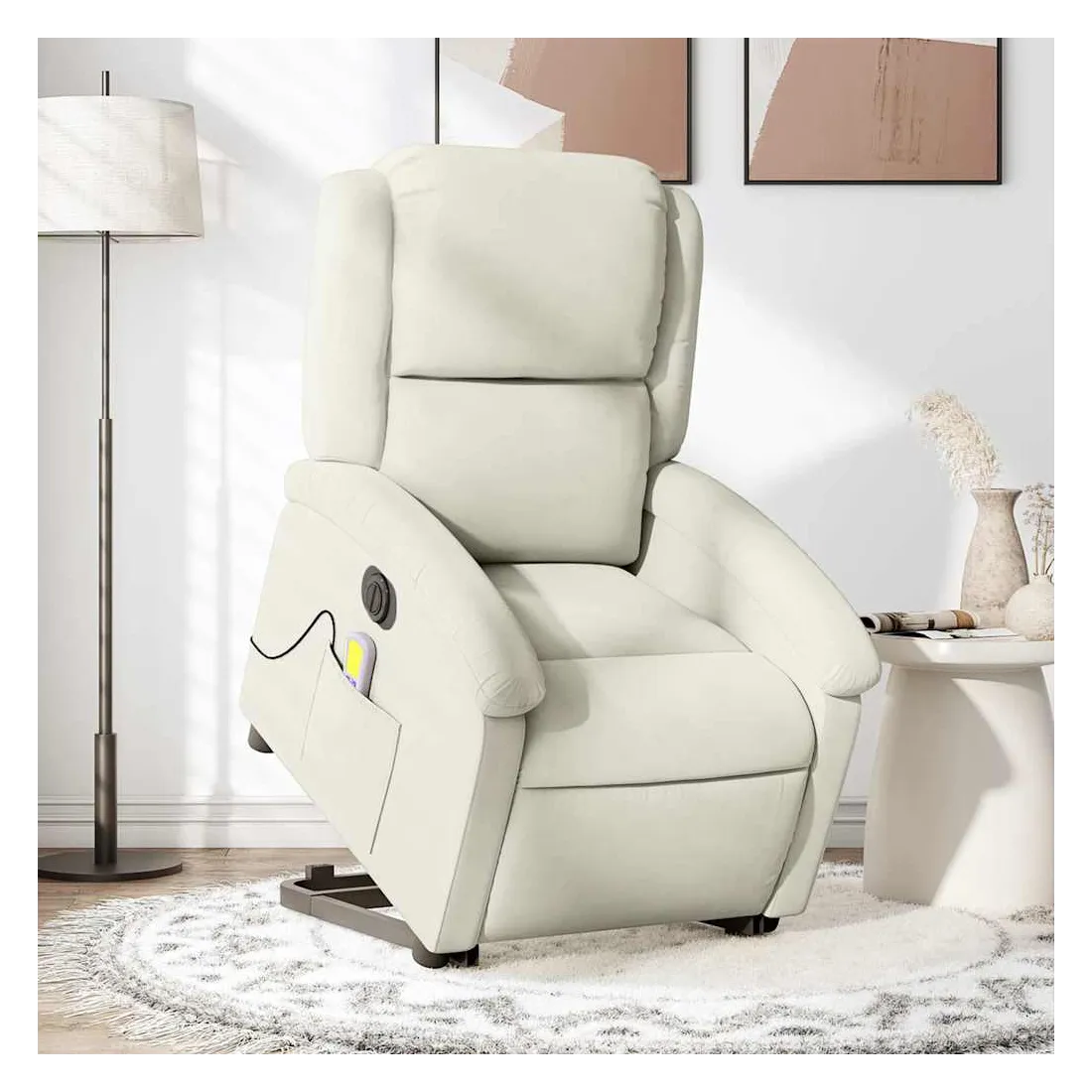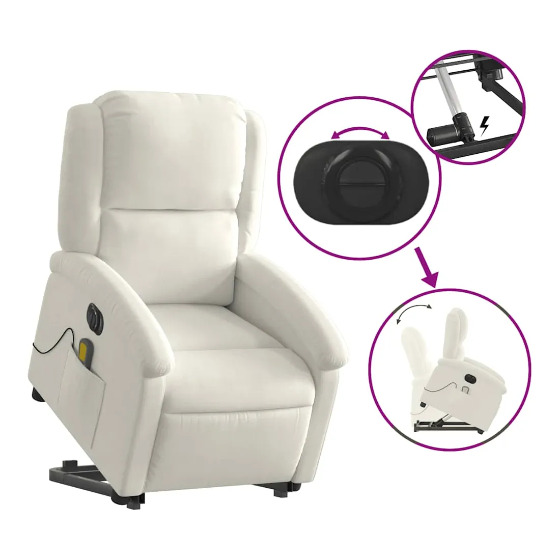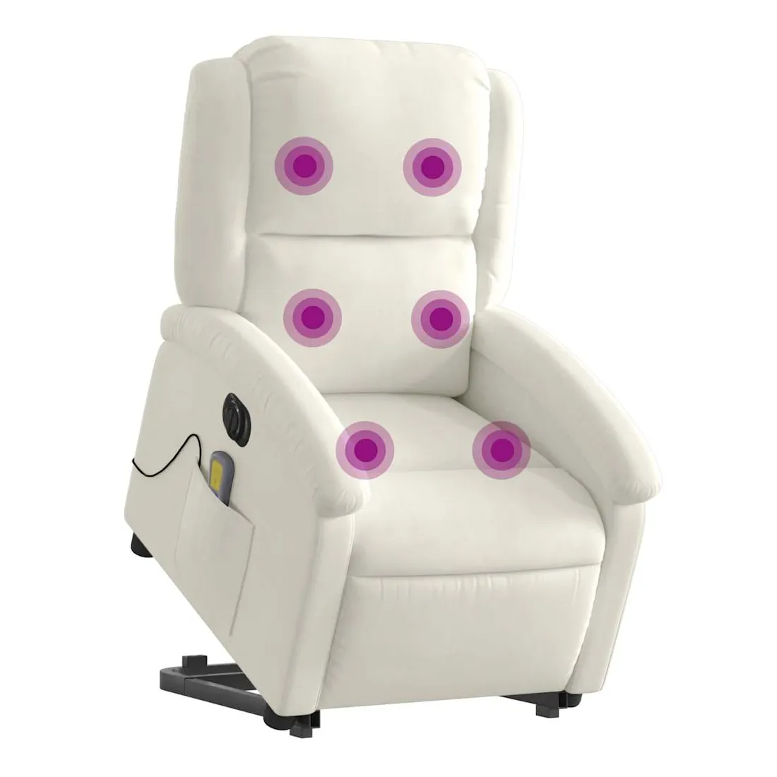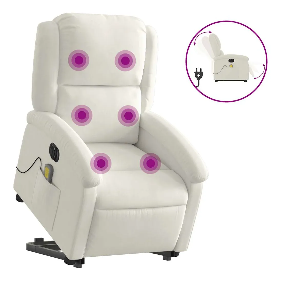Asseyez-vous et détendez-vous dans ce fauteuil inclinable de massage électrique très confortable ! Fonction de levage électrique : ce fauteuil inclinable pour personnes âgées est équipé d'un moteur électrique pour la fonction de levage. Grâce à la fonction qui pousse toute la chaise vers le haut, vous pouvez facilement vous tenir debout sans stresser votre dos et vos genoux en appuyant simplement sur le bouton.Fonction d'inclinaison électrique : ce fauteuil inclinable est également équipé d'un moteur électrique qui permet de régler automatiquement le repose-pied et le dossier dans n'importe quelle position, selon votre confort, en appuyant simplement sur le bouton situé sur le côté du fauteuil. Cette fonction permet une inclinaison maximale de 135 degrés. En outre, le dossier peut revenir automatiquement à sa position d'origine par une simple pression sur le bouton.Fonction de vibration : les 6 points de massage vous permettent de faire l'expérience d'un massage mieux ciblé. De plus, la télécommande incluse vous permet de choisir différents programmes de massage. La fonction de massage est alimentée par le connecteur USB qui nécessite une source d'alimentation USB certifiée de 5 V (non fournie).Expérience d'assise confortable : le siège, le dossier et les larges accoudoirs rembourrés épais recouverts de velours procurent une sensation confortable et chaleureuse, vous faisant vous sentir enlacé lorsque vous êtes assis. Le velours est un tissu doux et confortable qui est agréable sur la peau.Poche latérale pratique : ce fauteuil est doté d'une poche latérale pour ranger votre télécommande ou garder vos objets essentiels à portée de main.Cadre solide et stable : le cadre en bois et en métal offre une structure solide et une grande stabilité. Ce fauteuil inclinable est confortable et durable.
