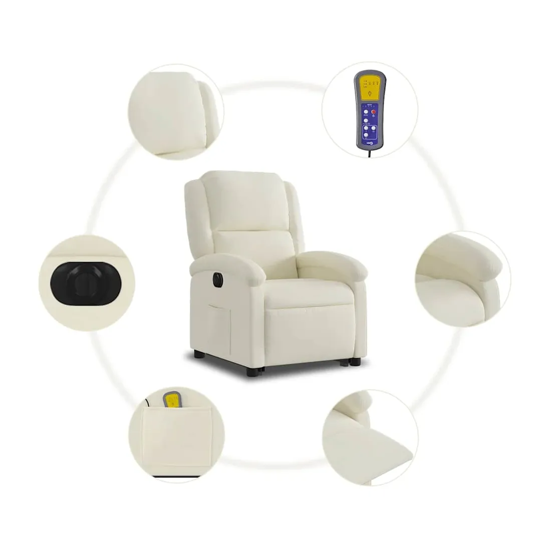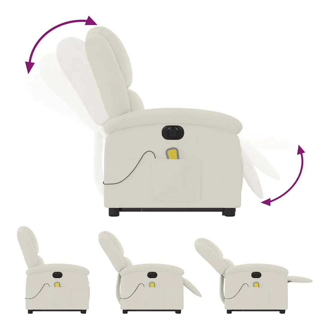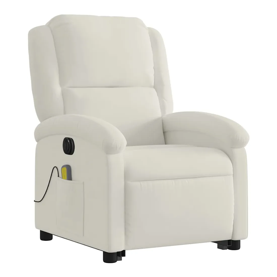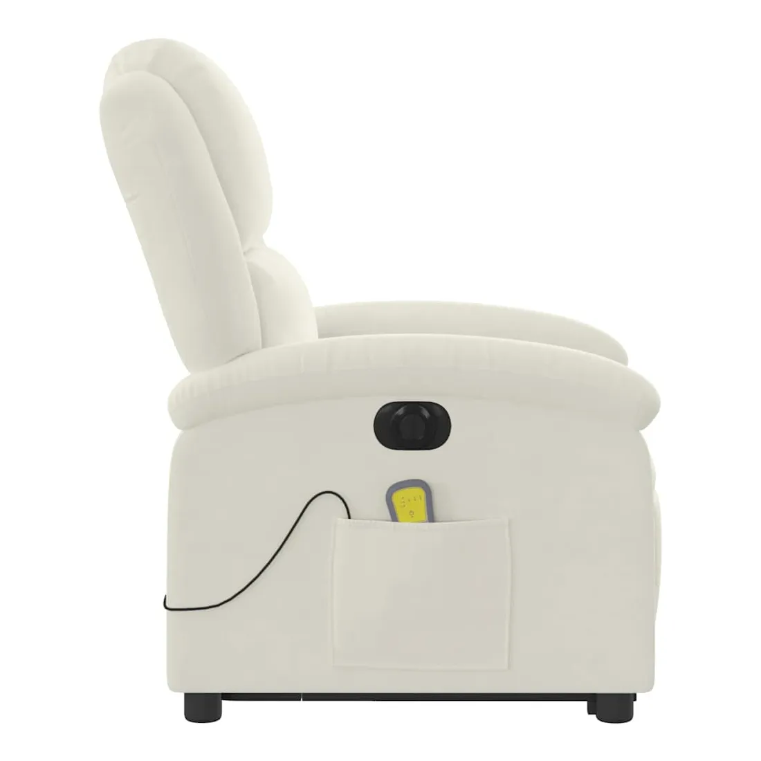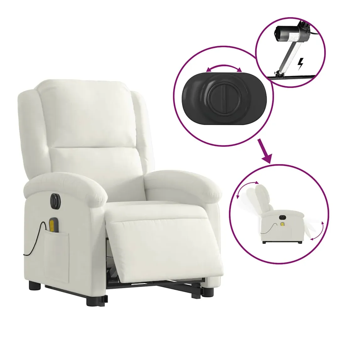 Asseyez-vous et détendez-vous dans ce fauteuil inclinable de massage électrique très confortable ! Fonction de levage électrique : ce fauteuil inclinable pour personnes âgées est équipé d'un moteur électrique pour la fonction de levage. Grâce à la fonction qui pousse toute la chaise vers le haut, vous pouvez facilement vous tenir debout sans stresser votre dos et vos genoux en appuyant simplement sur le bouton.Fonction d'inclinaison électrique : ce fauteuil inclinable est également équipé d'un moteur électrique qui permet de régler automatiquement le repose-pied et le dossier dans n'importe quelle position, selon votre confort, en appuyant simplement sur le bouton situé sur le côté du fauteuil. Cette fonction permet une inclinaison maximale de 135 degrés. En outre, le dossier peut revenir automatiquement à sa position d'origine par une simple pression sur le bouton.Fonction de vibration : les 6 points de massage vous permettent de faire l'expérience d'un massage mieux ciblé. De plus, la télécommande incluse vous permet de choisir différents programmes de massage. La fonction de massage est alimentée par le connecteur USB qui nécessite une source d'alimentation USB certifiée de 5 V (non fournie).Expérience d'assise confortable : le siège, le dossier et les larges accoudoirs rembourrés épais recouverts de velours procurent une sensation confortable et chaleureuse, vous faisant vous sentir enlacé lorsque vous êtes assis. Le velours est un tissu doux et confortable qui est agréable sur la peau.Poche latérale pratique : ce fauteuil est doté d'une poche latérale pour ranger votre télécommande ou garder vos objets essentiels à portée de main.Cadre solide et stable : le cadre en bois et en métal offre une structure solide et une grande stabilité. Ce fauteuil inclinable est confortable et durable.