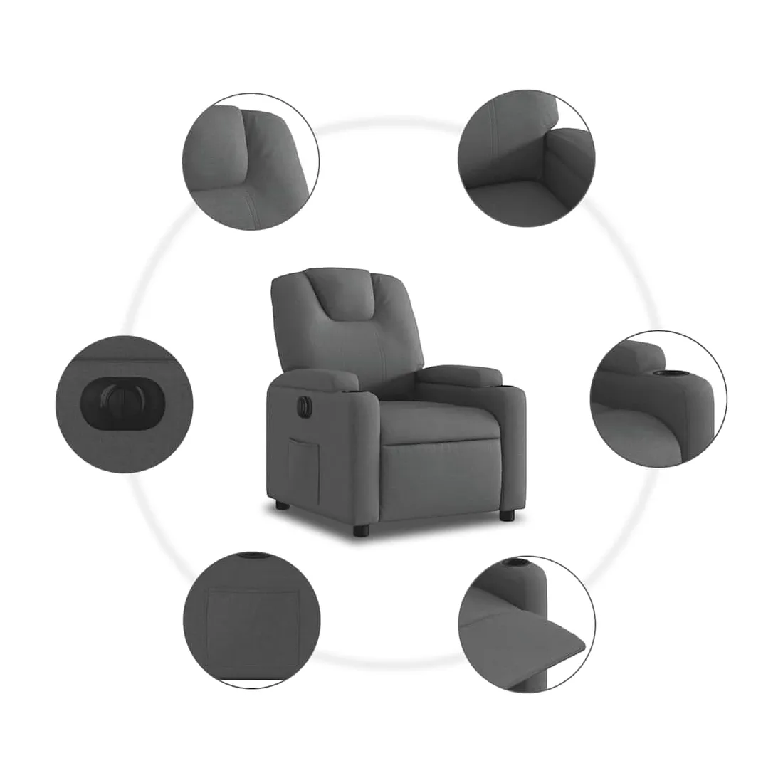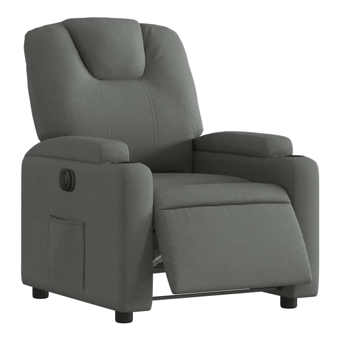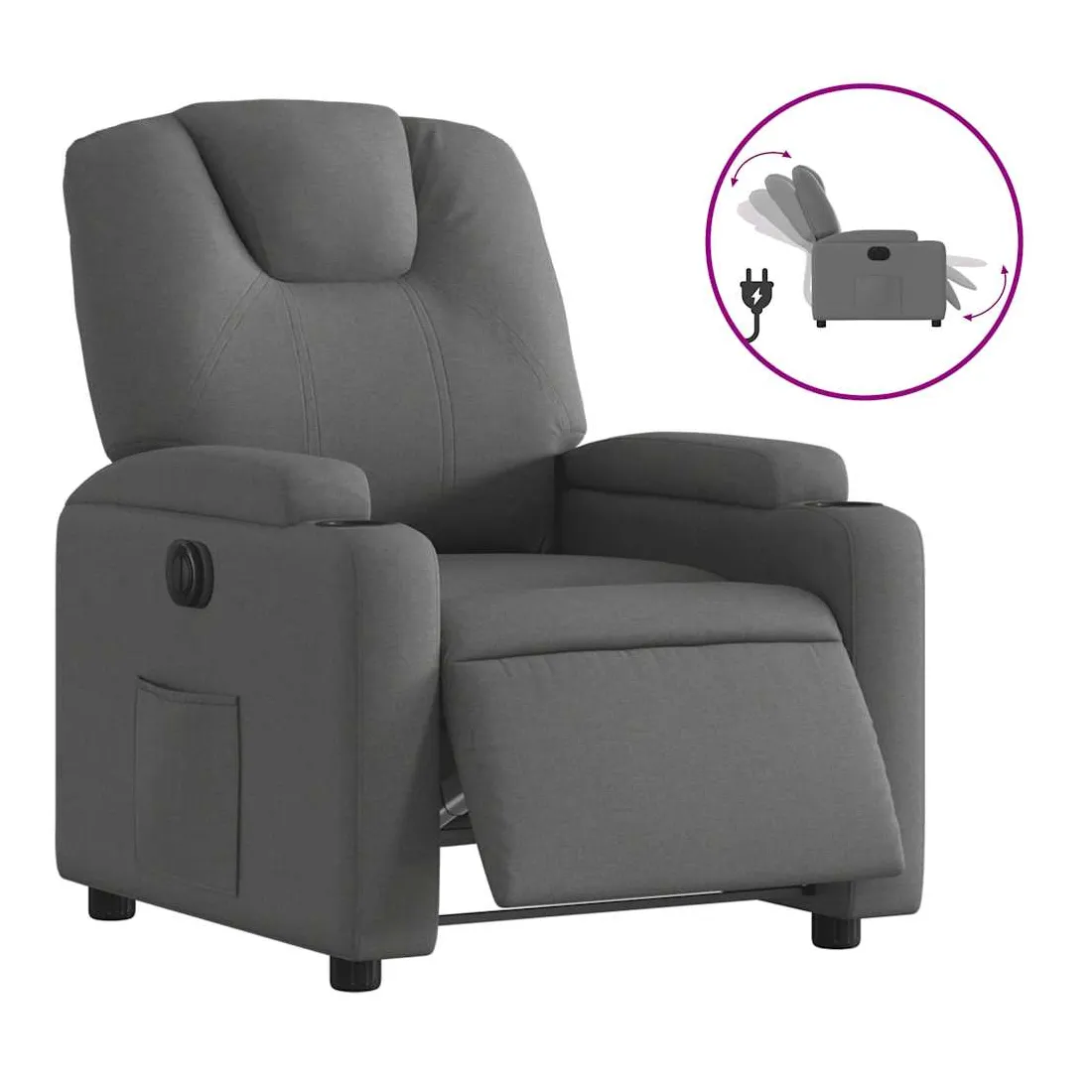 Asseyez-vous et détendez-vous dans ce fauteuil inclinable électrique très confortable ! Fonction d'inclinaison électrique : ce fauteuil inclinable est équipé d'un moteur électrique qui permet de régler automatiquement le repose-pied et le dossier dans n'importe quelle position, selon votre confort, en appuyant simplement sur le bouton situé sur le côté du fauteuil. Cette fonction permet une inclinaison maximale de 135 degrés. En outre, le dossier peut revenir automatiquement à sa position d'origine par une simple pression sur le bouton.Expérience d'assise confortable : le siège, le dossier et les larges accoudoirs bien rembourrés recouverts de tissu procurent une sensation confortable et chaleureuse, vous permettant de vous sentir enveloppé lorsque vous êtes assis. Le tissu présente un aspect simple et épuré et est respirant et durable.Porte-gobelets et poche latérale pratiques : ce fauteuil dispose de deux porte-gobelets pratiques pour vos boissons et d'une poche latérale pour garder vos objets essentiels à portée de main.Cadre solide et stable : le cadre en bois et en métal offre une structure solide et une grande stabilité. Ce fauteuil inclinable est confortable et durable.