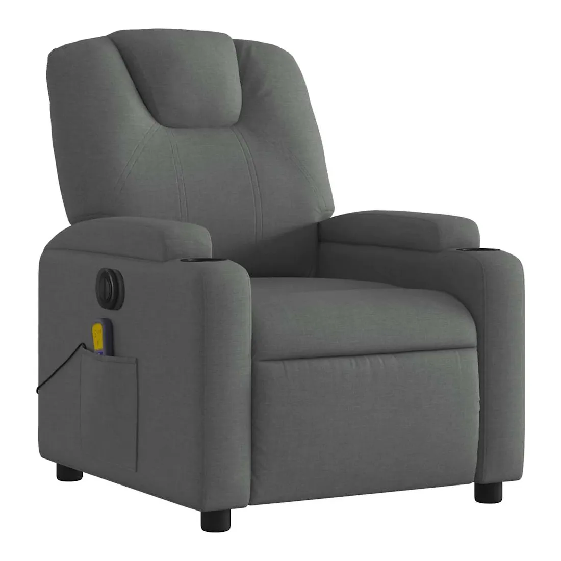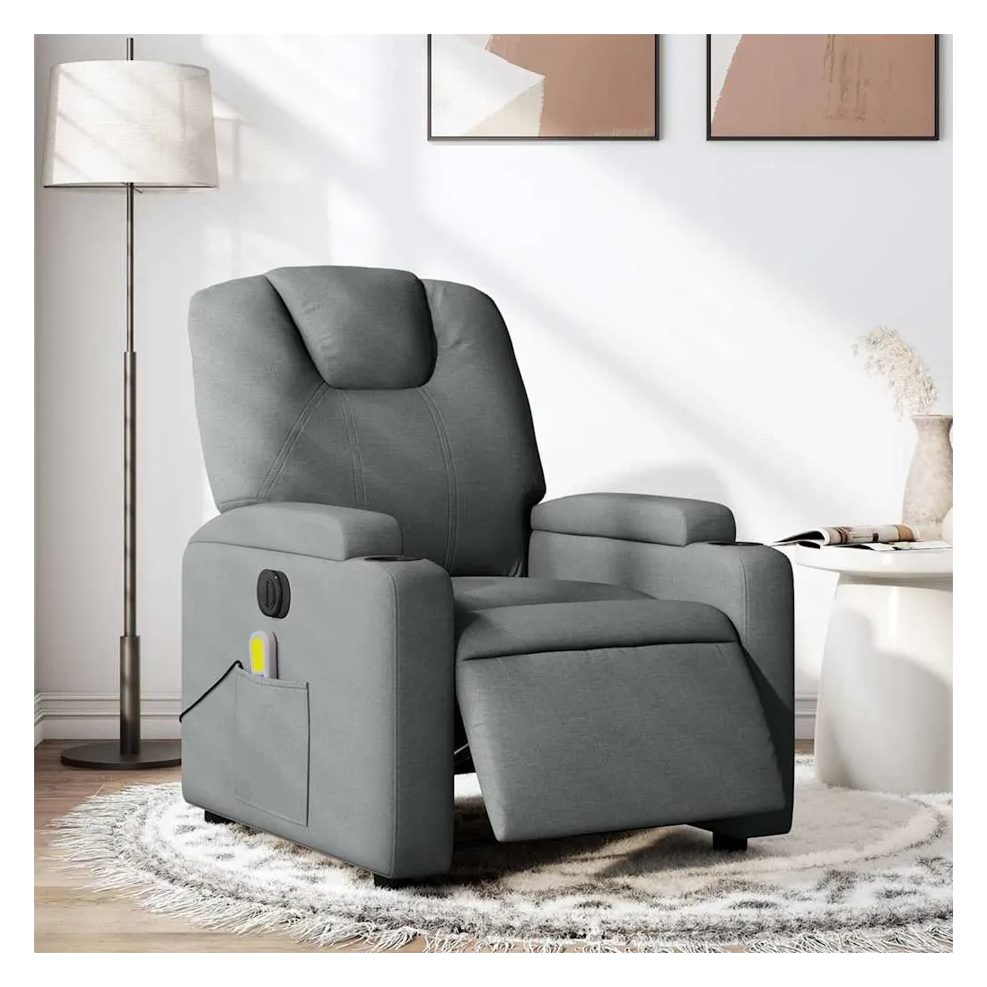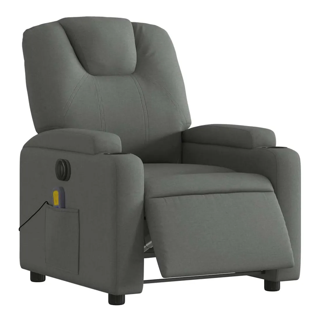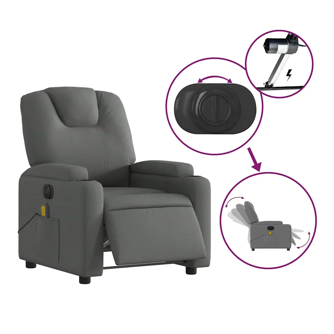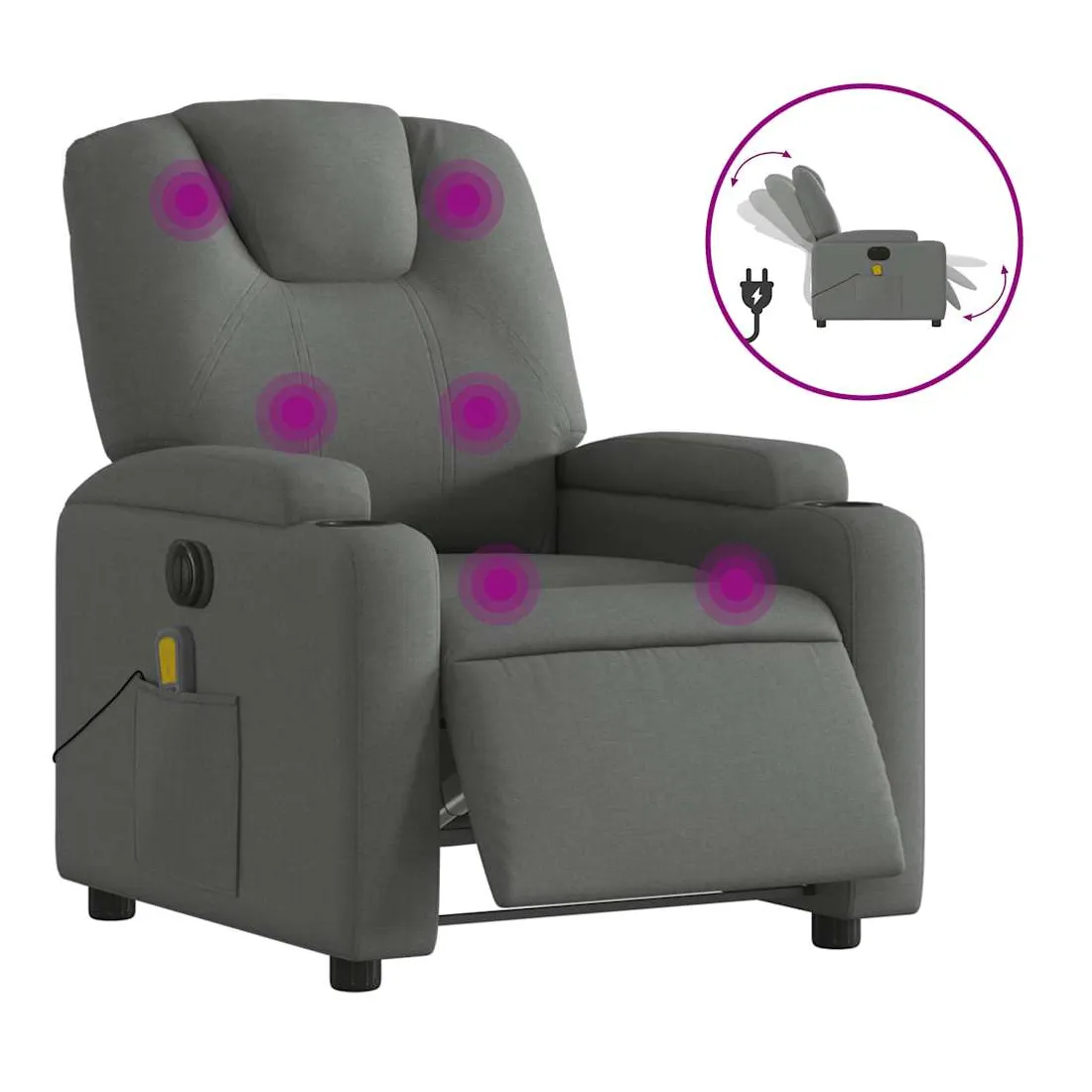 Asseyez-vous et détendez-vous dans ce fauteuil inclinable de massage électrique très confortable ! Fonction d'inclinaison électrique : ce fauteuil inclinable est équipé d'un moteur électrique qui permet de régler automatiquement le repose-pied et le dossier dans n'importe quelle position, selon votre confort, en appuyant simplement sur le bouton situé sur le côté du fauteuil. Cette fonction permet une inclinaison maximale de 135 degrés. En outre, le dossier peut revenir automatiquement à sa position d'origine par une simple pression sur le bouton.Fonction de vibration : les 6 points de massage vous permettent de faire l'expérience d'un massage mieux ciblé. De plus, la télécommande incluse vous permet de choisir différents programmes de massage. La fonction de massage est alimentée par le connecteur USB qui nécessite une source d'alimentation USB certifiée de 5 V (non fournie).Expérience d'assise confortable : le siège, le dossier et les larges accoudoirs bien rembourrés recouverts de tissu procurent une sensation confortable et chaleureuse, vous permettant de vous sentir enveloppé lorsque vous êtes assis. Le tissu présente un aspect simple et épuré et est respirant et durable.Porte-gobelets et poche latérale pratiques : ce fauteuil dispose de deux porte-gobelets pratiques pour vos boissons et d'une poche latérale pour votre télécommande ou pour garder vos objets essentiels à portée de main.Cadre solide et stable : le cadre en bois et en métal offre une structure solide et une grande stabilité. Ce fauteuil inclinable est confortable et durable.