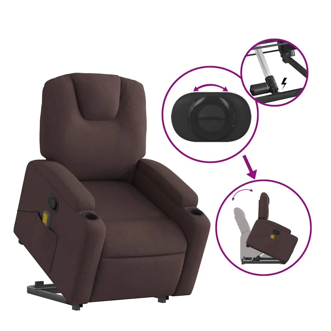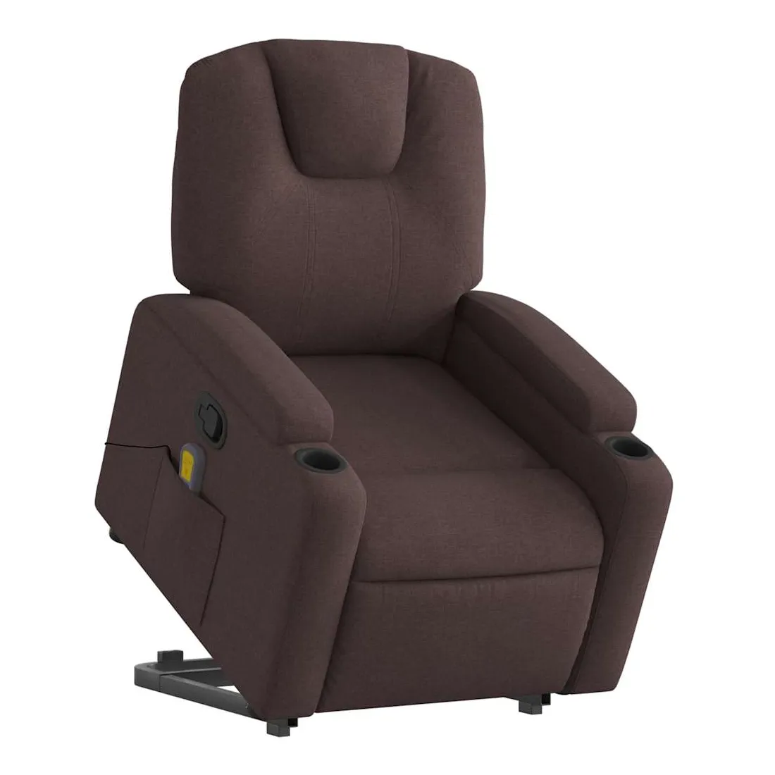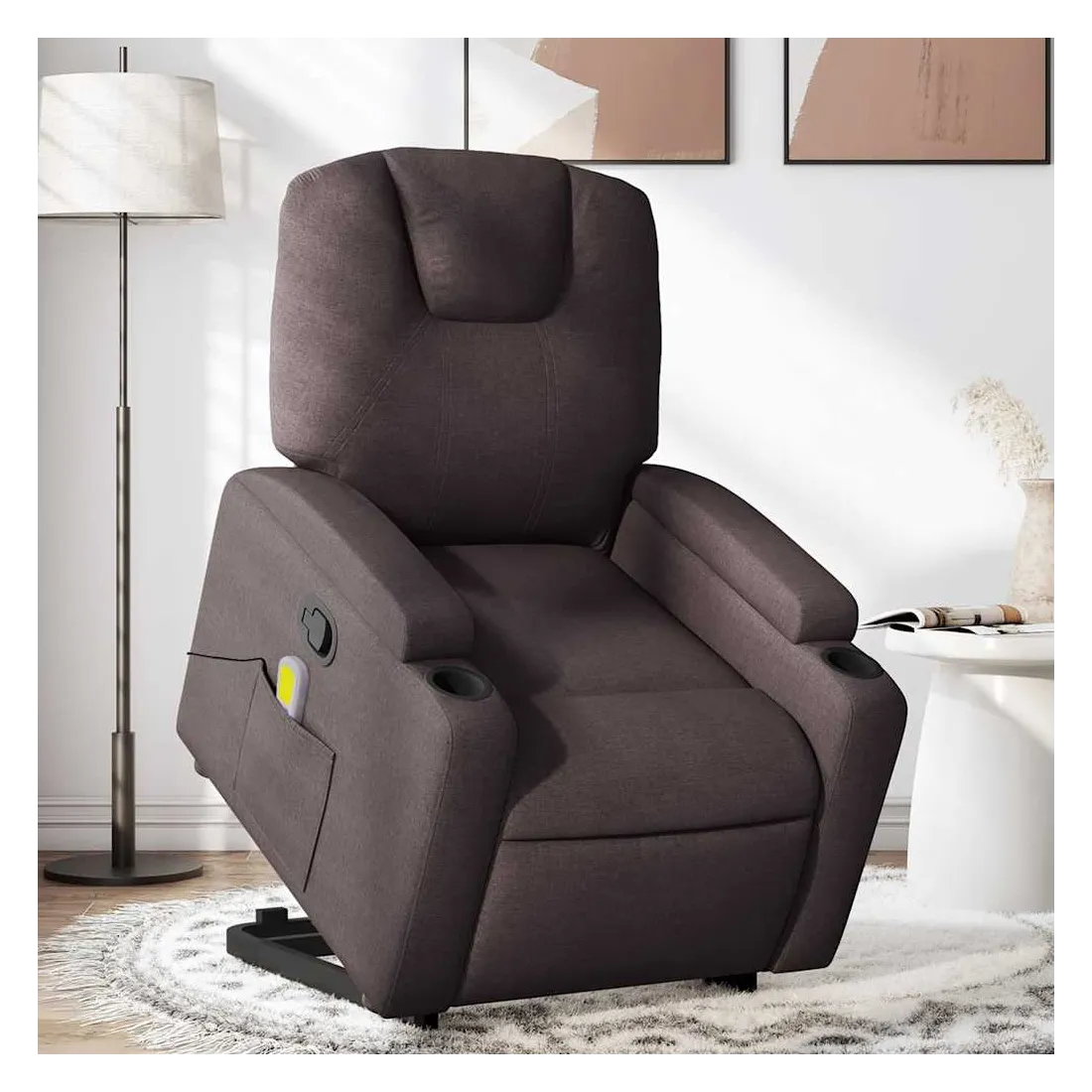 Asseyez-vous et détendez-vous dans ce fauteuil inclinable de massage très confortable ! Fonction de levage électrique : ce fauteuil inclinable pour personnes âgées est équipé d'un moteur électrique pour la fonction de levage. Grâce à la fonction qui pousse toute la chaise vers le haut, vous pouvez facilement vous tenir debout sans stresser votre dos et vos genoux en appuyant simplement sur le bouton.Fonction d'inclinaison manuelle : ce fauteuil inclinable est doté d'une poignée du côté droit. Vous pouvez régler manuellement le repose-pieds et le dossier dans n'importe quelle position selon votre confort en tirant simplement sur la poignée. Cette fonction permet une inclinaison maximale de 135 degrés. De plus, le dossier peut revenir rapidement à sa position d'origine en tirant simplement sur la poignée.Fonction de vibration : les 6 points de massage vous permettent de faire l'expérience d'un massage mieux ciblé. De plus, la télécommande incluse vous permet de choisir différents programmes de massage. La fonction de massage est alimentée par le connecteur USB qui nécessite une source d'alimentation USB certifiée de 5 V (non fournie).Expérience d'assise confortable : le siège, le dossier et les larges accoudoirs bien rembourrés recouverts de tissu procurent une sensation confortable et chaleureuse, vous permettant de vous sentir enveloppé lorsque vous êtes assis. Le tissu présente un aspect simple et épuré et est respirant et durable.Porte-gobelets et poche latérale pratiques : ce fauteuil dispose de deux porte-gobelets pratiques pour vos boissons et d'une poche latérale pour votre télécommande ou pour garder vos objets essentiels à portée de main.Cadre solide et stable : le cadre en bois et en métal offre une structure solide et une grande stabilité. Ce fauteuil inclinable est confortable et durable.