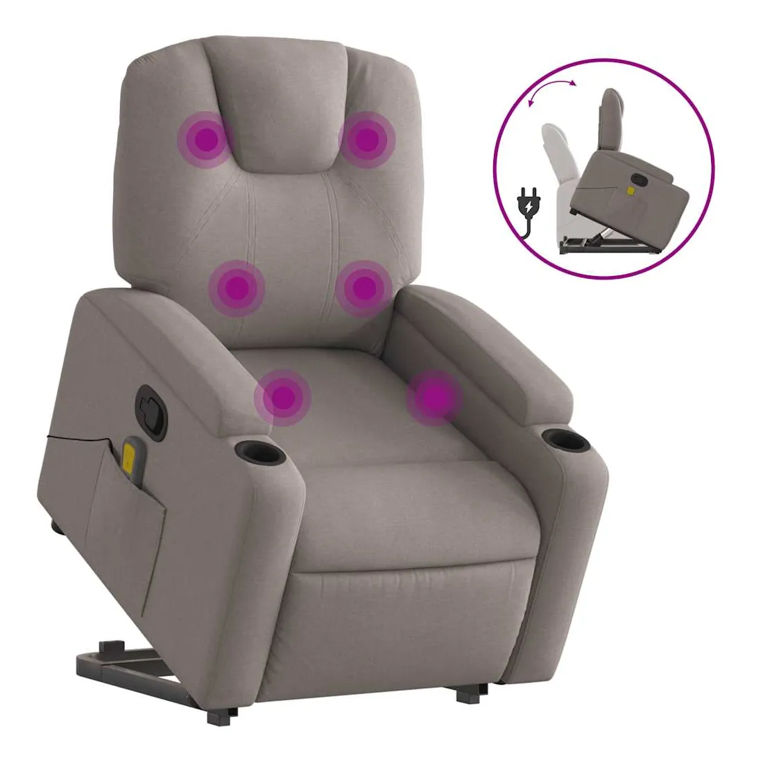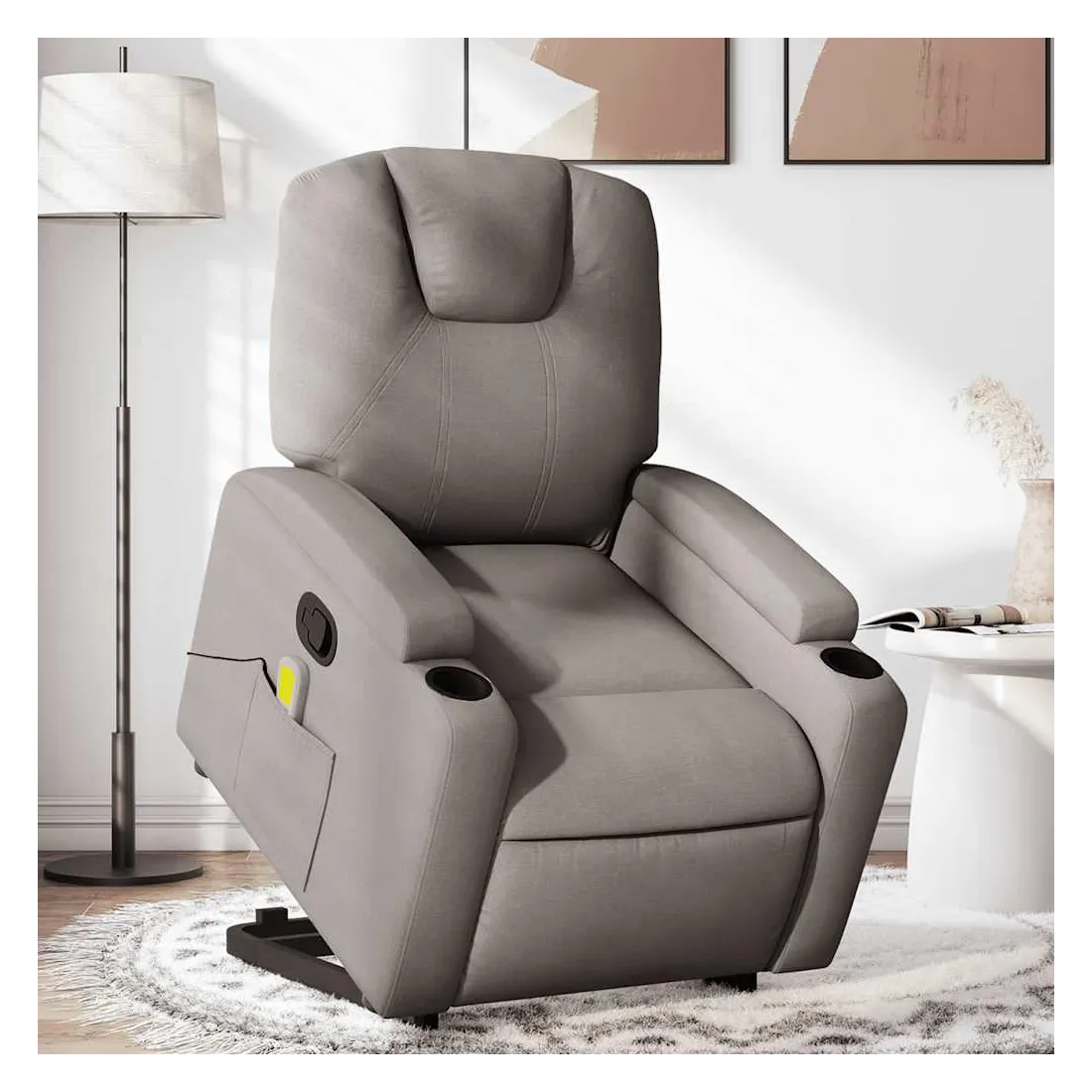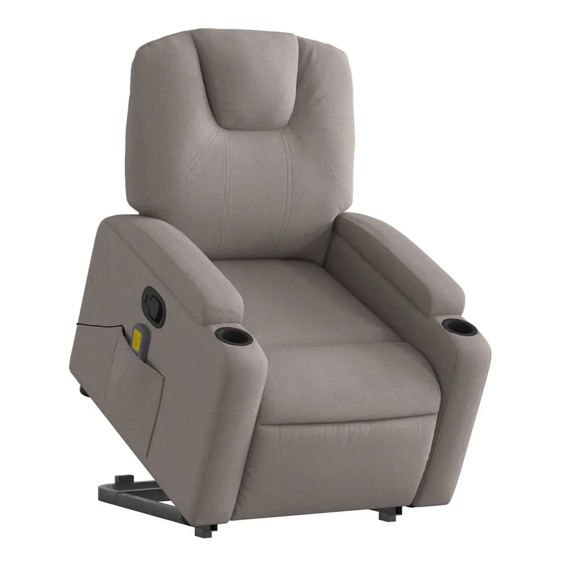 Asseyez-vous et détendez-vous dans ce fauteuil inclinable de massage très confortable ! Fonction de levage électrique : ce fauteuil inclinable pour personnes âgées est équipé d'un moteur électrique pour la fonction de levage. Grâce à la fonction qui pousse toute la chaise vers le haut, vous pouvez facilement vous tenir debout sans stresser votre dos et vos genoux en appuyant simplement sur le bouton.Fonction d'inclinaison manuelle : ce fauteuil inclinable est doté d'une poignée du côté droit. Vous pouvez régler manuellement le repose-pieds et le dossier dans n'importe quelle position selon votre confort en tirant simplement sur la poignée. Cette fonction permet une inclinaison maximale de 135 degrés. De plus, le dossier peut revenir rapidement à sa position d'origine en tirant simplement sur la poignée.Fonction de vibration : les 6 points de massage vous permettent de faire l'expérience d'un massage mieux ciblé. De plus, la télécommande incluse vous permet de choisir différents programmes de massage. La fonction de massage est alimentée par le connecteur USB qui nécessite une source d'alimentation USB certifiée de 5 V (non fournie).Expérience d'assise confortable : le siège, le dossier et les larges accoudoirs bien rembourrés recouverts de tissu procurent une sensation confortable et chaleureuse, vous permettant de vous sentir enveloppé lorsque vous êtes assis. Le tissu présente un aspect simple et épuré et est respirant et durable.Porte-gobelets et poche latérale pratiques : ce fauteuil dispose de deux porte-gobelets pratiques pour vos boissons et d'une poche latérale pour votre télécommande ou pour garder vos objets essentiels à portée de main.Cadre solide et stable : le cadre en bois et en métal offre une structure solide et une grande stabilité. Ce fauteuil inclinable est confortable et durable.