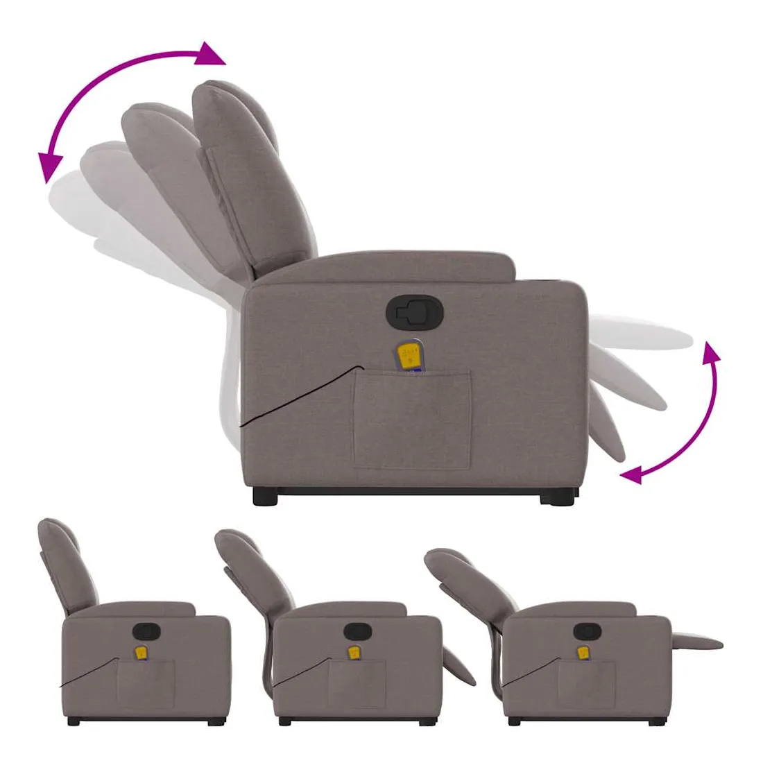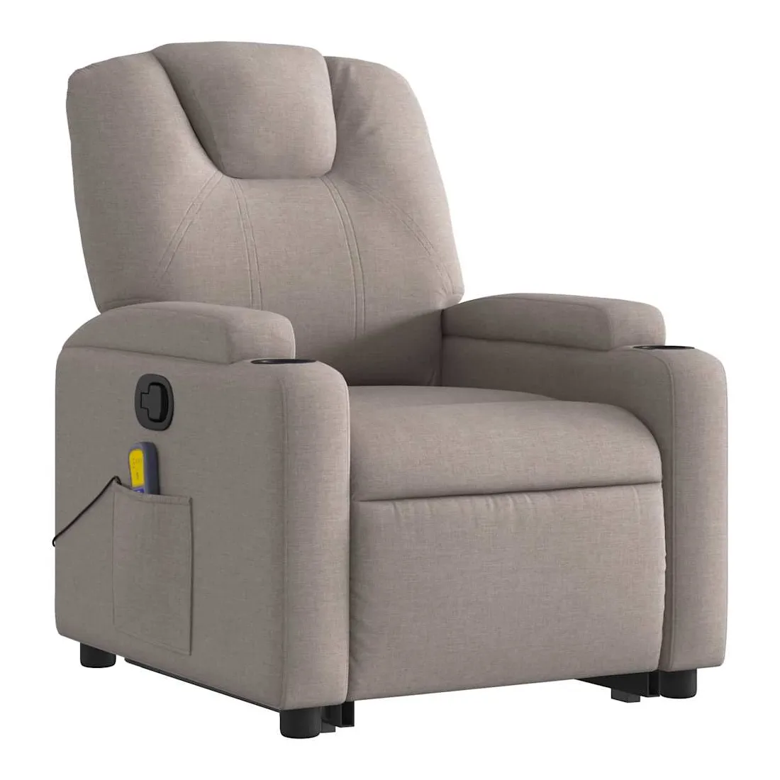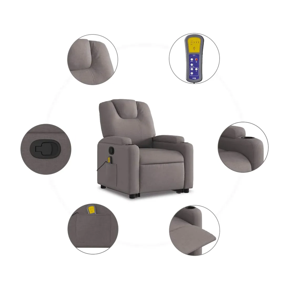 Asseyez-vous et détendez-vous dans ce fauteuil inclinable de massage très confortable ! Fonction de levage électrique : ce fauteuil inclinable pour personnes âgées est équipé d'un moteur électrique pour la fonction de levage. Grâce à la fonction qui pousse toute la chaise vers le haut, vous pouvez facilement vous tenir debout sans stresser votre dos et vos genoux en appuyant simplement sur le bouton.Fonction d'inclinaison manuelle : ce fauteuil inclinable est doté d'une poignée du côté droit. Vous pouvez régler manuellement le repose-pieds et le dossier dans n'importe quelle position selon votre confort en tirant simplement sur la poignée. Cette fonction permet une inclinaison maximale de 135 degrés. De plus, le dossier peut revenir rapidement à sa position d'origine en tirant simplement sur la poignée.Fonction de vibration : les 6 points de massage vous permettent de faire l'expérience d'un massage mieux ciblé. De plus, la télécommande incluse vous permet de choisir différents programmes de massage. La fonction de massage est alimentée par le connecteur USB qui nécessite une source d'alimentation USB certifiée de 5 V (non fournie).Expérience d'assise confortable : le siège, le dossier et les larges accoudoirs bien rembourrés recouverts de tissu procurent une sensation confortable et chaleureuse, vous permettant de vous sentir enveloppé lorsque vous êtes assis. Le tissu présente un aspect simple et épuré et est respirant et durable.Porte-gobelets et poche latérale pratiques : ce fauteuil dispose de deux porte-gobelets pratiques pour vos boissons et d'une poche latérale pour votre télécommande ou pour garder vos objets essentiels à portée de main.Cadre solide et stable : le cadre en bois et en métal offre une structure solide et une grande stabilité. Ce fauteuil inclinable est confortable et durable.