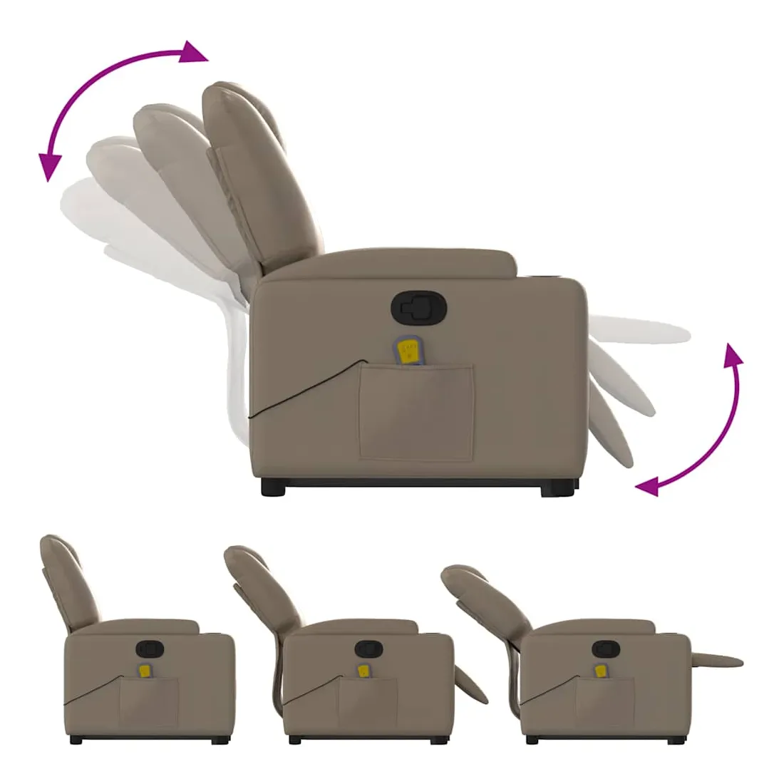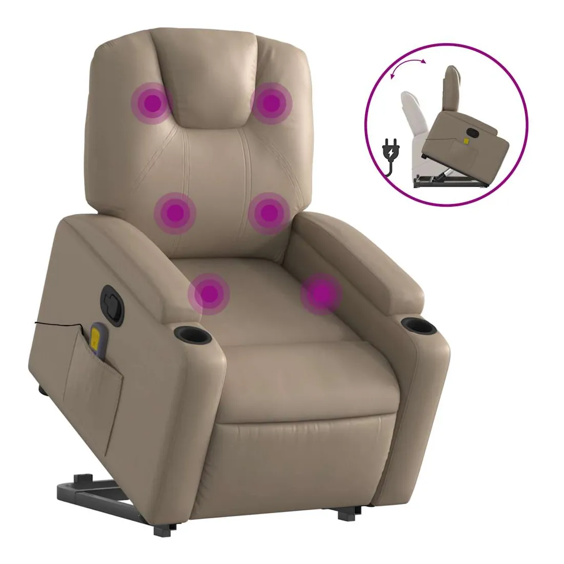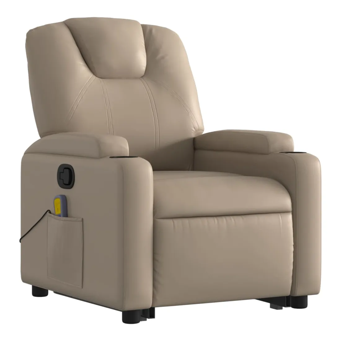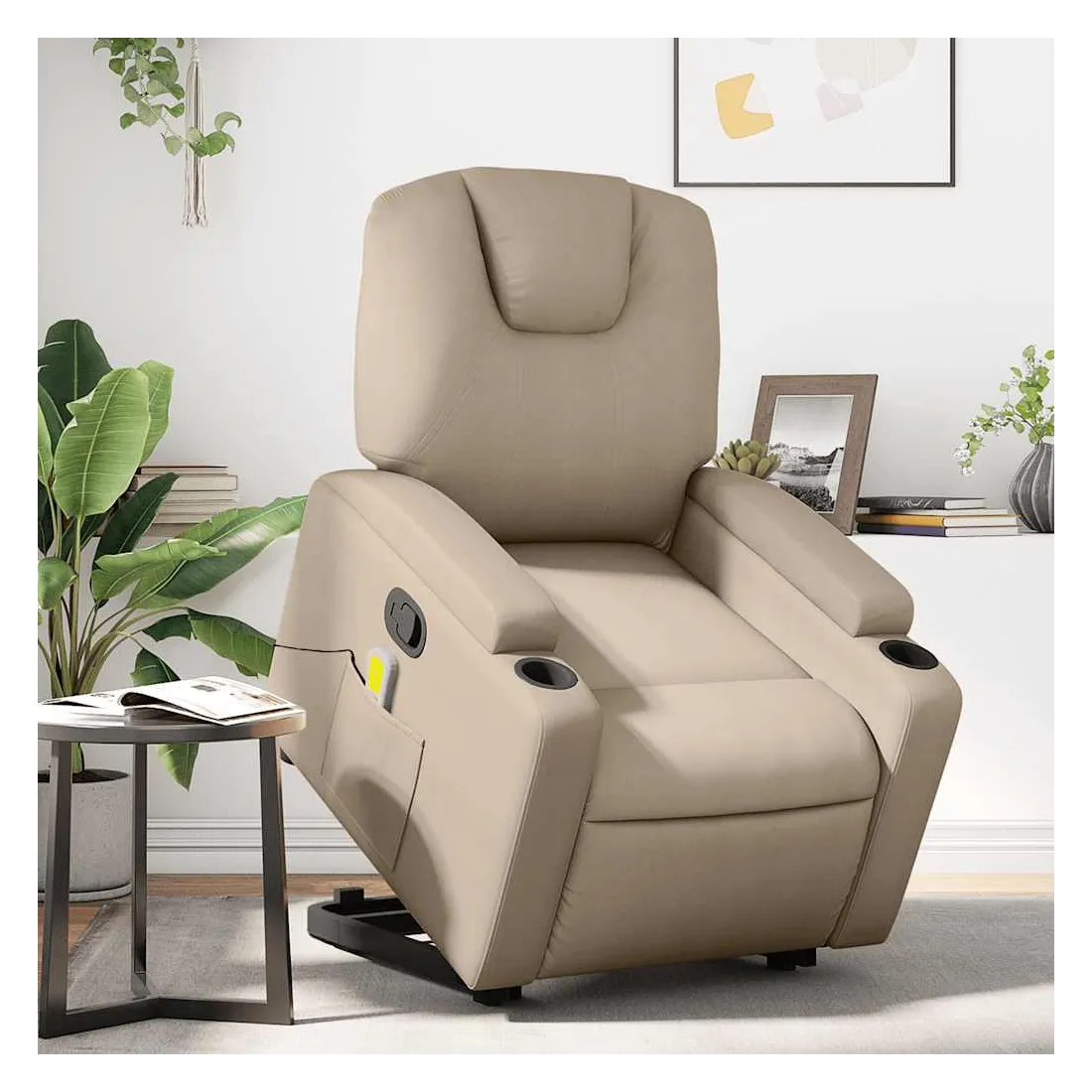 Asseyez-vous et détendez-vous dans ce fauteuil inclinable de massage très confortable ! Fonction de levage électrique : ce fauteuil inclinable pour personnes âgées est équipé d'un moteur électrique pour la fonction de levage. Grâce à la fonction qui pousse toute la chaise vers le haut, vous pouvez facilement vous tenir debout sans stresser votre dos et vos genoux en appuyant simplement sur le bouton.Fonction d'inclinaison manuelle : ce fauteuil inclinable est doté d'une poignée du côté droit. Vous pouvez régler manuellement le repose-pieds et le dossier dans n'importe quelle position selon votre confort en tirant simplement sur la poignée. Cette fonction permet une inclinaison maximale de 135 degrés. De plus, le dossier peut revenir rapidement à sa position d'origine en tirant simplement sur la poignée.Fonction de vibration : les 6 points de massage vous permettent de faire l'expérience d'un massage mieux ciblé. De plus, la télécommande incluse vous permet de choisir différents programmes de massage. La fonction de massage est alimentée par le connecteur USB qui nécessite une source d'alimentation USB certifiée de 5 V (non fournie).Expérience de siège confortable : le siège, le dossier et les larges accoudoirs rembourrés épais recouverts de similicuir procurent une sensation confortable, vous faisant vous sentir enlacé lorsque vous êtes assis. Le similicuir est un matériau très résistant. Il est résistant aux taches, ce qui le rend facile à nettoyer avec un chiffon humide. La surface lisse donne également un aspect luxueux et la beauté du cuir véritable.Porte-gobelets et poche latérale pratiques : ce fauteuil dispose de deux porte-gobelets pratiques pour vos boissons et d'une poche latérale pour votre télécommande ou pour garder vos objets essentiels à portée de main.Cadre solide et stable : le cadre en bois et en métal offre une structure solide et une grande stabilité. Ce fauteuil inclinable est confortable et durable.