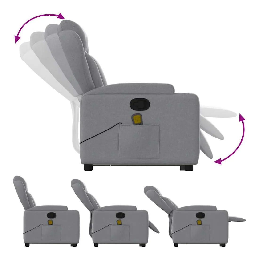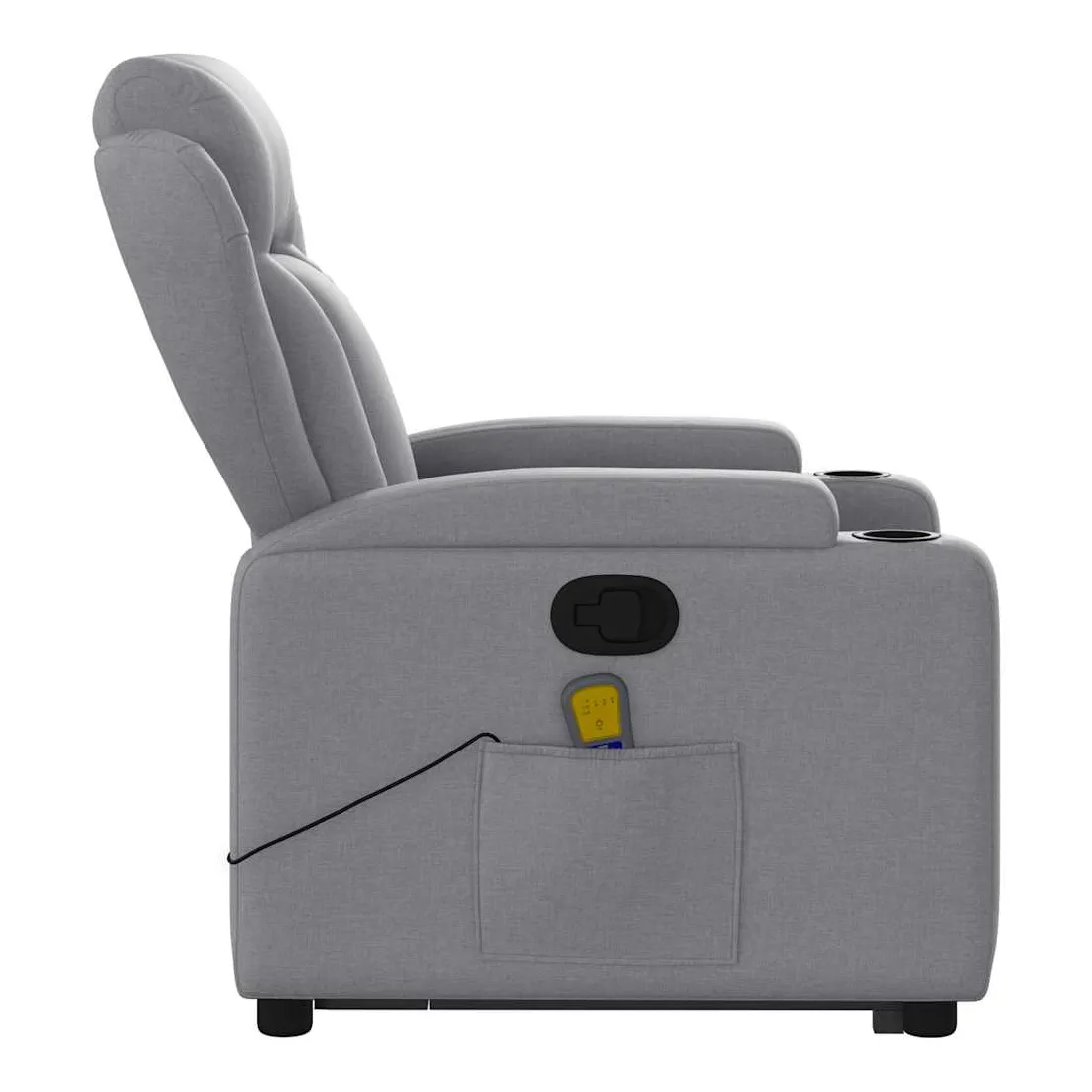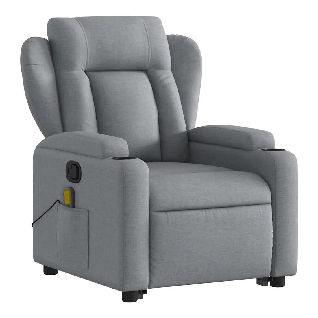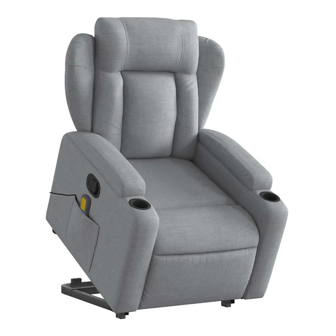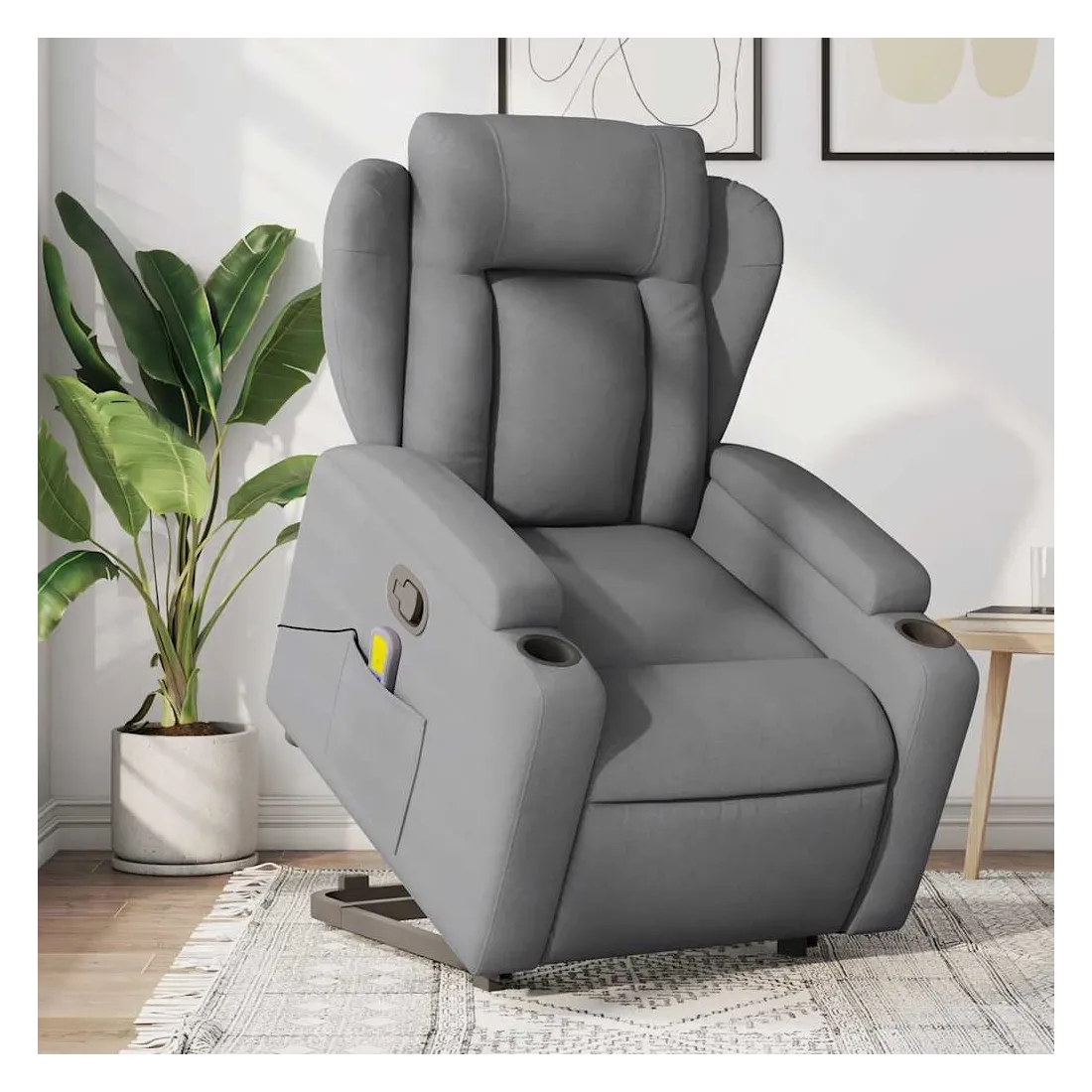 Asseyez-vous et détendez-vous dans ce fauteuil inclinable de massage très confortable ! Fonction de levage électrique : ce fauteuil inclinable pour personnes âgées est équipé d'un moteur électrique pour la fonction de levage. Grâce à la fonction qui pousse toute la chaise vers le haut, vous pouvez facilement vous tenir debout sans stresser votre dos et vos genoux en appuyant simplement sur le bouton.Fonction d'inclinaison manuelle : ce fauteuil inclinable est doté d'une poignée du côté droit. Vous pouvez régler manuellement le repose-pieds et le dossier dans n'importe quelle position selon votre confort en tirant simplement sur la poignée. Cette fonction permet une inclinaison maximale de 135 degrés. De plus, le dossier peut revenir rapidement à sa position d'origine en tirant simplement sur la poignée.Fonction de vibration : les 6 points de massage vous permettent de faire l'expérience d'un massage mieux ciblé. De plus, la télécommande incluse vous permet de choisir différents programmes de massage. La fonction de massage est alimentée par le connecteur USB qui nécessite une source d'alimentation USB certifiée de 5 V (non fournie).Expérience d'assise confortable : le siège, le dossier et les larges accoudoirs bien rembourrés recouverts de tissu procurent une sensation confortable et chaleureuse, vous permettant de vous sentir enveloppé lorsque vous êtes assis. Le tissu présente un aspect simple et épuré et est respirant et durable.Porte-gobelets et poche latérale pratiques : ce fauteuil dispose de deux porte-gobelets pratiques pour vos boissons et d'une poche latérale pour garder vos objets essentiels à portée de main.Cadre solide et stable : le cadre en bois et en métal offre une structure solide et une grande stabilité. Ce fauteuil inclinable est confortable et durable.