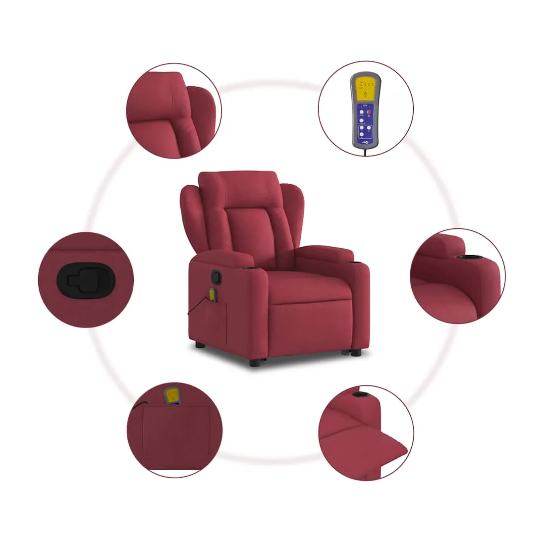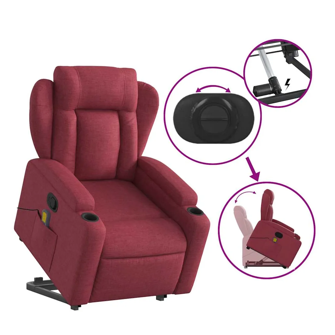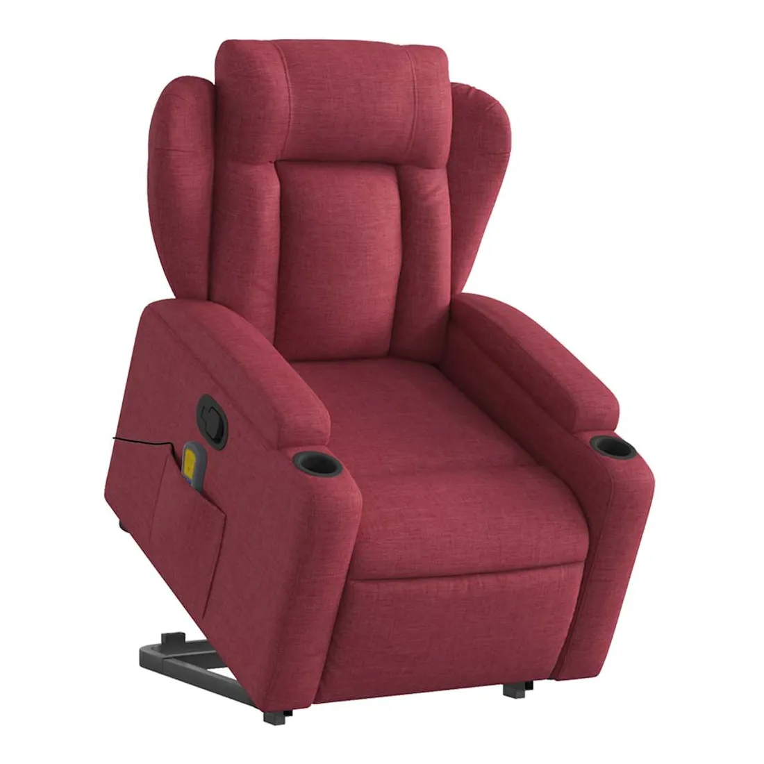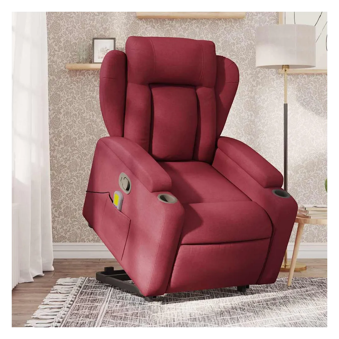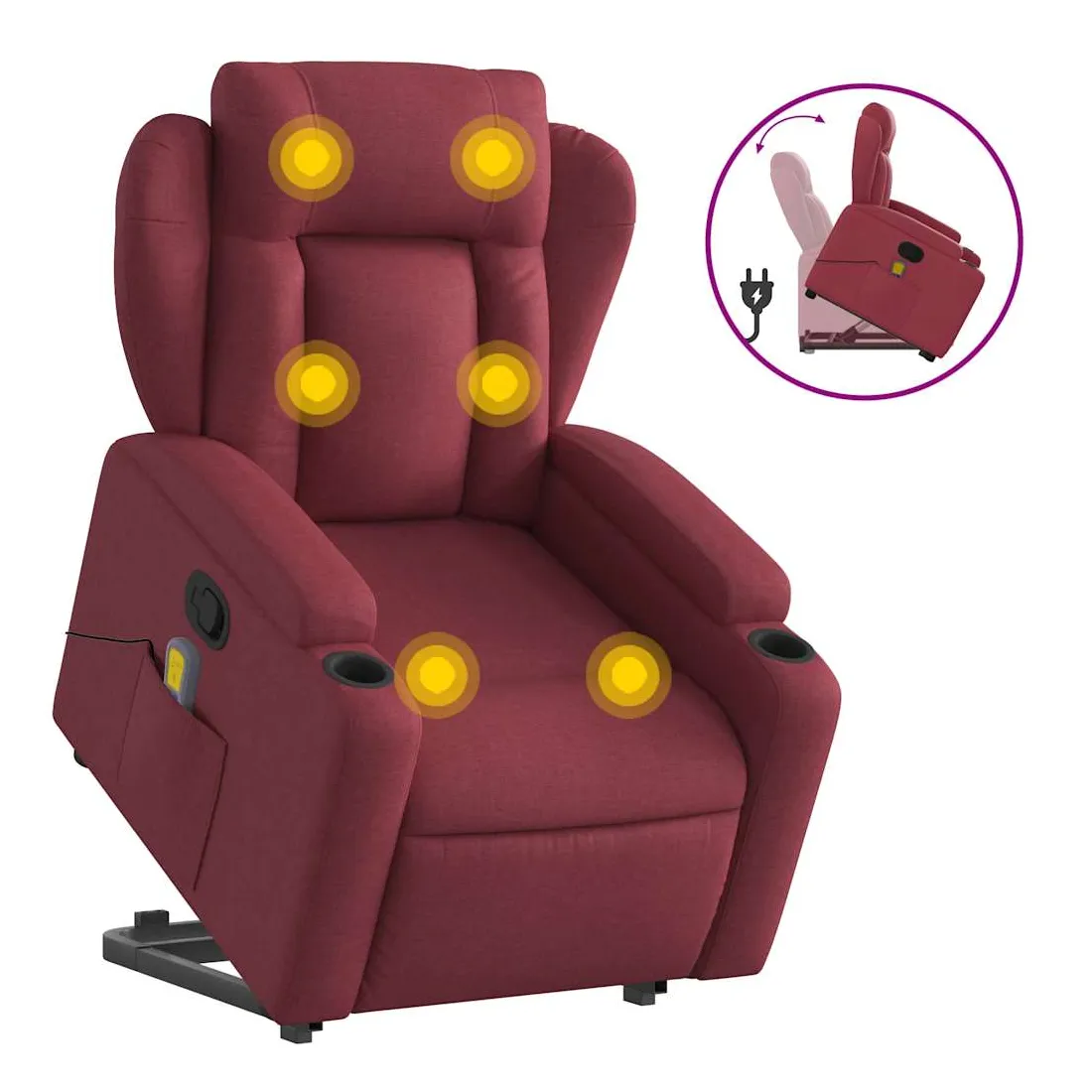 Asseyez-vous et détendez-vous dans ce fauteuil inclinable de massage très confortable ! Fonction de levage électrique : ce fauteuil inclinable pour personnes âgées est équipé d'un moteur électrique pour la fonction de levage. Grâce à la fonction qui pousse toute la chaise vers le haut, vous pouvez facilement vous tenir debout sans stresser votre dos et vos genoux en appuyant simplement sur le bouton.Fonction d'inclinaison manuelle : ce fauteuil inclinable est doté d'une poignée du côté droit. Vous pouvez régler manuellement le repose-pieds et le dossier dans n'importe quelle position selon votre confort en tirant simplement sur la poignée. Cette fonction permet une inclinaison maximale de 135 degrés. De plus, le dossier peut revenir rapidement à sa position d'origine en tirant simplement sur la poignée.Fonction de vibration : les 6 points de massage vous permettent de faire l'expérience d'un massage mieux ciblé. De plus, la télécommande incluse vous permet de choisir différents programmes de massage. La fonction de massage est alimentée par le connecteur USB qui nécessite une source d'alimentation USB certifiée de 5 V (non fournie).Expérience d'assise confortable : le siège, le dossier et les larges accoudoirs bien rembourrés recouverts de tissu procurent une sensation confortable et chaleureuse, vous permettant de vous sentir enveloppé lorsque vous êtes assis. Le tissu présente un aspect simple et épuré et est respirant et durable.Porte-gobelets et poche latérale pratiques : ce fauteuil dispose de deux porte-gobelets pratiques pour vos boissons et d'une poche latérale pour garder vos objets essentiels à portée de main.Cadre solide et stable : le cadre en bois et en métal offre une structure solide et une grande stabilité. Ce fauteuil inclinable est confortable et durable.