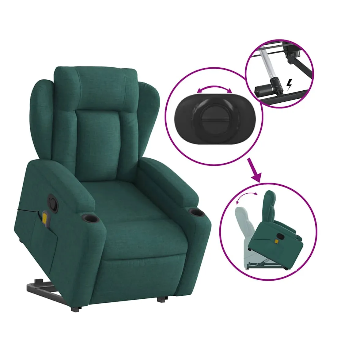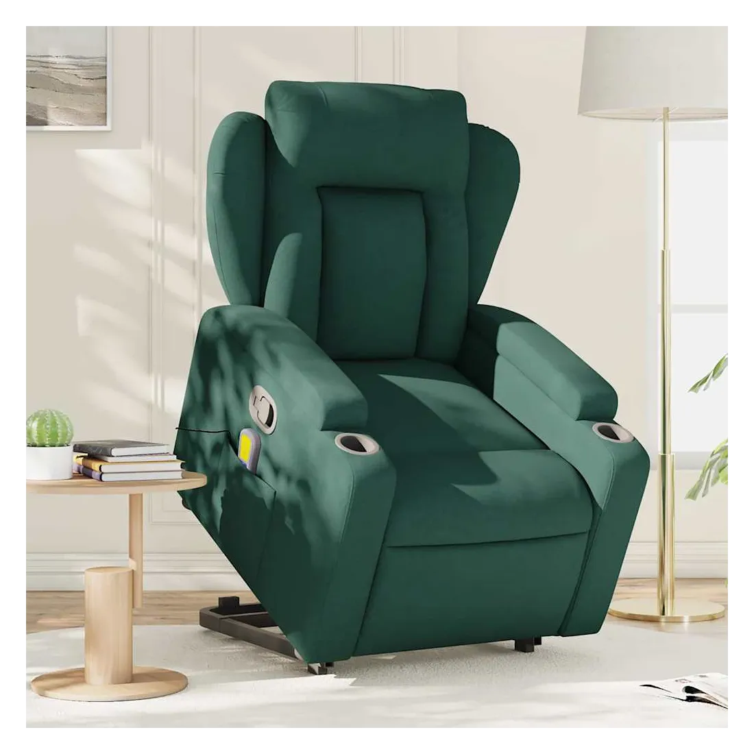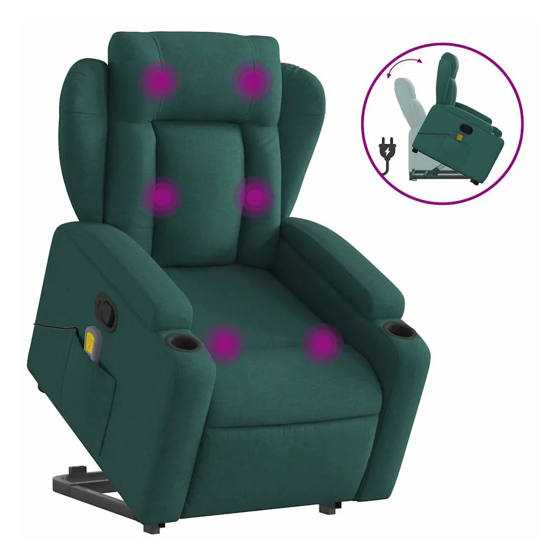 Asseyez-vous et détendez-vous dans ce fauteuil inclinable de massage très confortable ! Fonction de levage électrique : ce fauteuil inclinable pour personnes âgées est équipé d'un moteur électrique pour la fonction de levage. Grâce à la fonction qui pousse toute la chaise vers le haut, vous pouvez facilement vous tenir debout sans stresser votre dos et vos genoux en appuyant simplement sur le bouton.Fonction d'inclinaison manuelle : ce fauteuil inclinable est doté d'une poignée du côté droit. Vous pouvez régler manuellement le repose-pieds et le dossier dans n'importe quelle position selon votre confort en tirant simplement sur la poignée. Cette fonction permet une inclinaison maximale de 135 degrés. De plus, le dossier peut revenir rapidement à sa position d'origine en tirant simplement sur la poignée.Fonction de vibration : les 6 points de massage vous permettent de faire l'expérience d'un massage mieux ciblé. De plus, la télécommande incluse vous permet de choisir différents programmes de massage. La fonction de massage est alimentée par le connecteur USB qui nécessite une source d'alimentation USB certifiée de 5 V (non fournie).Expérience d'assise confortable : le siège, le dossier et les larges accoudoirs bien rembourrés recouverts de tissu procurent une sensation confortable et chaleureuse, vous permettant de vous sentir enveloppé lorsque vous êtes assis. Le tissu présente un aspect simple et épuré et est respirant et durable.Porte-gobelets et poche latérale pratiques : ce fauteuil dispose de deux porte-gobelets pratiques pour vos boissons et d'une poche latérale pour garder vos objets essentiels à portée de main.Cadre solide et stable : le cadre en bois et en métal offre une structure solide et une grande stabilité. Ce fauteuil inclinable est confortable et durable.