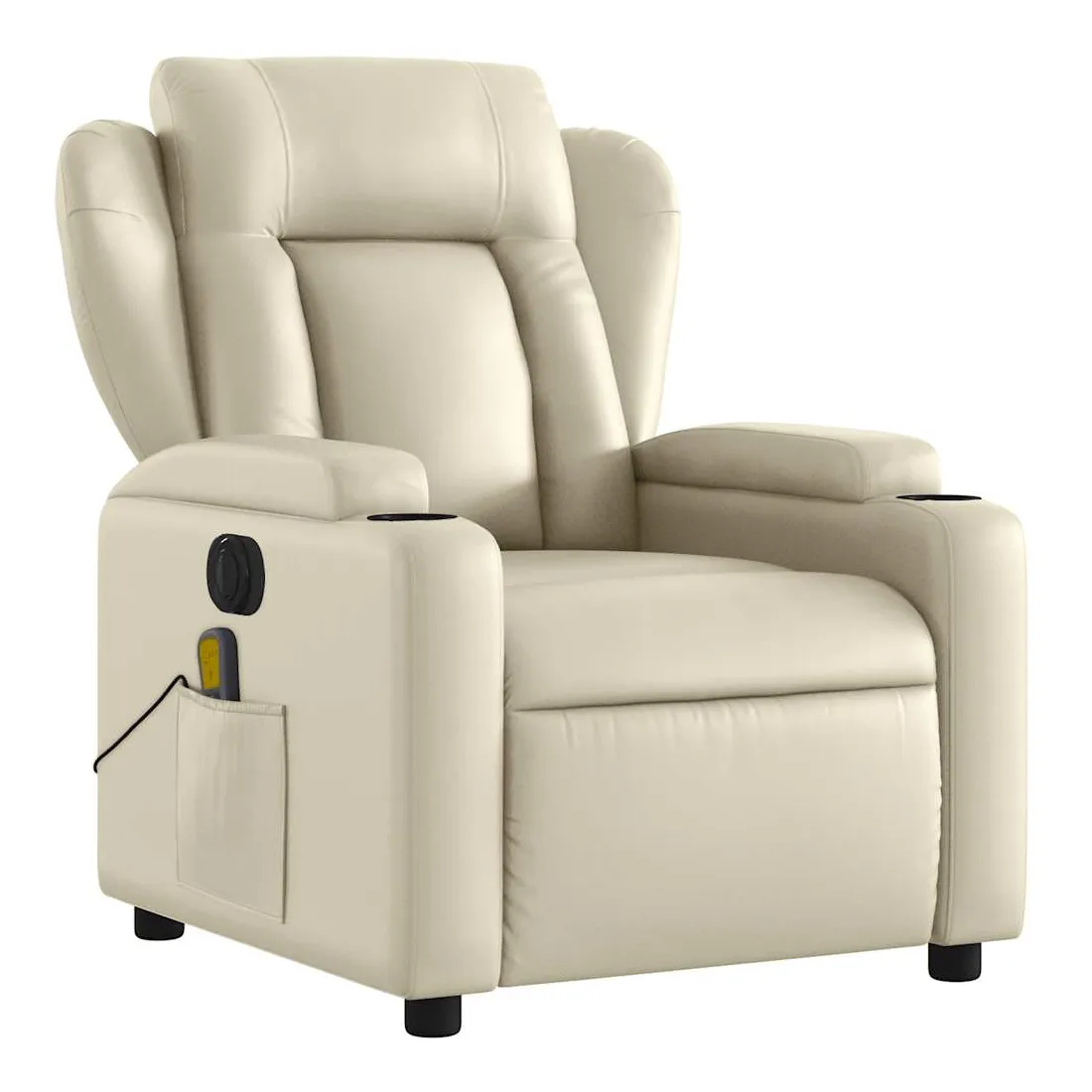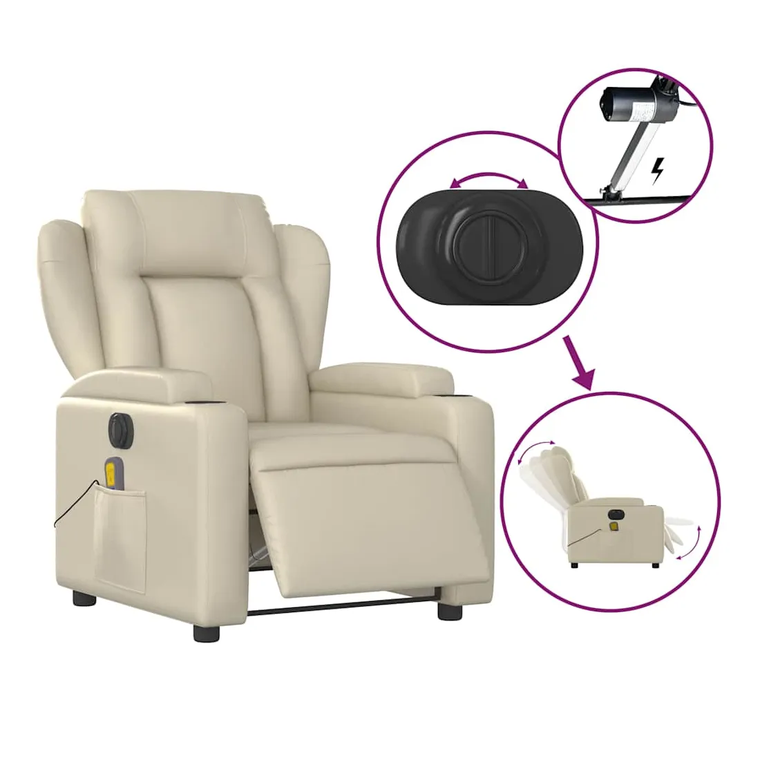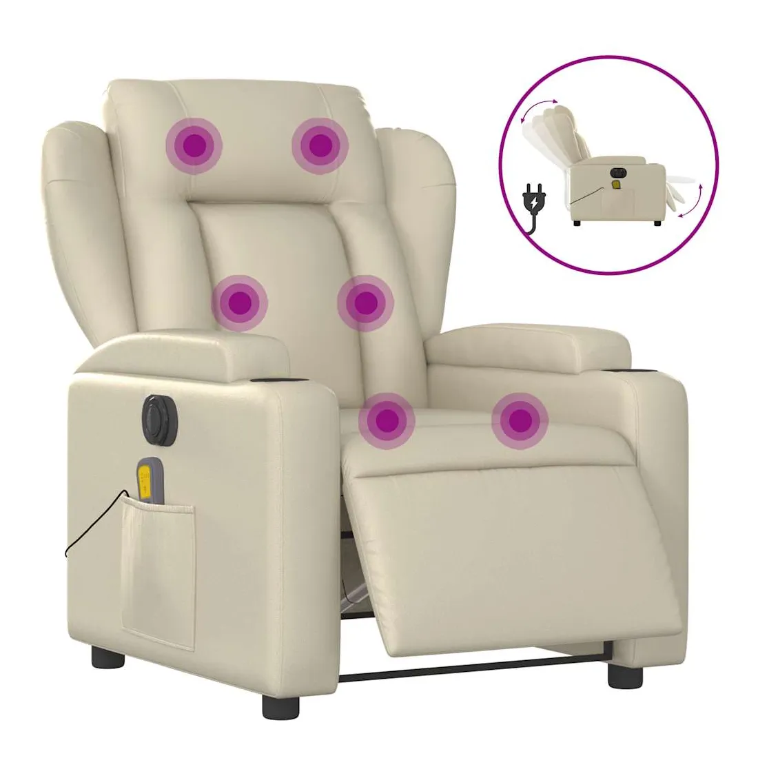 Asseyez-vous et détendez-vous dans ce fauteuil inclinable de massage électrique très confortable ! Fonction d'inclinaison électrique : ce fauteuil inclinable est équipé d'un moteur électrique qui permet de régler automatiquement le repose-pied et le dossier dans n'importe quelle position, selon votre confort, en appuyant simplement sur le bouton situé sur le côté du fauteuil. Cette fonction permet une inclinaison maximale de 135 degrés. En outre, le dossier peut revenir automatiquement à sa position d'origine par une simple pression sur le bouton.Fonction de vibration : les 6 points de massage vous permettent de faire l'expérience d'un massage mieux ciblé. De plus, la télécommande incluse vous permet de choisir différents programmes de massage. La fonction de massage est alimentée par le connecteur USB qui nécessite une source d'alimentation USB certifiée de 5 V (non fournie).Expérience de siège confortable : le siège, le dossier et les larges accoudoirs rembourrés épais recouverts de similicuir procurent une sensation confortable, vous faisant vous sentir enlacé lorsque vous êtes assis. Le similicuir est un matériau très résistant. Il est résistant aux taches, ce qui le rend facile à nettoyer avec un chiffon humide. La surface lisse donne également un aspect luxueux et la beauté du cuir véritable.Porte-gobelets et poche latérale pratiques : ce fauteuil dispose de deux porte-gobelets pratiques pour vos boissons et d'une poche latérale pour garder vos objets essentiels à portée de main.Cadre solide et stable : le cadre en bois et en métal offre une structure solide et une grande stabilité. Ce fauteuil inclinable est confortable et durable.