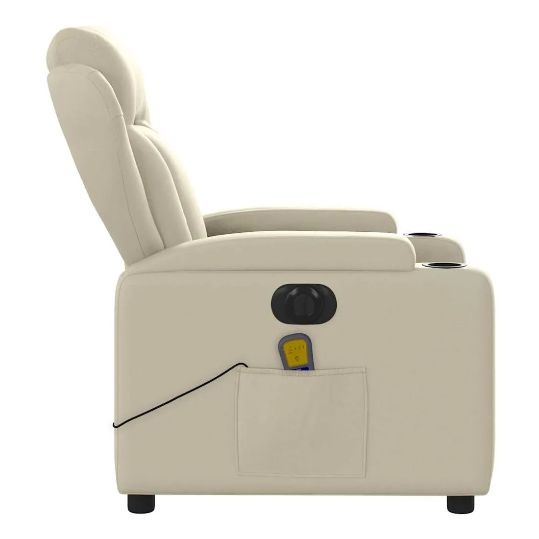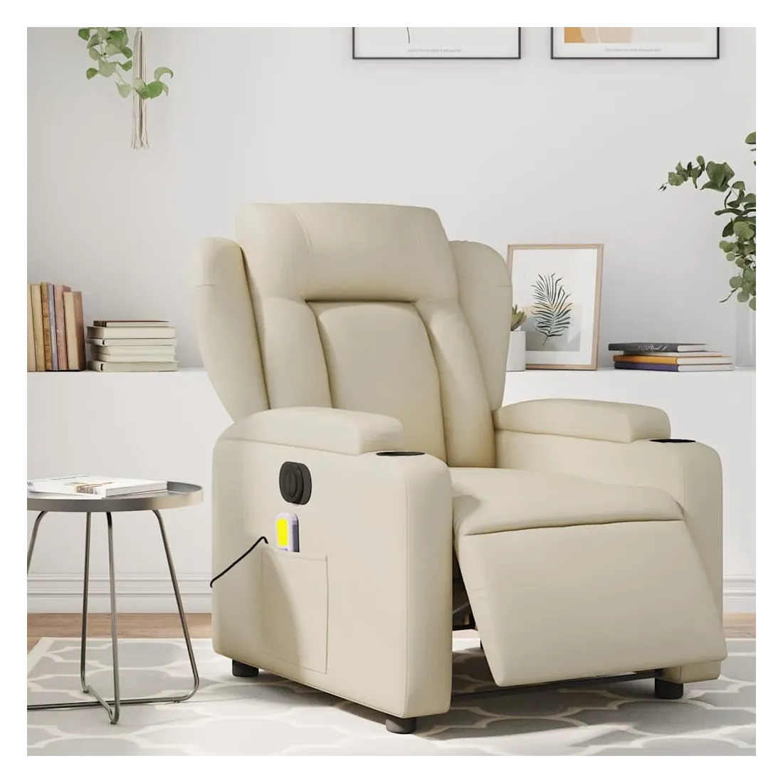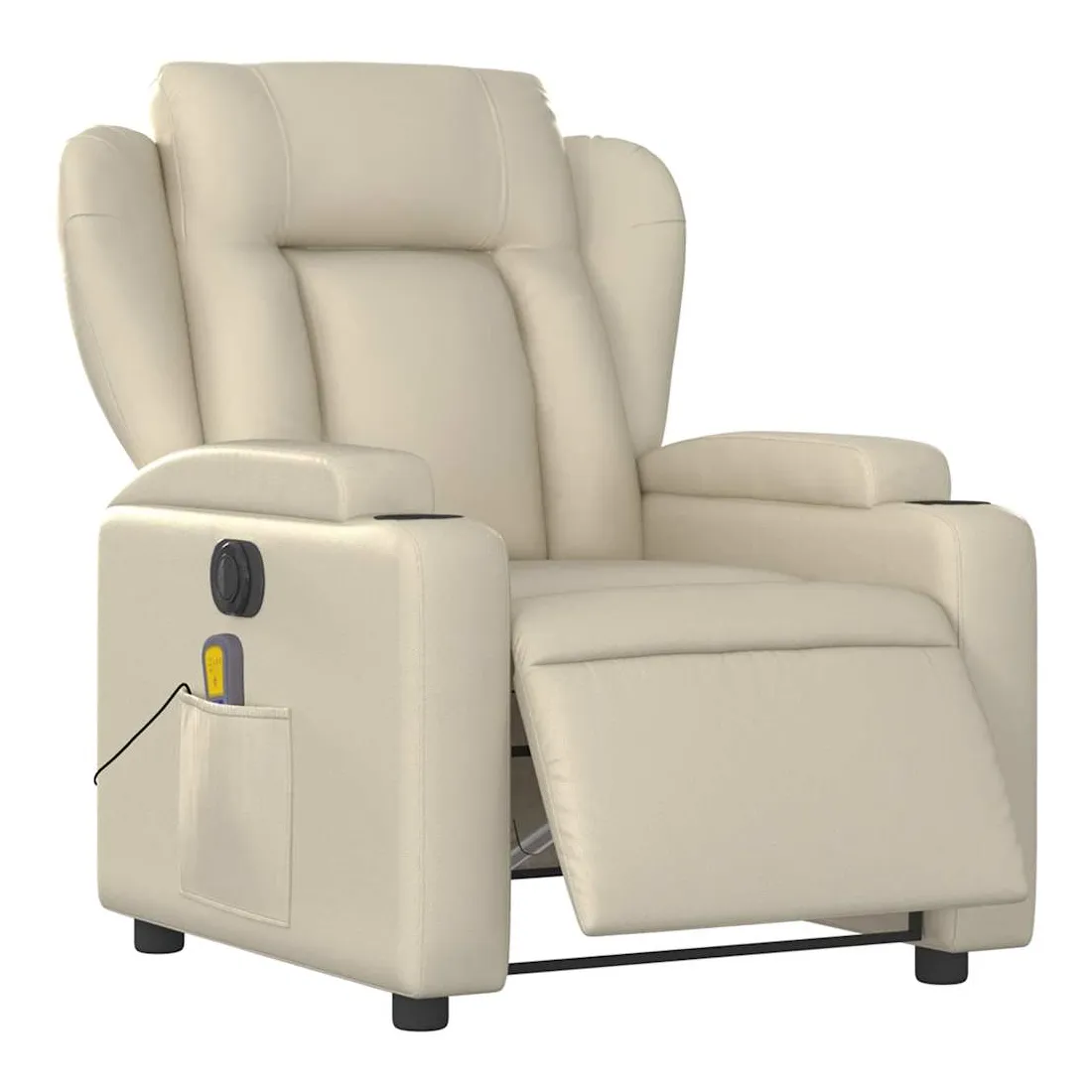 Asseyez-vous et détendez-vous dans ce fauteuil inclinable de massage électrique très confortable ! Fonction d'inclinaison électrique : ce fauteuil inclinable est équipé d'un moteur électrique qui permet de régler automatiquement le repose-pied et le dossier dans n'importe quelle position, selon votre confort, en appuyant simplement sur le bouton situé sur le côté du fauteuil. Cette fonction permet une inclinaison maximale de 135 degrés. En outre, le dossier peut revenir automatiquement à sa position d'origine par une simple pression sur le bouton.Fonction de vibration : les 6 points de massage vous permettent de faire l'expérience d'un massage mieux ciblé. De plus, la télécommande incluse vous permet de choisir différents programmes de massage. La fonction de massage est alimentée par le connecteur USB qui nécessite une source d'alimentation USB certifiée de 5 V (non fournie).Expérience de siège confortable : le siège, le dossier et les larges accoudoirs rembourrés épais recouverts de similicuir procurent une sensation confortable, vous faisant vous sentir enlacé lorsque vous êtes assis. Le similicuir est un matériau très résistant. Il est résistant aux taches, ce qui le rend facile à nettoyer avec un chiffon humide. La surface lisse donne également un aspect luxueux et la beauté du cuir véritable.Porte-gobelets et poche latérale pratiques : ce fauteuil dispose de deux porte-gobelets pratiques pour vos boissons et d'une poche latérale pour garder vos objets essentiels à portée de main.Cadre solide et stable : le cadre en bois et en métal offre une structure solide et une grande stabilité. Ce fauteuil inclinable est confortable et durable.