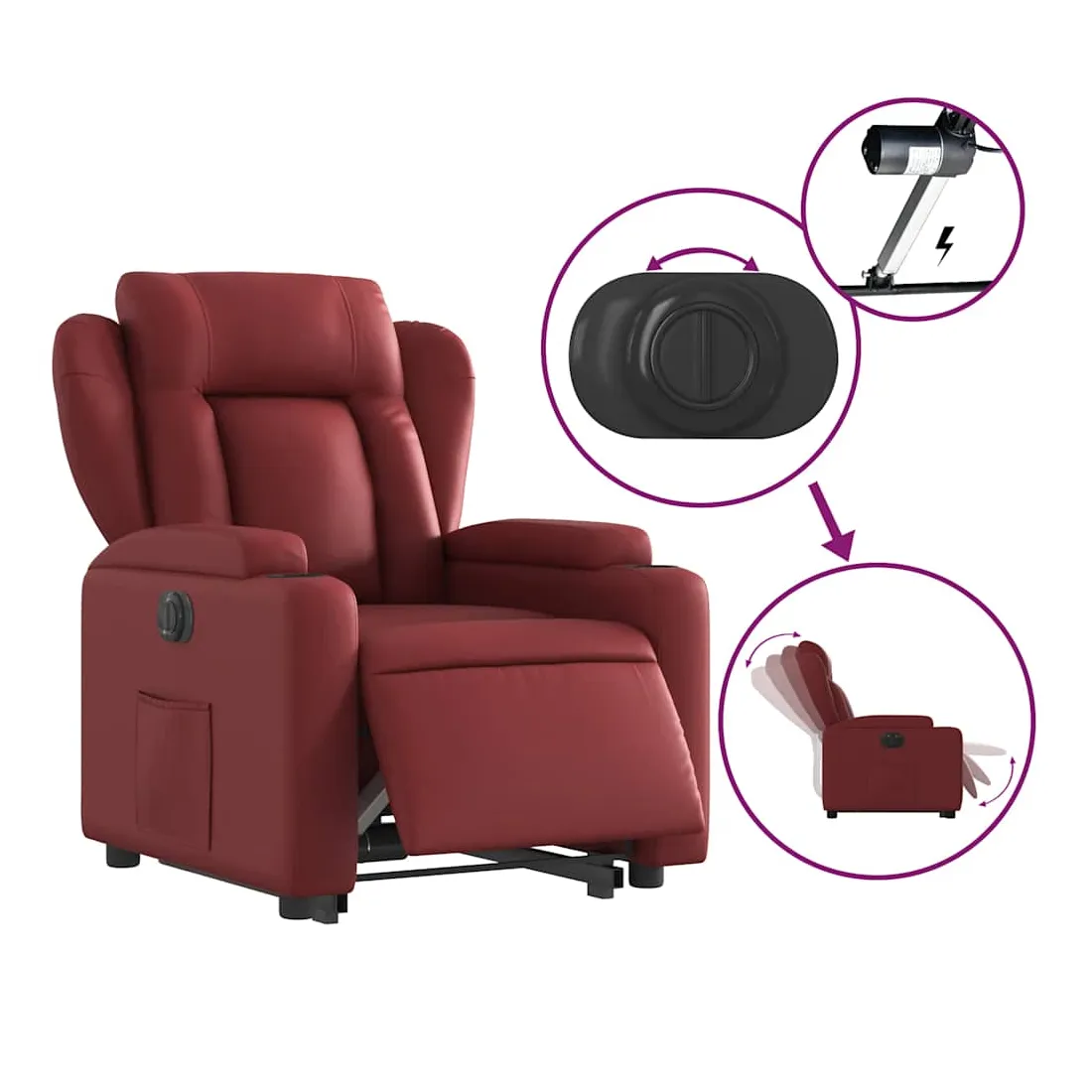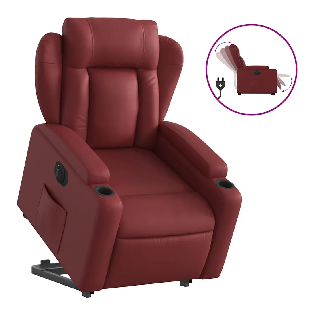 Asseyez-vous et détendez-vous dans ce fauteuil inclinable électrique très confortable ! Fonction de levage électrique : ce fauteuil inclinable pour personnes âgées est équipé d'un moteur électrique pour la fonction de levage. Grâce à la fonction qui pousse toute la chaise vers le haut, vous pouvez facilement vous tenir debout sans stresser votre dos et vos genoux en appuyant simplement sur le bouton.Fonction d'inclinaison électrique : ce fauteuil inclinable est également équipé d'un moteur électrique qui permet de régler automatiquement le repose-pied et le dossier dans n'importe quelle position, selon votre confort, en appuyant simplement sur le bouton situé sur le côté du fauteuil. Cette fonction permet une inclinaison maximale de 135 degrés. En outre, le dossier peut revenir automatiquement à sa position d'origine par une simple pression sur le bouton.Expérience de siège confortable : le siège, le dossier et les larges accoudoirs rembourrés épais recouverts de similicuir procurent une sensation confortable, vous faisant vous sentir enlacé lorsque vous êtes assis. Le similicuir est un matériau très résistant. Il est résistant aux taches, ce qui le rend facile à nettoyer avec un chiffon humide. La surface lisse donne également un aspect luxueux et la beauté du cuir véritable.Porte-gobelets et poche latérale pratiques : ce fauteuil dispose de deux porte-gobelets pratiques pour vos boissons et d'une poche latérale pour garder vos objets essentiels à portée de main.Cadre solide et stable : le cadre en bois et en métal offre une structure solide et une grande stabilité. Ce fauteuil inclinable est confortable et durable.