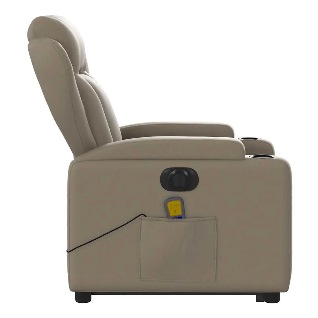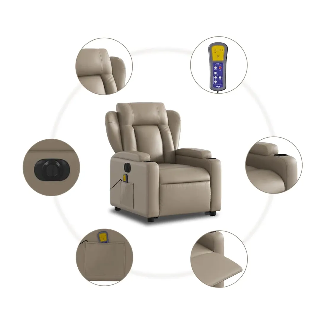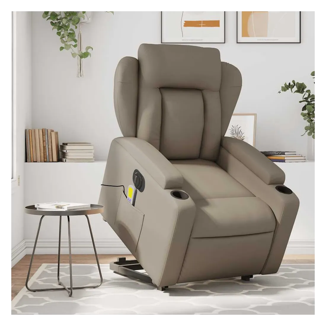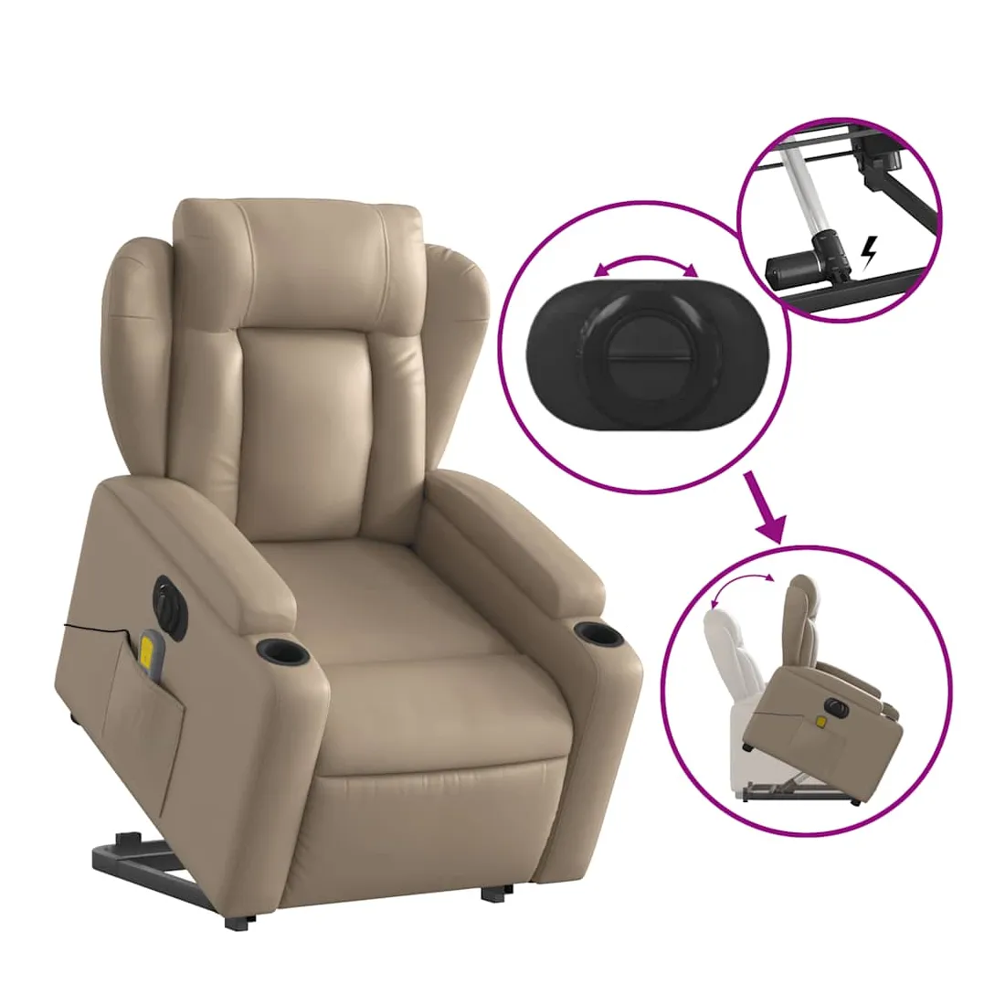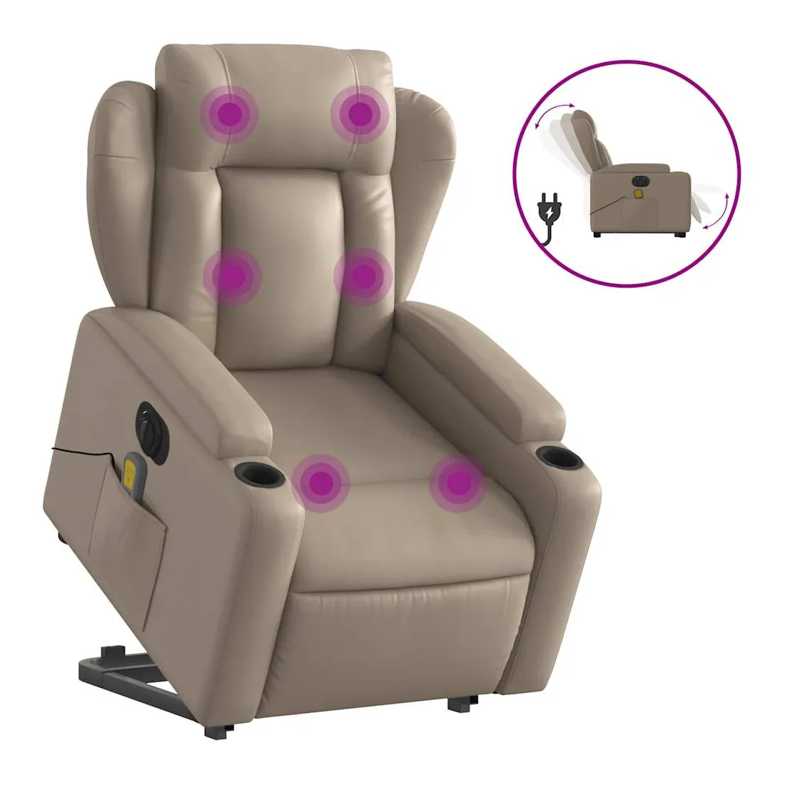 Asseyez-vous et détendez-vous dans ce fauteuil inclinable de massage électrique très confortable ! Fonction de levage électrique : ce fauteuil inclinable pour personnes âgées est équipé d'un moteur électrique pour la fonction de levage. Grâce à la fonction qui pousse toute la chaise vers le haut, vous pouvez facilement vous tenir debout sans stresser votre dos et vos genoux en appuyant simplement sur le bouton.Fonction d'inclinaison électrique : ce fauteuil inclinable est également équipé d'un moteur électrique qui permet de régler automatiquement le repose-pied et le dossier dans n'importe quelle position, selon votre confort, en appuyant simplement sur le bouton situé sur le côté du fauteuil. Cette fonction permet une inclinaison maximale de 135 degrés. En outre, le dossier peut revenir automatiquement à sa position d'origine par une simple pression sur le bouton.Fonction de vibration : les 6 points de massage vous permettent de faire l'expérience d'un massage mieux ciblé. De plus, la télécommande incluse vous permet de choisir différents programmes de massage. La fonction de massage est alimentée par le connecteur USB qui nécessite une source d'alimentation USB certifiée de 5 V (non fournie).Expérience de siège confortable : le siège, le dossier et les larges accoudoirs rembourrés épais recouverts de similicuir procurent une sensation confortable, vous faisant vous sentir enlacé lorsque vous êtes assis. Le similicuir est un matériau très résistant. Il est résistant aux taches, ce qui le rend facile à nettoyer avec un chiffon humide. La surface lisse donne également un aspect luxueux et la beauté du cuir véritable.Porte-gobelets et poche latérale pratiques : ce fauteuil dispose de deux porte-gobelets pratiques pour vos boissons et d'une poche latérale pour garder vos objets essentiels à portée de main.Cadre solide et stable : le cadre en bois et en métal offre une structure solide et une grande stabilité. Ce fauteuil inclinable est confortable et durable.