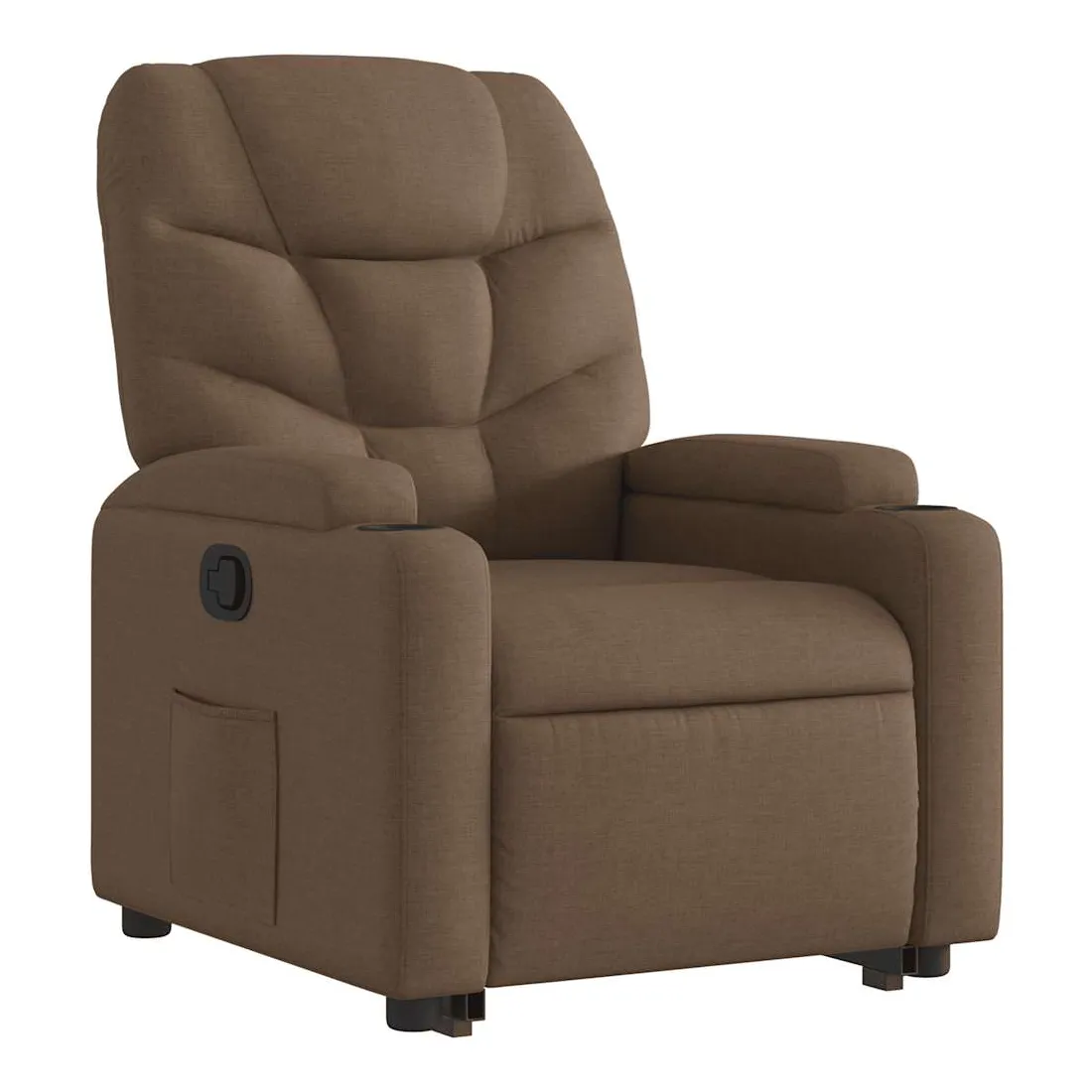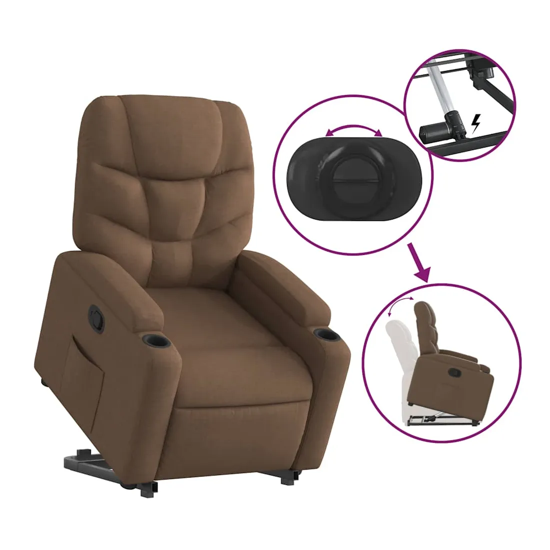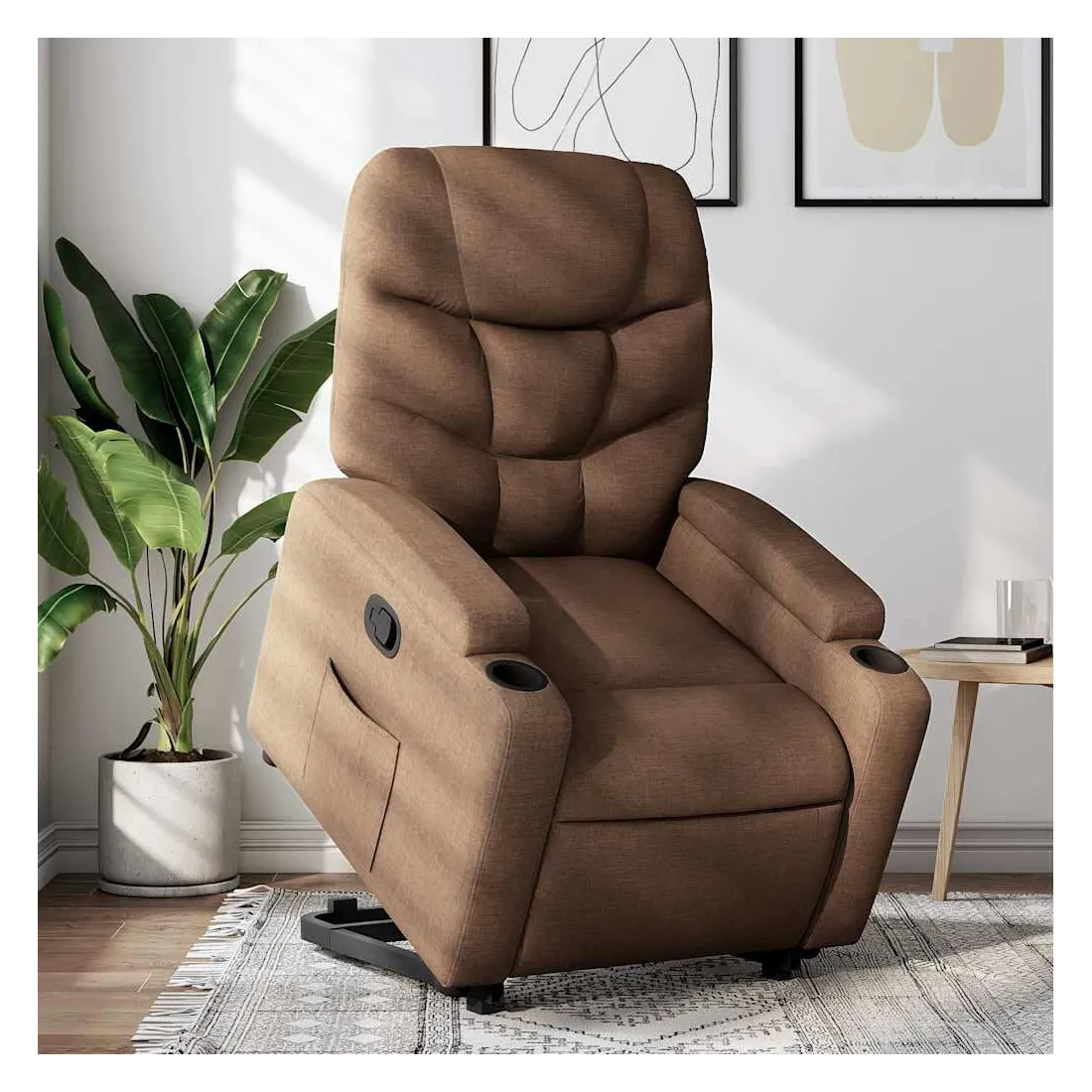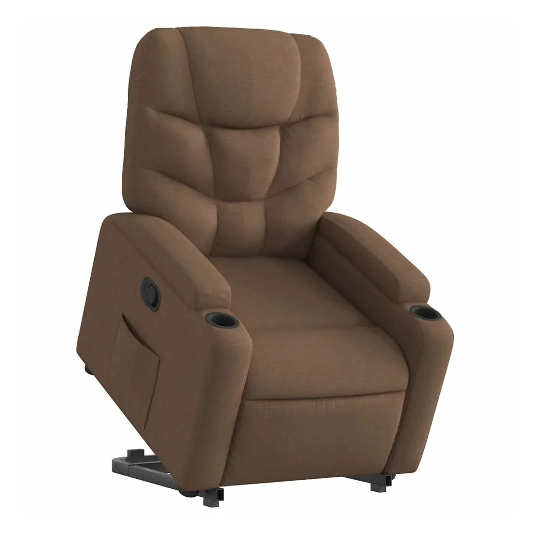 Asseyez-vous et détendez-vous dans ce fauteuil inclinable très confortable ! Fonction de levage électrique : ce fauteuil inclinable pour personnes âgées est équipé d'un moteur électrique pour la fonction de levage. Grâce à la fonction qui pousse toute la chaise vers le haut, vous pouvez facilement vous tenir debout sans stresser votre dos et vos genoux en appuyant simplement sur le bouton.Fonction d'inclinaison manuelle : ce fauteuil inclinable est doté d'une poignée du côté droit. Vous pouvez régler manuellement le repose-pieds et le dossier dans n'importe quelle position selon votre confort en tirant simplement sur la poignée. Cette fonction permet une inclinaison maximale de 135 degrés. De plus, le dossier peut revenir rapidement à sa position d'origine en tirant simplement sur la poignée.Expérience d'assise confortable : le siège, le dossier et les larges accoudoirs bien rembourrés recouverts de tissu procurent une sensation confortable et chaleureuse, vous permettant de vous sentir enveloppé lorsque vous êtes assis. Le tissu présente un aspect simple et épuré et est respirant et durable.Porte-gobelets et poche latérale pratiques : ce fauteuil dispose de deux porte-gobelets pratiques pour vos boissons et d'une poche latérale pour garder vos objets essentiels à portée de main.Cadre solide et stable : le cadre en bois et en métal offre une structure solide et une grande stabilité. Ce fauteuil inclinable est confortable et durable.