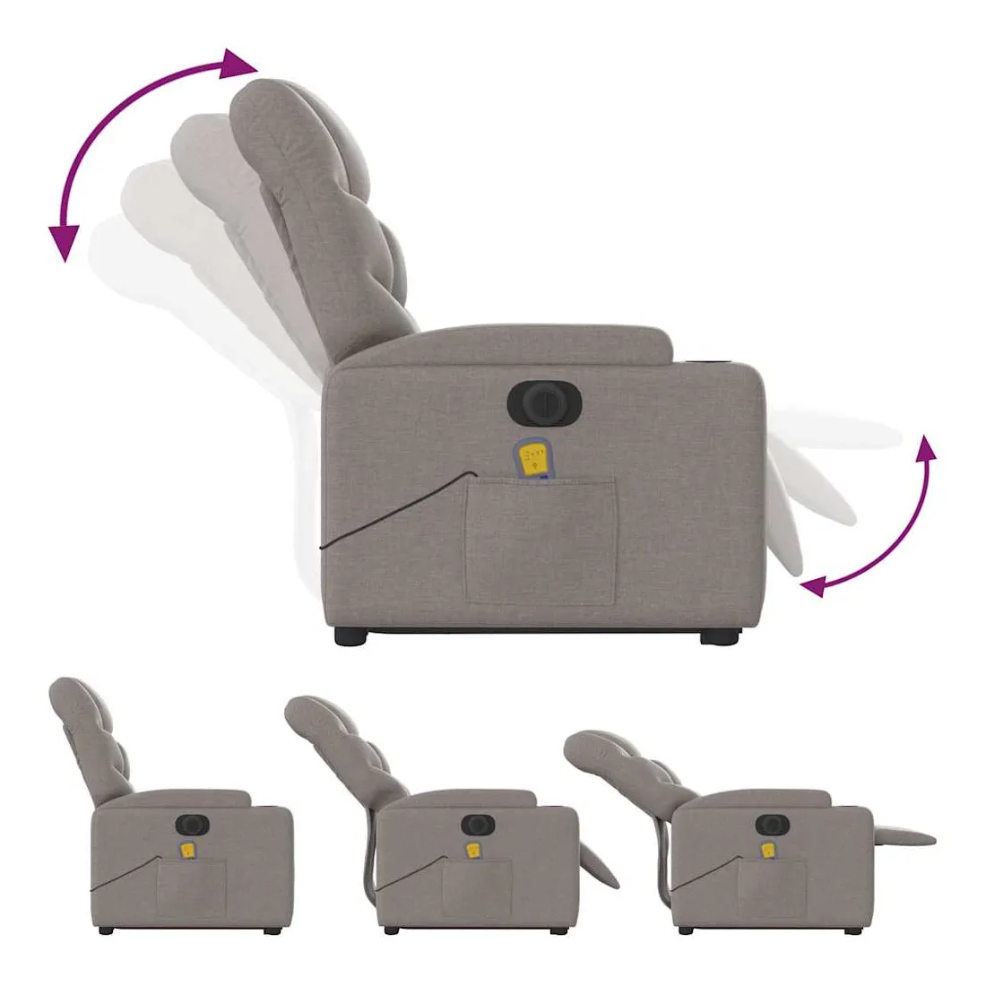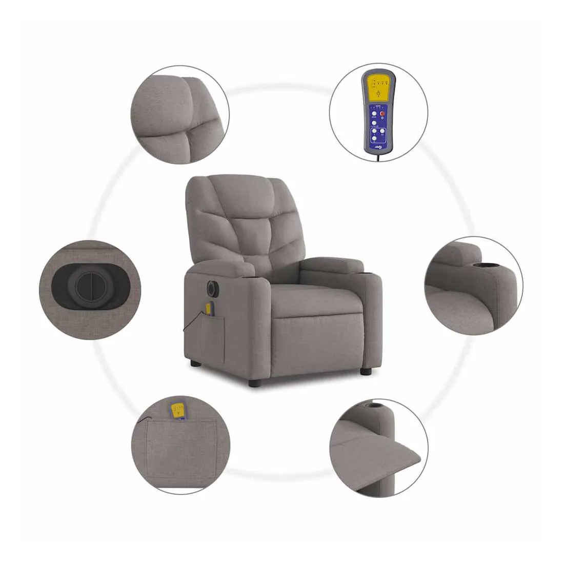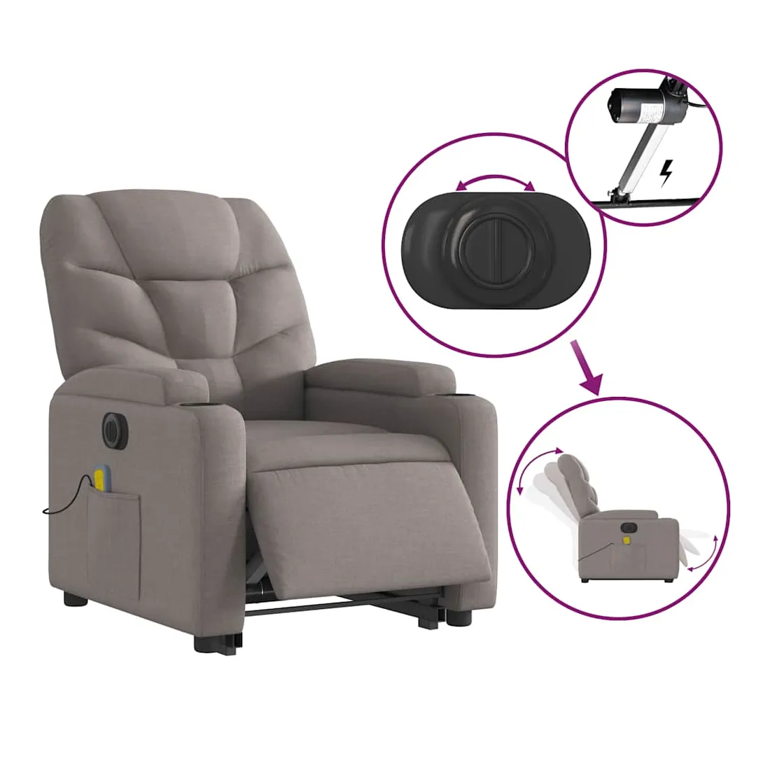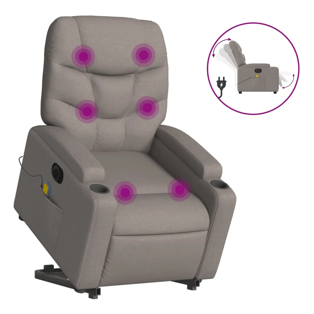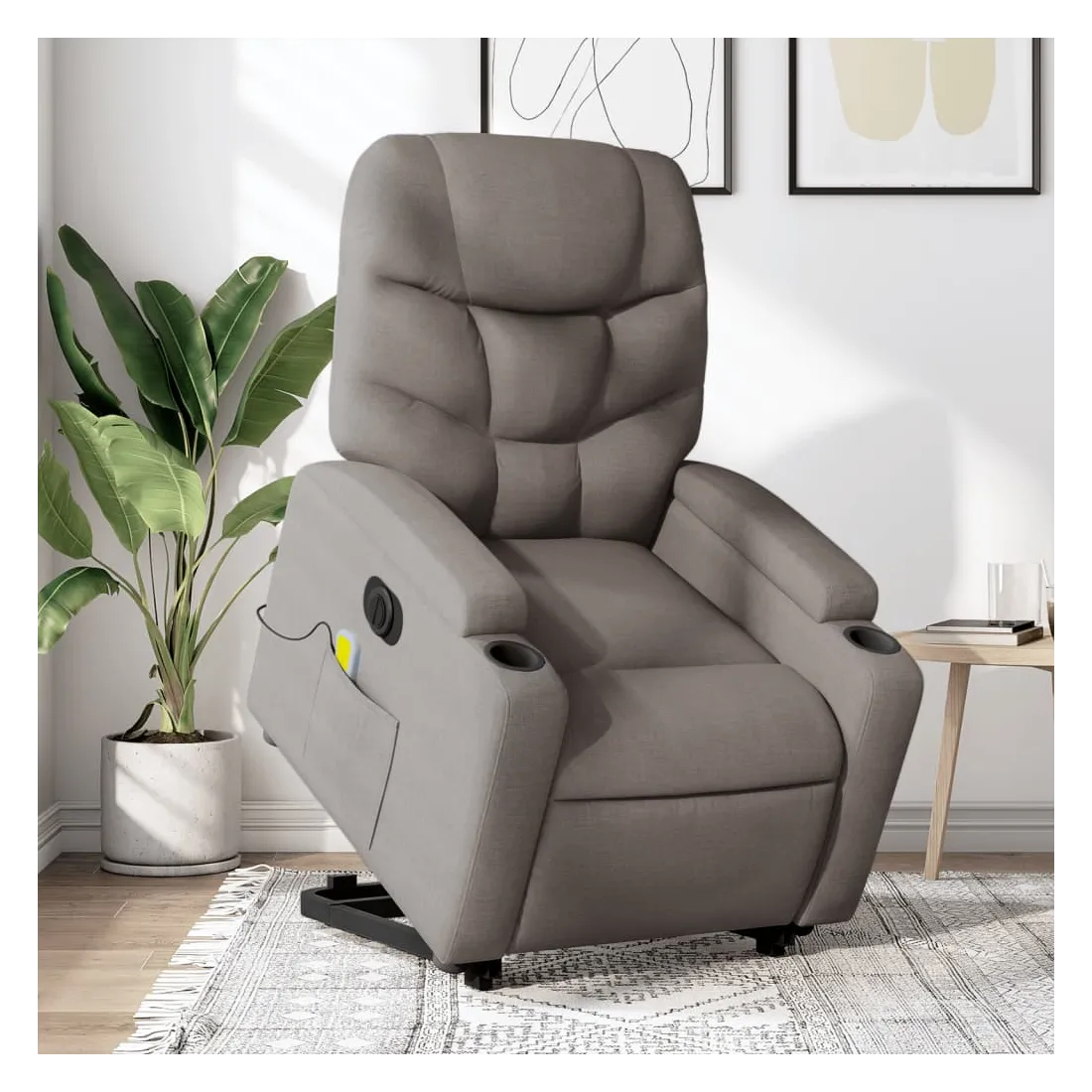Asseyez-vous et détendez-vous dans ce fauteuil inclinable de massage électrique très confortable ! Fonction de levage électrique : ce fauteuil inclinable pour personnes âgées est équipé d'un moteur électrique pour la fonction de levage. Grâce à la fonction qui pousse toute la chaise vers le haut, vous pouvez facilement vous tenir debout sans stresser votre dos et vos genoux en appuyant simplement sur le bouton.Fonction d'inclinaison électrique : ce fauteuil inclinable est également équipé d'un moteur électrique qui permet de régler automatiquement le repose-pied et le dossier dans n'importe quelle position, selon votre confort, en appuyant simplement sur le bouton situé sur le côté du fauteuil. Cette fonction permet une inclinaison maximale de 135 degrés. En outre, le dossier peut revenir automatiquement à sa position d'origine par une simple pression sur le bouton.Fonction de vibration : les 6 points de massage vous permettent de faire l'expérience d'un massage mieux ciblé. De plus, la télécommande incluse vous permet de choisir différents programmes de massage. La fonction de massage est alimentée par le connecteur USB qui nécessite une source d'alimentation USB certifiée de 5 V (non fournie).Expérience d'assise confortable : le siège, le dossier et les larges accoudoirs bien rembourrés recouverts de tissu procurent une sensation confortable et chaleureuse, vous permettant de vous sentir enveloppé lorsque vous êtes assis. Le tissu présente un aspect simple et épuré et est respirant et durable.Porte-gobelets et poche latérale pratiques : ce fauteuil dispose de deux porte-gobelets pratiques pour vos boissons et d'une poche latérale pour garder vos objets essentiels à portée de main.Cadre solide et stable : le cadre en bois et en métal offre une structure solide et une grande stabilité. Ce fauteuil inclinable est confortable et durable.