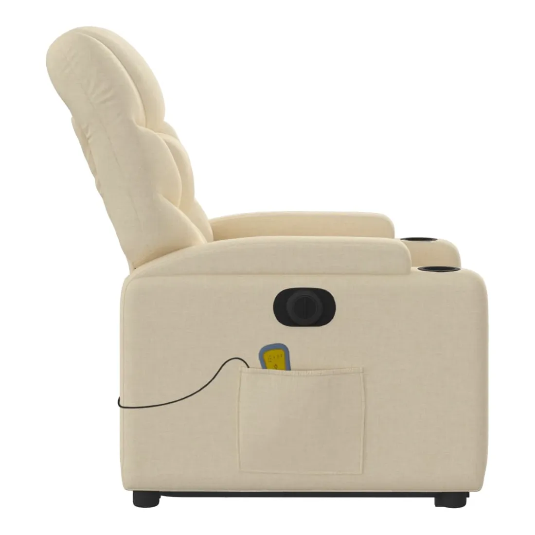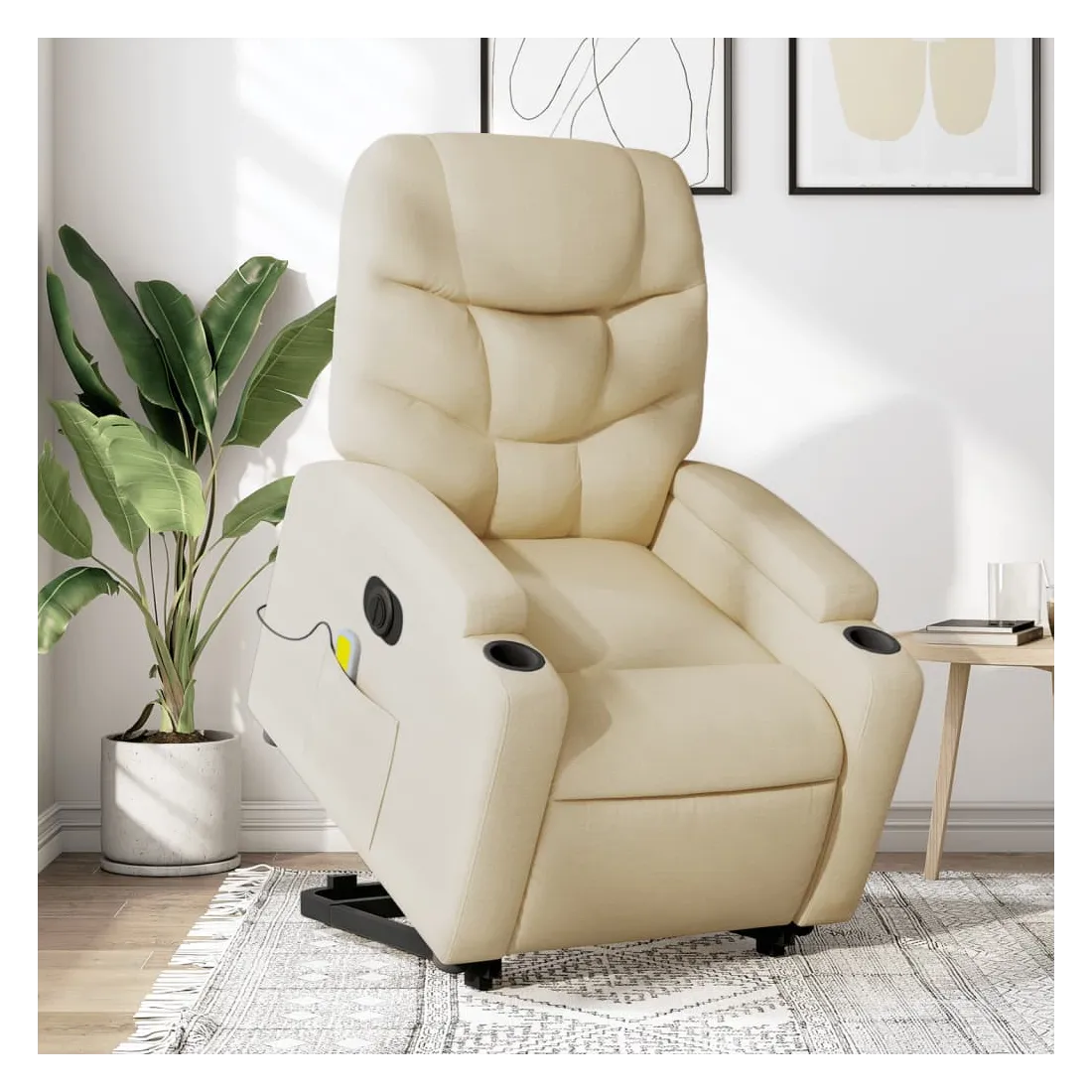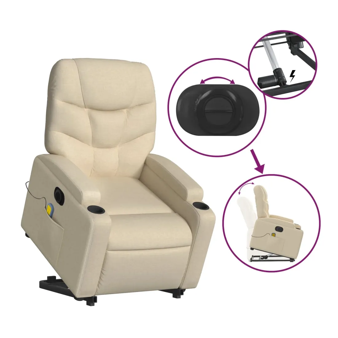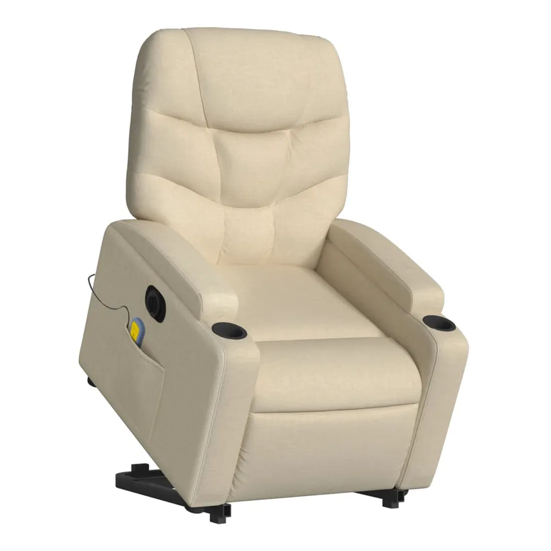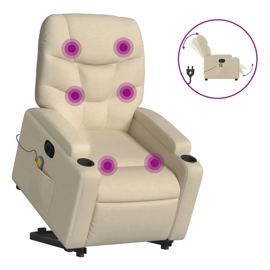 Asseyez-vous et détendez-vous dans ce fauteuil inclinable de massage électrique très confortable ! Fonction de levage électrique : ce fauteuil inclinable pour personnes âgées est équipé d'un moteur électrique pour la fonction de levage. Grâce à la fonction qui pousse toute la chaise vers le haut, vous pouvez facilement vous tenir debout sans stresser votre dos et vos genoux en appuyant simplement sur le bouton.Fonction d'inclinaison électrique : ce fauteuil inclinable est également équipé d'un moteur électrique qui permet de régler automatiquement le repose-pied et le dossier dans n'importe quelle position, selon votre confort, en appuyant simplement sur le bouton situé sur le côté du fauteuil. Cette fonction permet une inclinaison maximale de 135 degrés. En outre, le dossier peut revenir automatiquement à sa position d'origine par une simple pression sur le bouton.Fonction de vibration : les 6 points de massage vous permettent de faire l'expérience d'un massage mieux ciblé. De plus, la télécommande incluse vous permet de choisir différents programmes de massage. La fonction de massage est alimentée par le connecteur USB qui nécessite une source d'alimentation USB certifiée de 5 V (non fournie).Expérience d'assise confortable : le siège, le dossier et les larges accoudoirs bien rembourrés recouverts de tissu procurent une sensation confortable et chaleureuse, vous permettant de vous sentir enveloppé lorsque vous êtes assis. Le tissu présente un aspect simple et épuré et est respirant et durable.Porte-gobelets et poche latérale pratiques : ce fauteuil dispose de deux porte-gobelets pratiques pour vos boissons et d'une poche latérale pour garder vos objets essentiels à portée de main.Cadre solide et stable : le cadre en bois et en métal offre une structure solide et une grande stabilité. Ce fauteuil inclinable est confortable et durable.