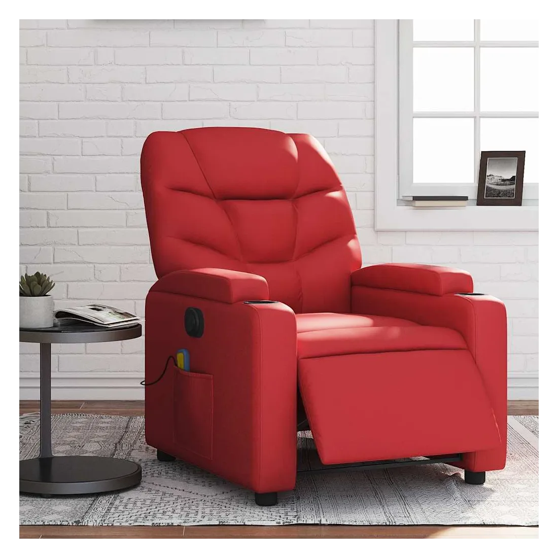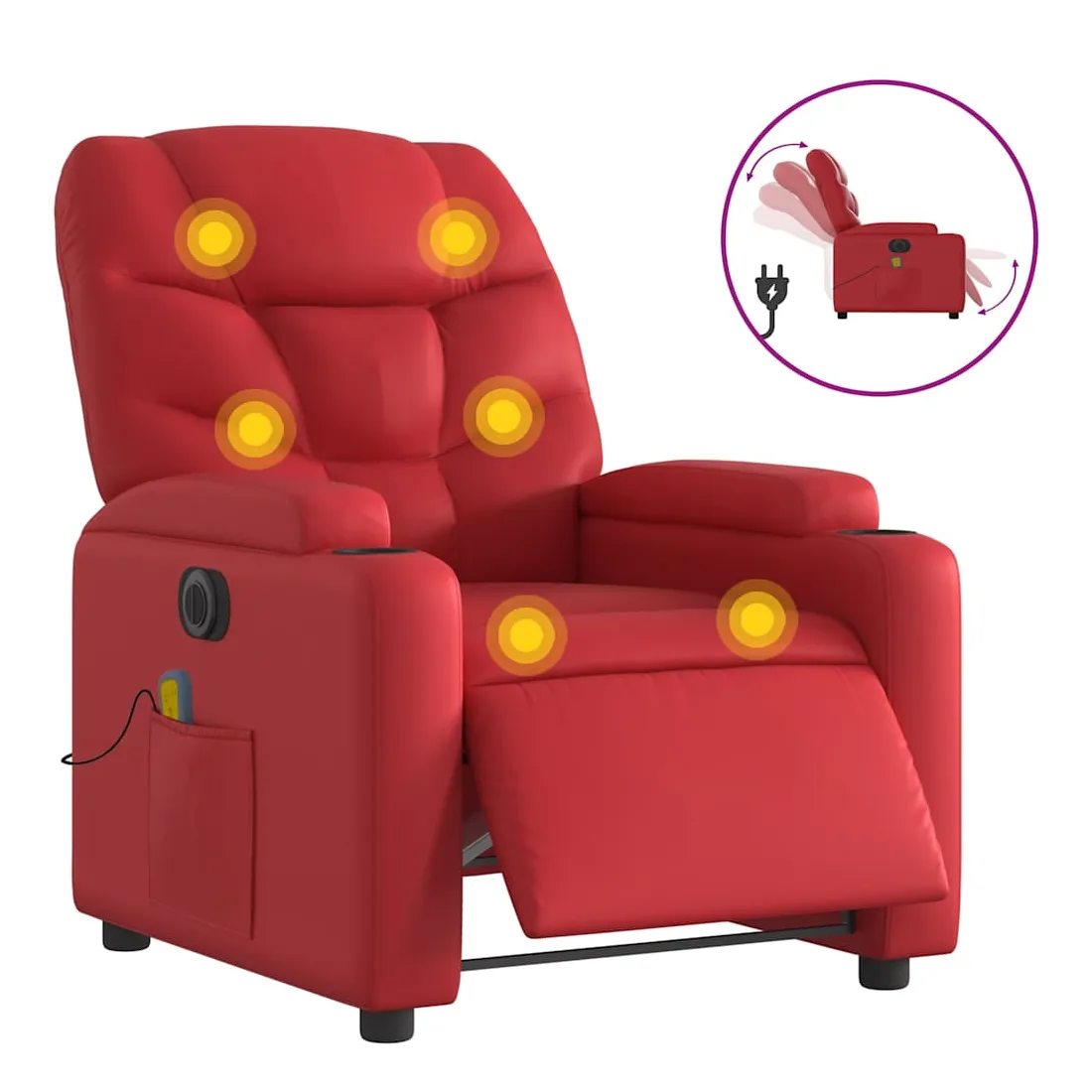 Asseyez-vous et détendez-vous dans ce fauteuil inclinable de massage électrique très confortable ! Fonction d'inclinaison électrique : ce fauteuil inclinable est équipé d'un moteur électrique qui permet de régler automatiquement le repose-pied et le dossier dans n'importe quelle position, selon votre confort, en appuyant simplement sur le bouton situé sur le côté du fauteuil. Cette fonction permet une inclinaison maximale de 135 degrés. En outre, le dossier peut revenir automatiquement à sa position d'origine par une simple pression sur le bouton.Fonction de vibration : les 6 points de massage vous permettent de faire l'expérience d'un massage mieux ciblé. De plus, la télécommande incluse vous permet de choisir différents programmes de massage. La fonction de massage est alimentée par le connecteur USB qui nécessite une source d'alimentation USB certifiée de 5 V (non fournie).Expérience de siège confortable : le siège, le dossier et les larges accoudoirs rembourrés épais recouverts de similicuir procurent une sensation confortable, vous faisant vous sentir enlacé lorsque vous êtes assis. Le similicuir est un matériau très résistant. Il est résistant aux taches, ce qui le rend facile à nettoyer avec un chiffon humide. La surface lisse donne également un aspect luxueux et la beauté du cuir véritable.Porte-gobelets et poche latérale pratiques : ce fauteuil dispose de deux porte-gobelets pratiques pour vos boissons et d'une poche latérale pour garder vos objets essentiels à portée de main.Cadre solide et stable : le cadre en bois et en métal offre une structure solide et une grande stabilité. Ce fauteuil inclinable est confortable et durable.