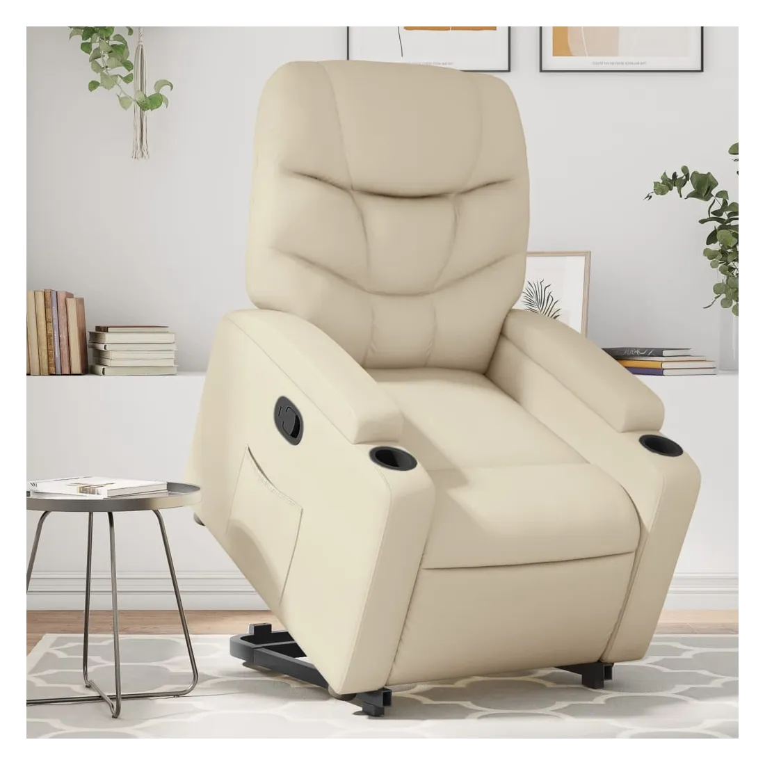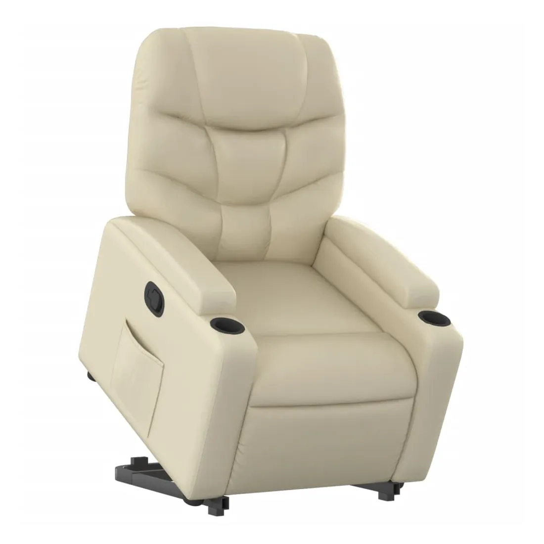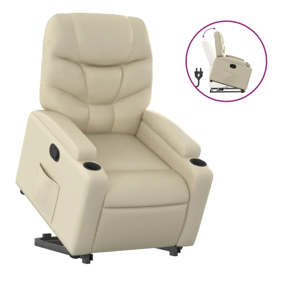 Asseyez-vous et détendez-vous dans ce fauteuil inclinable très confortable ! Fonction de levage électrique : ce fauteuil inclinable pour personnes âgées est équipé d'un moteur électrique pour la fonction de levage. Grâce à la fonction qui pousse toute la chaise vers le haut, vous pouvez facilement vous tenir debout sans stresser votre dos et vos genoux en appuyant simplement sur le bouton.Fonction d'inclinaison manuelle : ce fauteuil inclinable est doté d'une poignée du côté droit. Vous pouvez régler manuellement le repose-pieds et le dossier dans n'importe quelle position selon votre confort en tirant simplement sur la poignée. Cette fonction permet une inclinaison maximale de 135 degrés. De plus, le dossier peut revenir rapidement à sa position d'origine en tirant simplement sur la poignée.Expérience de siège confortable : le siège, le dossier et les larges accoudoirs rembourrés épais recouverts de similicuir procurent une sensation confortable, vous faisant vous sentir enlacé lorsque vous êtes assis. Le similicuir est un matériau très résistant. Il est résistant aux taches, ce qui le rend facile à nettoyer avec un chiffon humide. La surface lisse donne également un aspect luxueux et la beauté du cuir véritable.Porte-gobelets et poche latérale pratiques : ce fauteuil dispose de deux porte-gobelets pratiques pour vos boissons et d'une poche latérale pour garder vos objets essentiels à portée de main.Cadre solide et stable : le cadre en bois et en métal offre une structure solide et une grande stabilité. Ce fauteuil inclinable est confortable et durable.