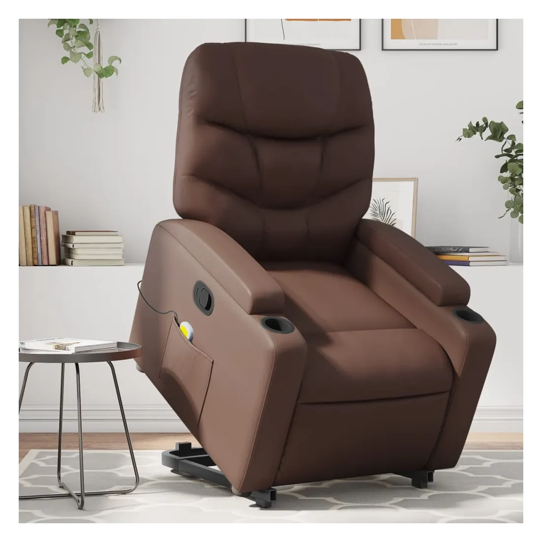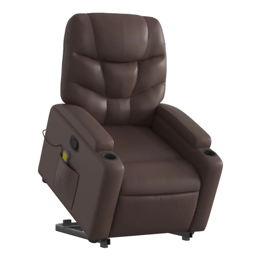 Asseyez-vous et détendez-vous dans ce fauteuil inclinable de massage très confortable ! Fonction de levage électrique : ce fauteuil inclinable pour personnes âgées est équipé d'un moteur électrique pour la fonction de levage. Grâce à la fonction qui pousse toute la chaise vers le haut, vous pouvez facilement vous tenir debout sans stresser votre dos et vos genoux en appuyant simplement sur le bouton.Fonction d'inclinaison manuelle : ce fauteuil inclinable est doté d'une poignée du côté droit. Vous pouvez régler manuellement le repose-pieds et le dossier dans n'importe quelle position selon votre confort en tirant simplement sur la poignée. Cette fonction permet une inclinaison maximale de 135 degrés. De plus, le dossier peut revenir rapidement à sa position d'origine en tirant simplement sur la poignée.Fonction de vibration : les 6 points de massage vous permettent de faire l'expérience d'un massage mieux ciblé. De plus, la télécommande incluse vous permet de choisir différents programmes de massage. La fonction de massage est alimentée par le connecteur USB qui nécessite une source d'alimentation USB certifiée de 5 V (non fournie).Expérience de siège confortable : le siège, le dossier et les larges accoudoirs rembourrés épais recouverts de similicuir procurent une sensation confortable, vous faisant vous sentir enlacé lorsque vous êtes assis. Le similicuir est un matériau très résistant. Il est résistant aux taches, ce qui le rend facile à nettoyer avec un chiffon humide. La surface lisse donne également un aspect luxueux et la beauté du cuir véritable.Porte-gobelets et poche latérale pratiques : ce fauteuil dispose de deux porte-gobelets pratiques pour vos boissons et d'une poche latérale pour garder vos objets essentiels à portée de main.Cadre solide et stable : le cadre en bois et en métal offre une structure solide et une grande stabilité. Ce fauteuil inclinable est confortable et durable.