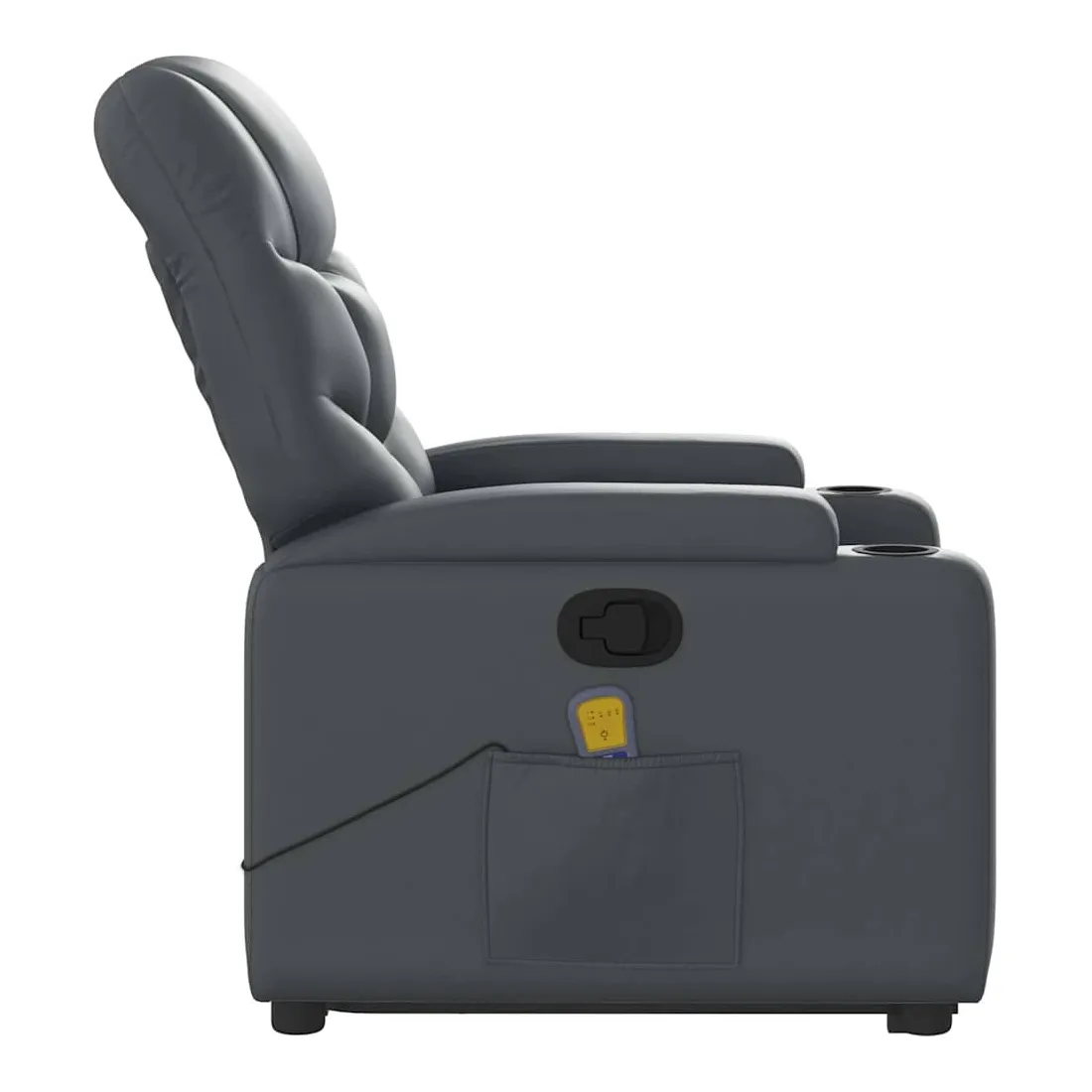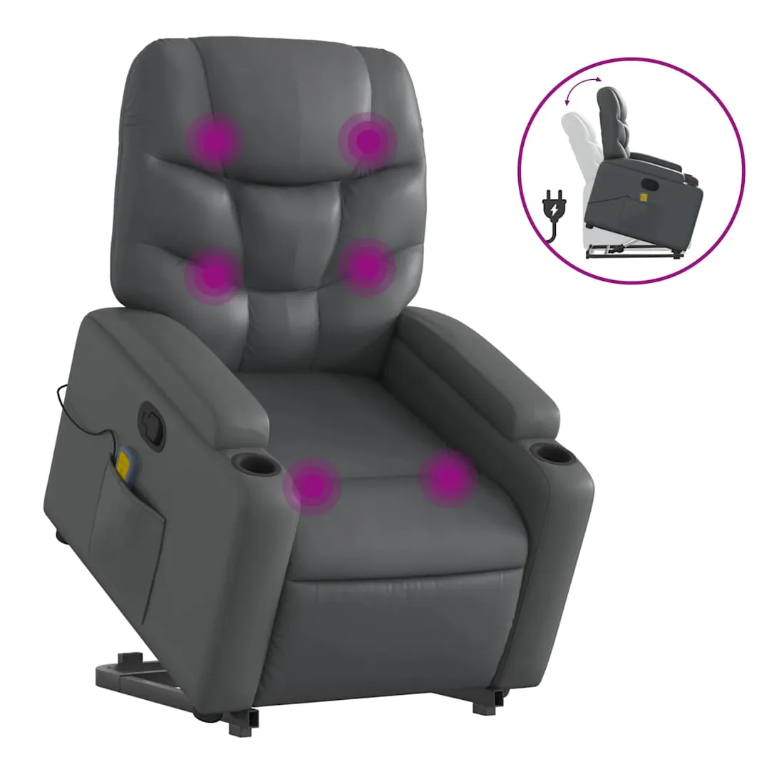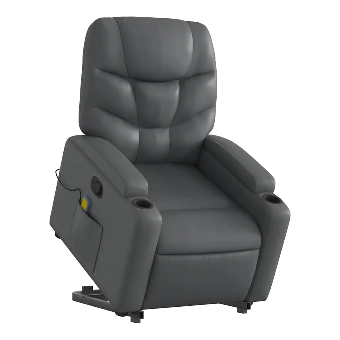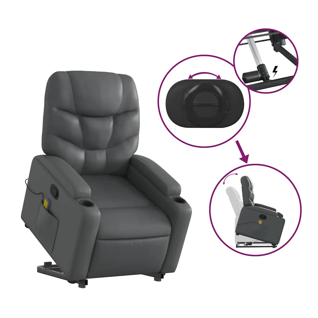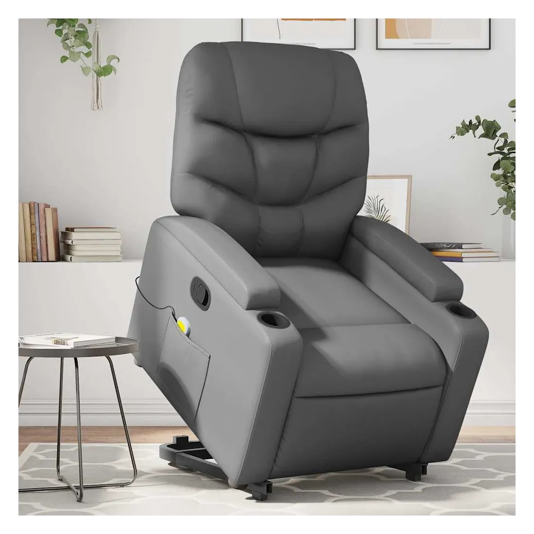 Asseyez-vous et détendez-vous dans ce fauteuil inclinable de massage très confortable ! Fonction de levage électrique : ce fauteuil inclinable pour personnes âgées est équipé d'un moteur électrique pour la fonction de levage. Grâce à la fonction qui pousse toute la chaise vers le haut, vous pouvez facilement vous tenir debout sans stresser votre dos et vos genoux en appuyant simplement sur le bouton.Fonction d'inclinaison manuelle : ce fauteuil inclinable est doté d'une poignée du côté droit. Vous pouvez régler manuellement le repose-pieds et le dossier dans n'importe quelle position selon votre confort en tirant simplement sur la poignée. Cette fonction permet une inclinaison maximale de 135 degrés. De plus, le dossier peut revenir rapidement à sa position d'origine en tirant simplement sur la poignée.Fonction de vibration : les 6 points de massage vous permettent de faire l'expérience d'un massage mieux ciblé. De plus, la télécommande incluse vous permet de choisir différents programmes de massage. La fonction de massage est alimentée par le connecteur USB qui nécessite une source d'alimentation USB certifiée de 5 V (non fournie).Expérience de siège confortable : le siège, le dossier et les larges accoudoirs rembourrés épais recouverts de similicuir procurent une sensation confortable, vous faisant vous sentir enlacé lorsque vous êtes assis. Le similicuir est un matériau très résistant. Il est résistant aux taches, ce qui le rend facile à nettoyer avec un chiffon humide. La surface lisse donne également un aspect luxueux et la beauté du cuir véritable.Porte-gobelets et poche latérale pratiques : ce fauteuil dispose de deux porte-gobelets pratiques pour vos boissons et d'une poche latérale pour garder vos objets essentiels à portée de main.Cadre solide et stable : le cadre en bois et en métal offre une structure solide et une grande stabilité. Ce fauteuil inclinable est confortable et durable.