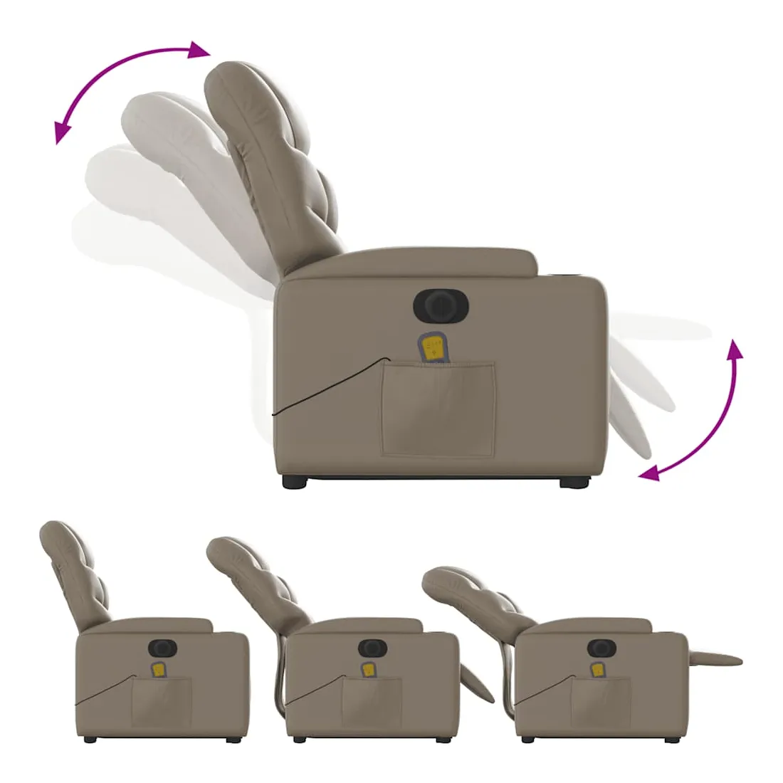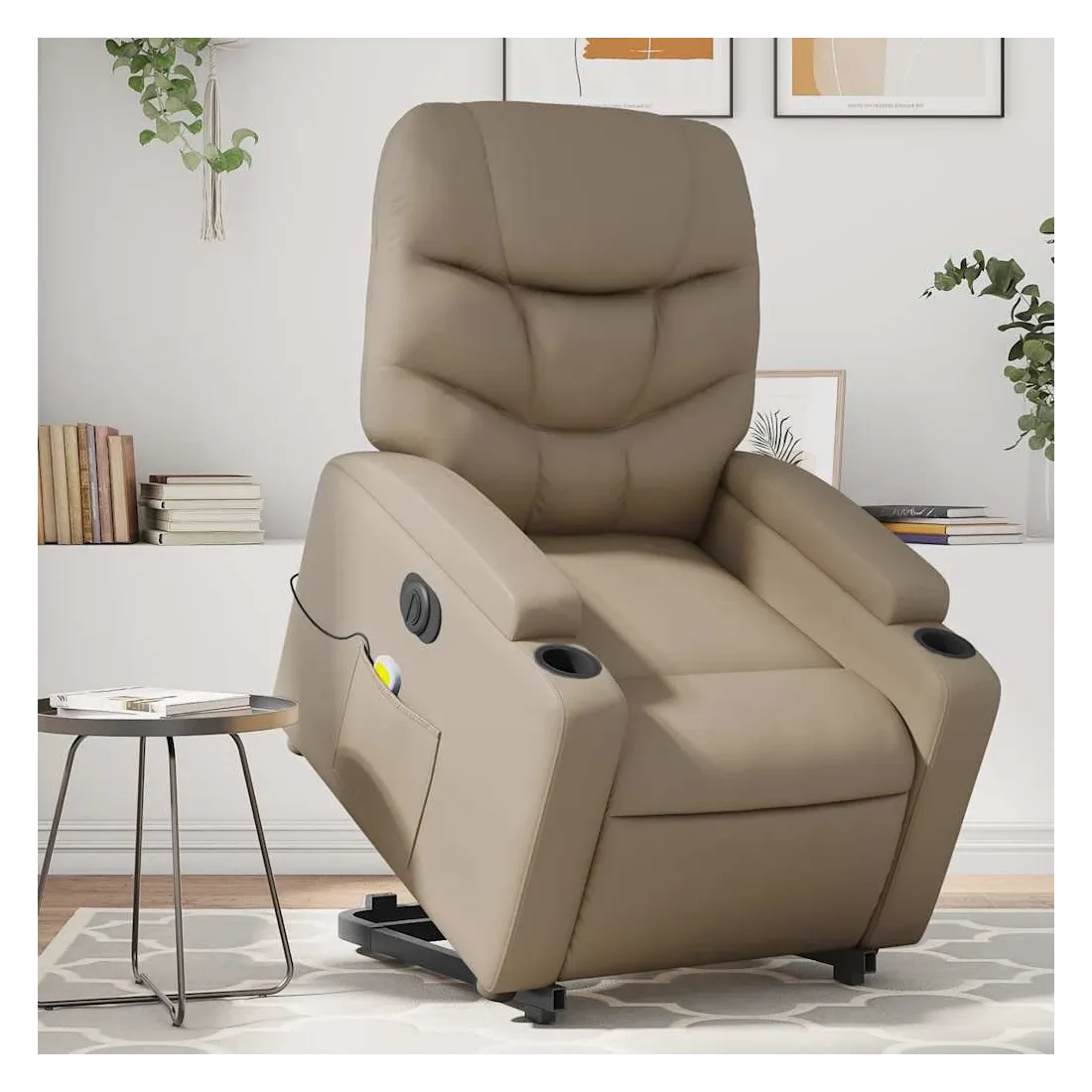 Asseyez-vous et détendez-vous dans ce fauteuil inclinable de massage électrique très confortable ! Fonction de levage électrique : ce fauteuil inclinable pour personnes âgées est équipé d'un moteur électrique pour la fonction de levage. Grâce à la fonction qui pousse toute la chaise vers le haut, vous pouvez facilement vous tenir debout sans stresser votre dos et vos genoux en appuyant simplement sur le bouton.Fonction d'inclinaison électrique : ce fauteuil inclinable est également équipé d'un moteur électrique qui permet de régler automatiquement le repose-pied et le dossier dans n'importe quelle position, selon votre confort, en appuyant simplement sur le bouton situé sur le côté du fauteuil. Cette fonction permet une inclinaison maximale de 135 degrés. En outre, le dossier peut revenir automatiquement à sa position d'origine par une simple pression sur le bouton.Fonction de vibration : les 6 points de massage vous permettent de faire l'expérience d'un massage mieux ciblé. De plus, la télécommande incluse vous permet de choisir différents programmes de massage. La fonction de massage est alimentée par le connecteur USB qui nécessite une source d'alimentation USB certifiée de 5 V (non fournie).Expérience de siège confortable : le siège, le dossier et les larges accoudoirs rembourrés épais recouverts de similicuir procurent une sensation confortable, vous faisant vous sentir enlacé lorsque vous êtes assis. Le similicuir est un matériau très résistant. Il est résistant aux taches, ce qui le rend facile à nettoyer avec un chiffon humide. La surface lisse donne également un aspect luxueux et la beauté du cuir véritable.Porte-gobelets et poche latérale pratiques : ce fauteuil dispose de deux porte-gobelets pratiques pour vos boissons et d'une poche latérale pour garder vos objets essentiels à portée de main.Cadre solide et stable : le cadre en bois et en métal offre une structure solide et une grande stabilité. Ce fauteuil inclinable est confortable et durable.