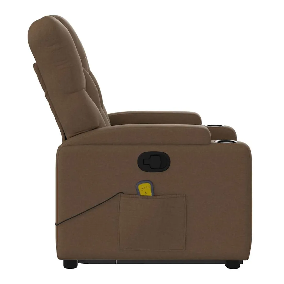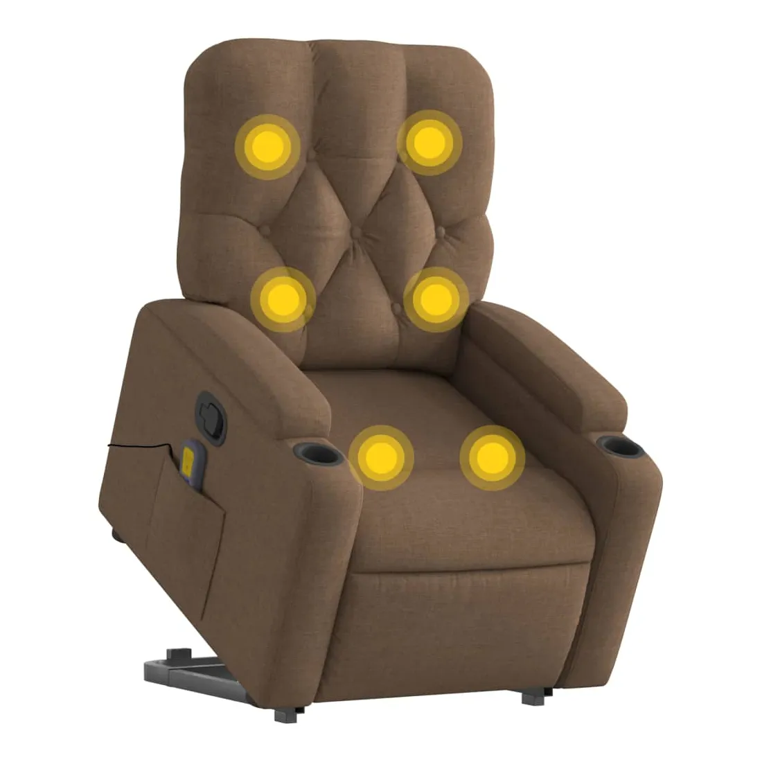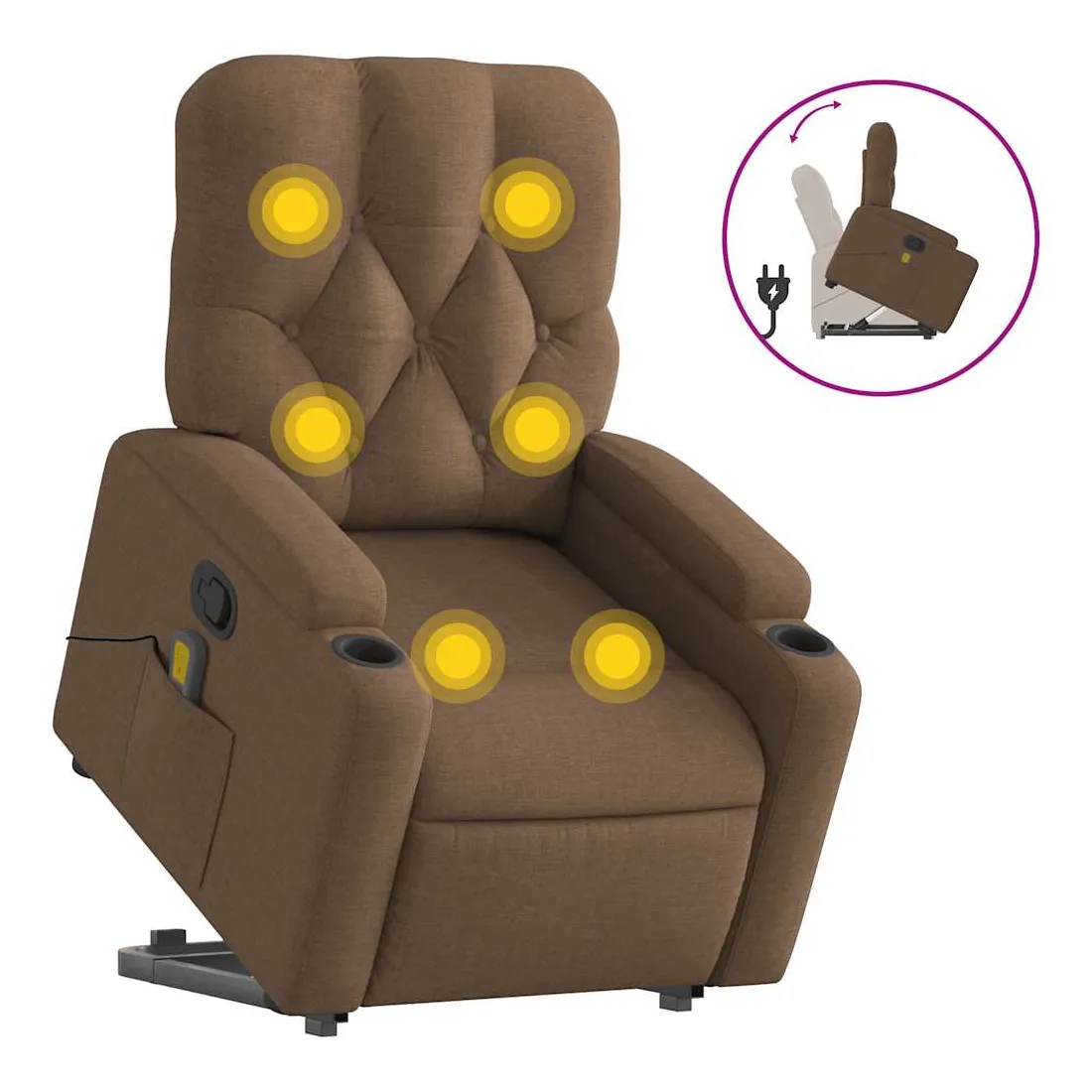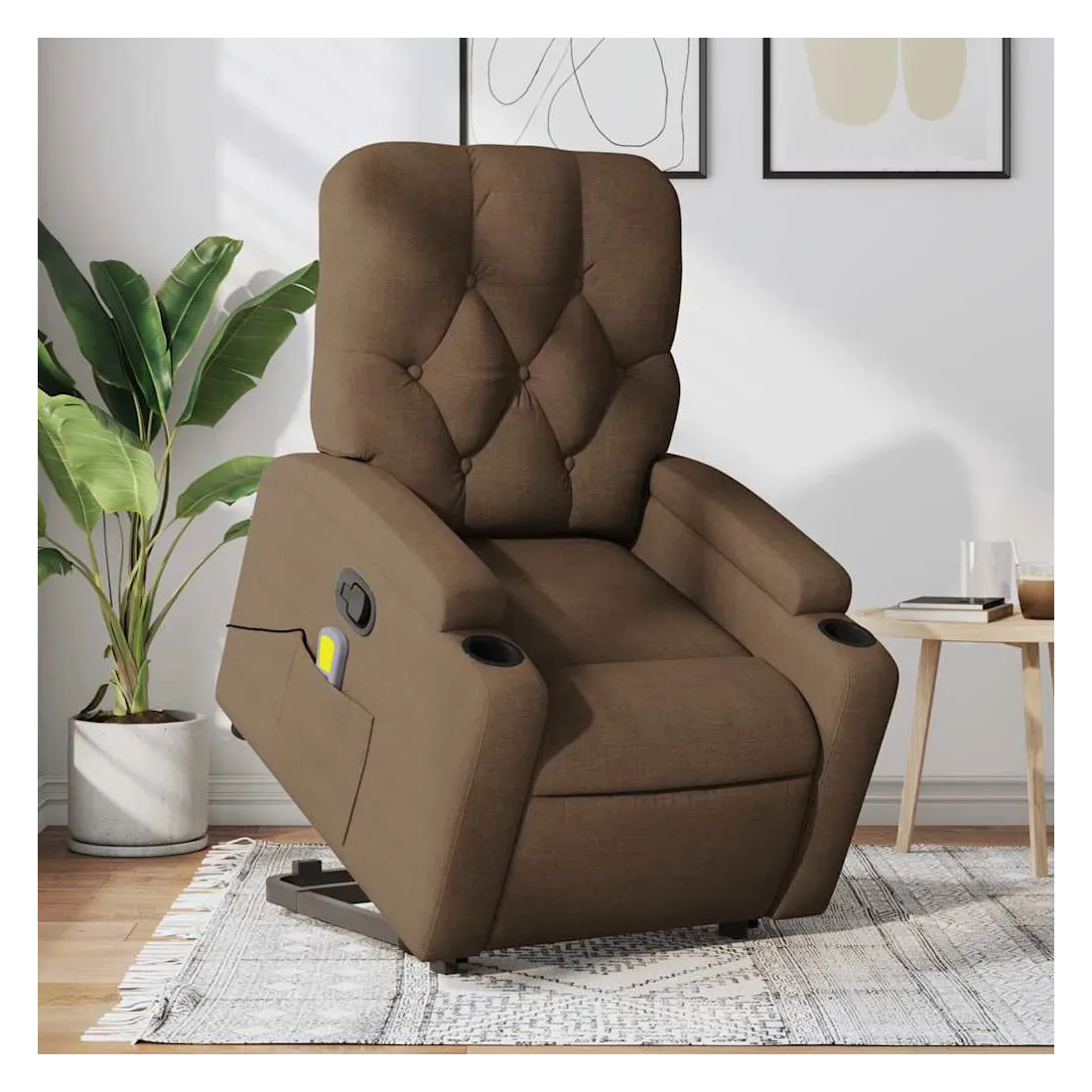 Asseyez-vous et détendez-vous dans ce fauteuil inclinable de massage très confortable ! Fonction de levage électrique : ce fauteuil inclinable pour personnes âgées est équipé d'un moteur électrique pour la fonction de levage. Grâce à la fonction qui pousse toute la chaise vers le haut, vous pouvez facilement vous tenir debout sans stresser votre dos et vos genoux en appuyant simplement sur le bouton.Fonction d'inclinaison manuelle : ce fauteuil inclinable est doté d'une poignée du côté droit. Vous pouvez régler manuellement le repose-pieds et le dossier dans n'importe quelle position selon votre confort en tirant simplement sur la poignée. Cette fonction permet une inclinaison maximale de 135 degrés. De plus, le dossier peut revenir rapidement à sa position d'origine en tirant simplement sur la poignée.Fonction de vibration : les 6 points de massage vous permettent de faire l'expérience d'un massage mieux ciblé. De plus, la télécommande incluse vous permet de choisir différents programmes de massage. La fonction de massage est alimentée par le connecteur USB qui nécessite une source d'alimentation USB certifiée de 5 V (non fournie).Expérience d'assise confortable : le siège, le dossier et les larges accoudoirs bien rembourrés recouverts de tissu procurent une sensation confortable et chaleureuse, vous permettant de vous sentir enveloppé lorsque vous êtes assis. Le tissu présente un aspect simple et épuré et est respirant et durable.Porte-gobelets et poche latérale pratiques : ce fauteuil dispose de deux porte-gobelets pratiques pour vos boissons et d'une poche latérale pour garder vos objets essentiels à portée de main.Cadre solide et stable : le cadre en bois et en métal offre une structure solide et une grande stabilité. Ce fauteuil inclinable est confortable et durable.