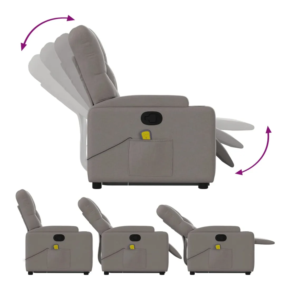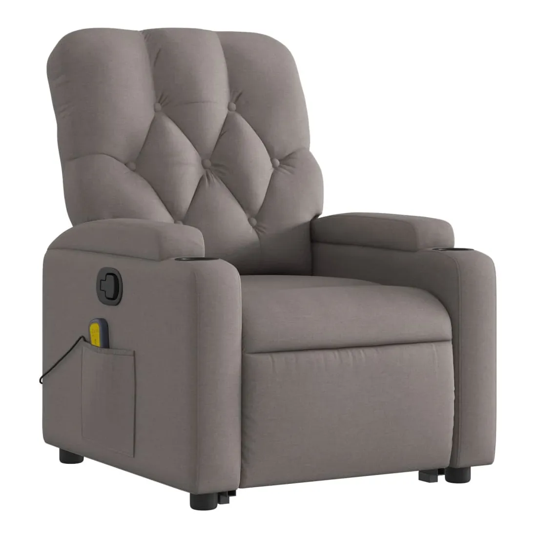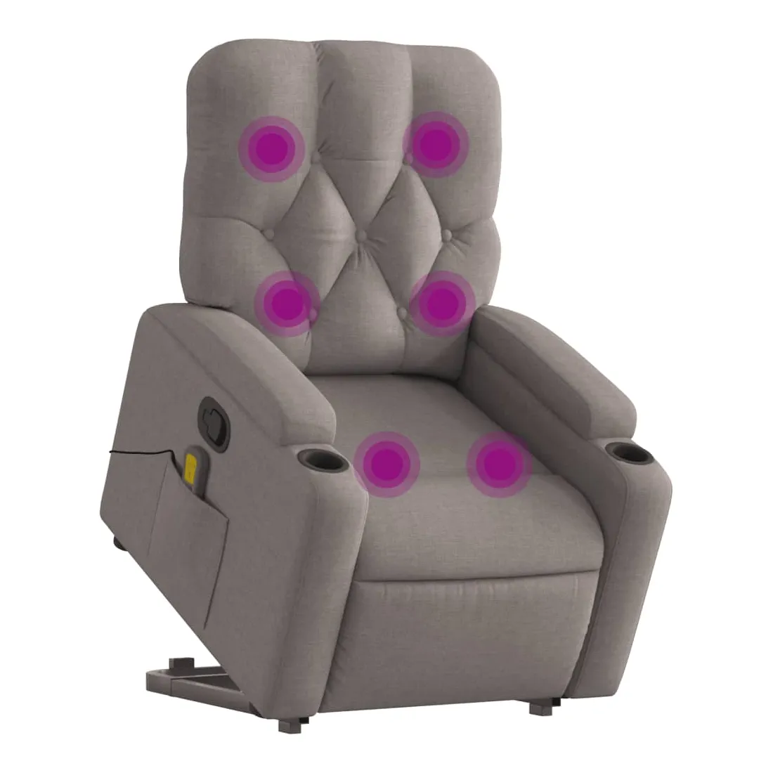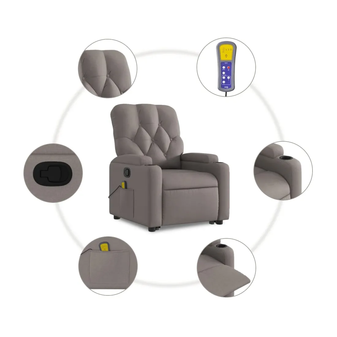 Asseyez-vous et détendez-vous dans ce fauteuil inclinable de massage très confortable ! Fonction de levage électrique : ce fauteuil inclinable pour personnes âgées est équipé d'un moteur électrique pour la fonction de levage. Grâce à la fonction qui pousse toute la chaise vers le haut, vous pouvez facilement vous tenir debout sans stresser votre dos et vos genoux en appuyant simplement sur le bouton.Fonction d'inclinaison manuelle : ce fauteuil inclinable est doté d'une poignée du côté droit. Vous pouvez régler manuellement le repose-pieds et le dossier dans n'importe quelle position selon votre confort en tirant simplement sur la poignée. Cette fonction permet une inclinaison maximale de 135 degrés. De plus, le dossier peut revenir rapidement à sa position d'origine en tirant simplement sur la poignée.Fonction de vibration : les 6 points de massage vous permettent de faire l'expérience d'un massage mieux ciblé. De plus, la télécommande incluse vous permet de choisir différents programmes de massage. La fonction de massage est alimentée par le connecteur USB qui nécessite une source d'alimentation USB certifiée de 5 V (non fournie).Expérience d'assise confortable : le siège, le dossier et les larges accoudoirs bien rembourrés recouverts de tissu procurent une sensation confortable et chaleureuse, vous permettant de vous sentir enveloppé lorsque vous êtes assis. Le tissu présente un aspect simple et épuré et est respirant et durable.Porte-gobelets et poche latérale pratiques : ce fauteuil dispose de deux porte-gobelets pratiques pour vos boissons et d'une poche latérale pour garder vos objets essentiels à portée de main.Cadre solide et stable : le cadre en bois et en métal offre une structure solide et une grande stabilité. Ce fauteuil inclinable est confortable et durable.