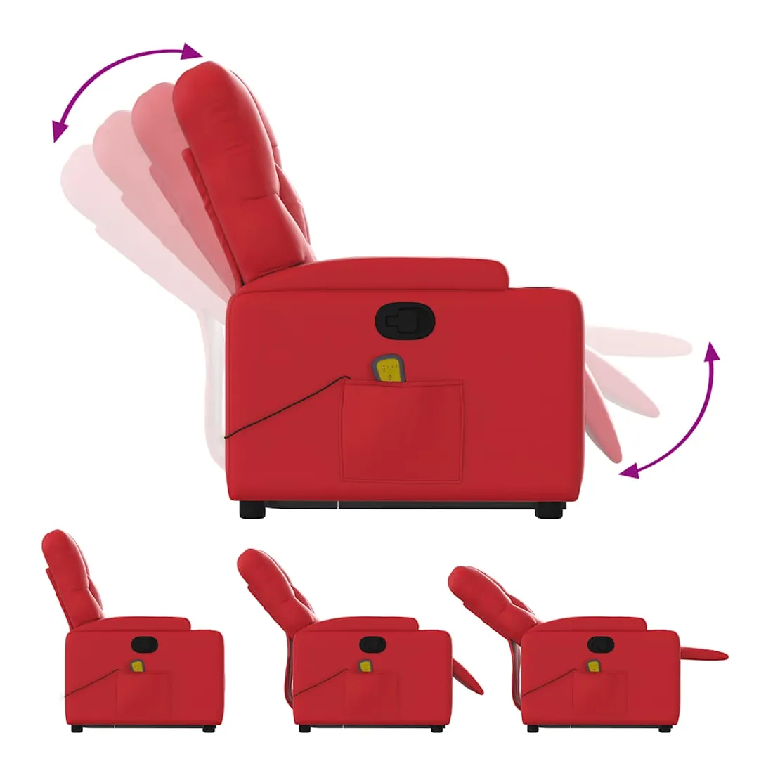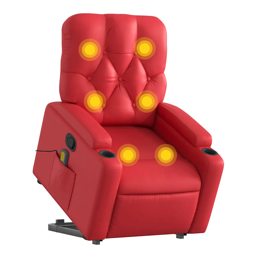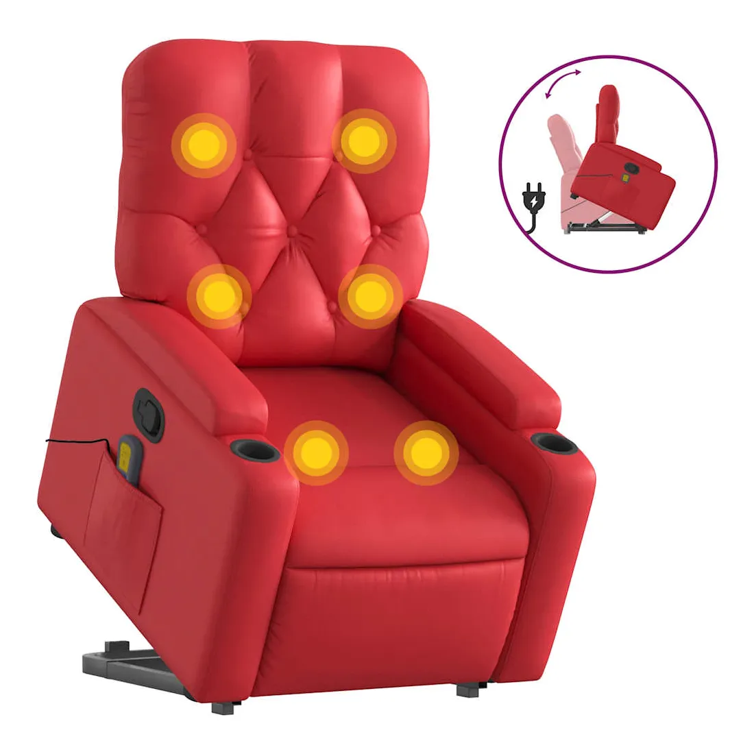 Asseyez-vous et détendez-vous dans ce fauteuil inclinable de massage très confortable ! Fonction de levage électrique : ce fauteuil inclinable pour personnes âgées est équipé d'un moteur électrique pour la fonction de levage. Grâce à la fonction qui pousse toute la chaise vers le haut, vous pouvez facilement vous tenir debout sans stresser votre dos et vos genoux en appuyant simplement sur le bouton.Fonction d'inclinaison manuelle : ce fauteuil inclinable est doté d'une poignée du côté droit. Vous pouvez régler manuellement le repose-pieds et le dossier dans n'importe quelle position selon votre confort en tirant simplement sur la poignée. Cette fonction permet une inclinaison maximale de 135 degrés. De plus, le dossier peut revenir rapidement à sa position d'origine en tirant simplement sur la poignée.Fonction de vibration : les 6 points de massage vous permettent de faire l'expérience d'un massage mieux ciblé. De plus, la télécommande incluse vous permet de choisir différents programmes de massage. La fonction de massage est alimentée par le connecteur USB qui nécessite une source d'alimentation USB certifiée de 5 V (non fournie).Expérience de siège confortable : le siège, le dossier et les larges accoudoirs rembourrés épais recouverts de similicuir procurent une sensation confortable, vous faisant vous sentir enlacé lorsque vous êtes assis. Le similicuir est un matériau très résistant. Il est résistant aux taches, ce qui le rend facile à nettoyer avec un chiffon humide. La surface lisse donne également un aspect luxueux et la beauté du cuir véritable.Poche latérale pratique : ce fauteuil est doté d'une poche latérale pour ranger votre télécommande ou garder vos objets essentiels à portée de main.Cadre solide et stable : le cadre en bois et en métal offre une structure solide et une grande stabilité. Ce fauteuil inclinable est confortable et durable.
