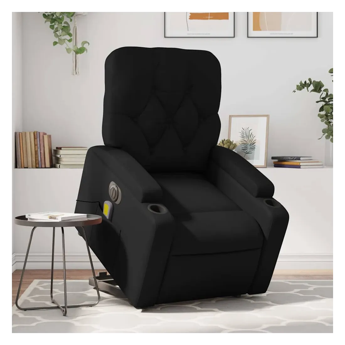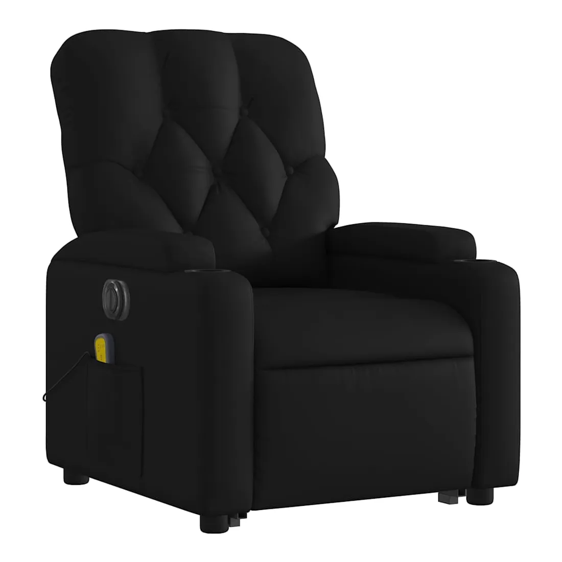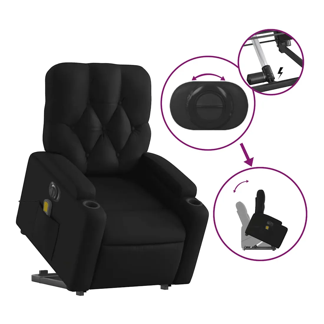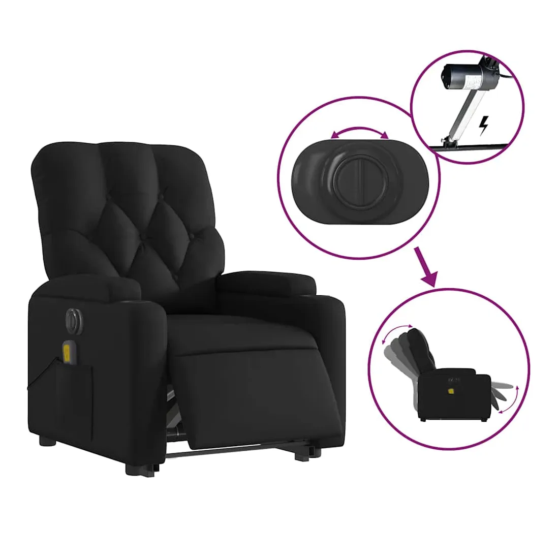 Asseyez-vous et détendez-vous dans ce fauteuil inclinable de massage électrique très confortable ! Fonction de levage électrique : ce fauteuil inclinable pour personnes âgées est équipé d'un moteur électrique pour la fonction de levage. Grâce à la fonction qui pousse toute la chaise vers le haut, vous pouvez facilement vous tenir debout sans stresser votre dos et vos genoux en appuyant simplement sur le bouton.Fonction d'inclinaison électrique : ce fauteuil inclinable est également équipé d'un moteur électrique qui permet de régler automatiquement le repose-pied et le dossier dans n'importe quelle position, selon votre confort, en appuyant simplement sur le bouton situé sur le côté du fauteuil. Cette fonction permet une inclinaison maximale de 135 degrés. En outre, le dossier peut revenir automatiquement à sa position d'origine par une simple pression sur le bouton.Fonction de vibration : les 6 points de massage vous permettent de faire l'expérience d'un massage mieux ciblé. De plus, la télécommande incluse vous permet de choisir différents programmes de massage. La fonction de massage est alimentée par le connecteur USB qui nécessite une source d'alimentation USB certifiée de 5 V (non fournie).Expérience de siège confortable : le siège, le dossier et les larges accoudoirs rembourrés épais recouverts de similicuir procurent une sensation confortable, vous faisant vous sentir enlacé lorsque vous êtes assis. Le similicuir est un matériau très résistant. Il est résistant aux taches, ce qui le rend facile à nettoyer avec un chiffon humide. La surface lisse donne également un aspect luxueux et la beauté du cuir véritable.Poche latérale pratique : ce fauteuil est doté d'une poche latérale pour ranger votre télécommande ou garder vos objets essentiels à portée de main.Cadre solide et stable : le cadre en bois et en métal offre une structure solide et une grande stabilité. Ce fauteuil inclinable est confortable et durable.