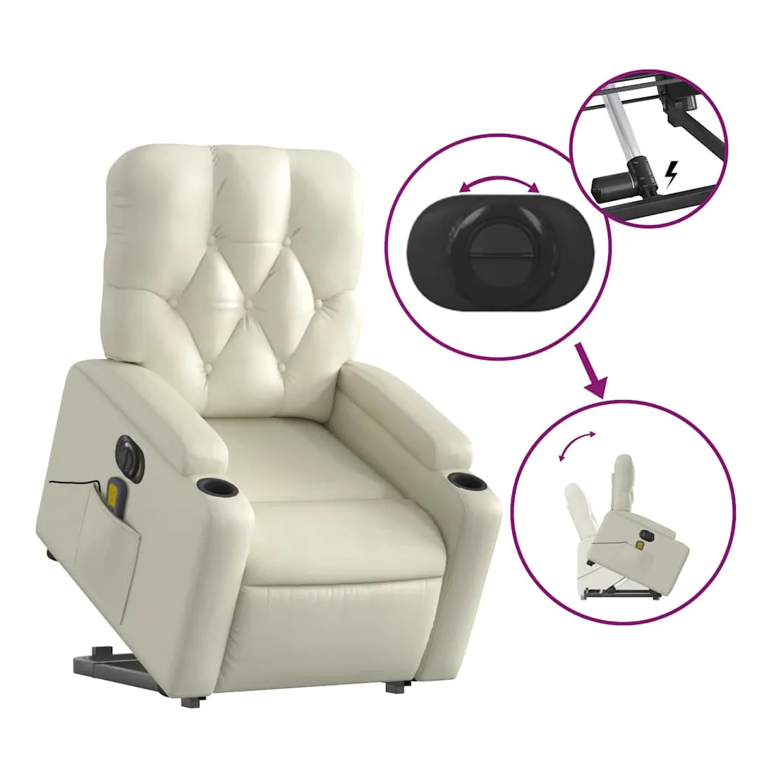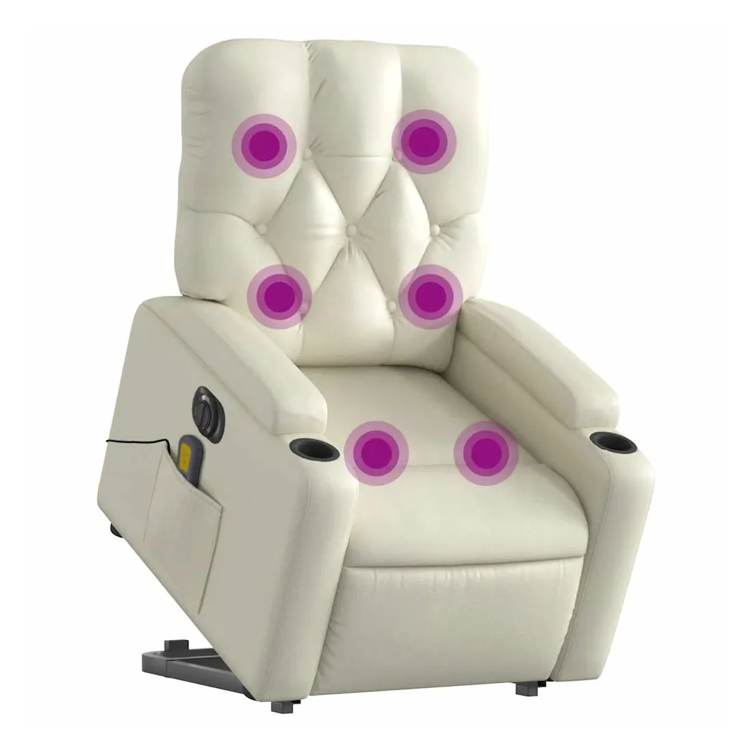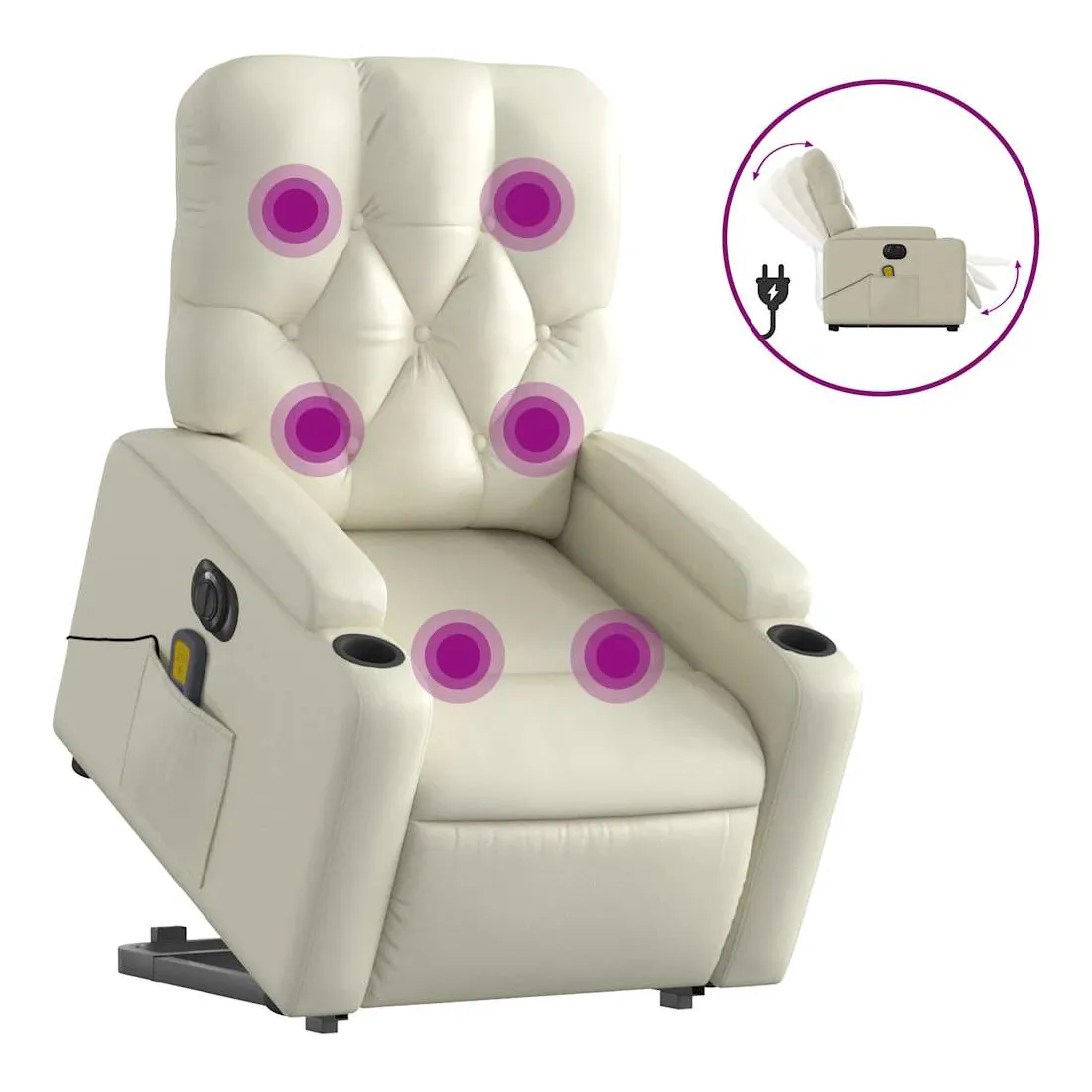 Asseyez-vous et détendez-vous dans ce fauteuil inclinable de massage électrique très confortable ! Fonction de levage électrique : ce fauteuil inclinable pour personnes âgées est équipé d'un moteur électrique pour la fonction de levage. Grâce à la fonction qui pousse toute la chaise vers le haut, vous pouvez facilement vous tenir debout sans stresser votre dos et vos genoux en appuyant simplement sur le bouton.Fonction d'inclinaison électrique : ce fauteuil inclinable est également équipé d'un moteur électrique qui permet de régler automatiquement le repose-pied et le dossier dans n'importe quelle position, selon votre confort, en appuyant simplement sur le bouton situé sur le côté du fauteuil. Cette fonction permet une inclinaison maximale de 135 degrés. En outre, le dossier peut revenir automatiquement à sa position d'origine par une simple pression sur le bouton.Fonction de vibration : les 6 points de massage vous permettent de faire l'expérience d'un massage mieux ciblé. De plus, la télécommande incluse vous permet de choisir différents programmes de massage. La fonction de massage est alimentée par le connecteur USB qui nécessite une source d'alimentation USB certifiée de 5 V (non fournie).Expérience de siège confortable : le siège, le dossier et les larges accoudoirs rembourrés épais recouverts de similicuir procurent une sensation confortable, vous faisant vous sentir enlacé lorsque vous êtes assis. Le similicuir est un matériau très résistant. Il est résistant aux taches, ce qui le rend facile à nettoyer avec un chiffon humide. La surface lisse donne également un aspect luxueux et la beauté du cuir véritable.Poche latérale pratique : ce fauteuil est doté d'une poche latérale pour ranger votre télécommande ou garder vos objets essentiels à portée de main.Cadre solide et stable : le cadre en bois et en métal offre une structure solide et une grande stabilité. Ce fauteuil inclinable est confortable et durable.