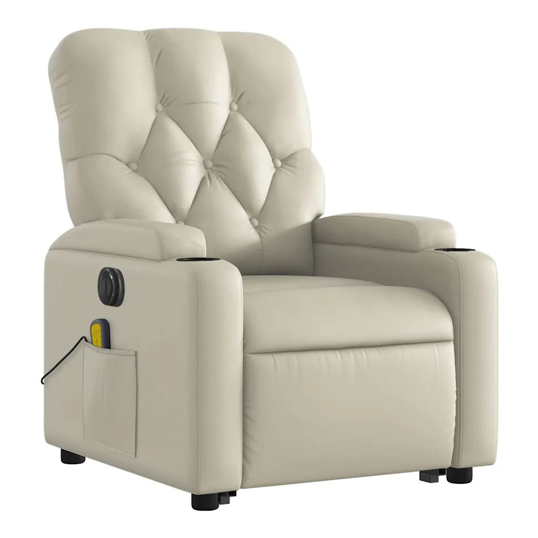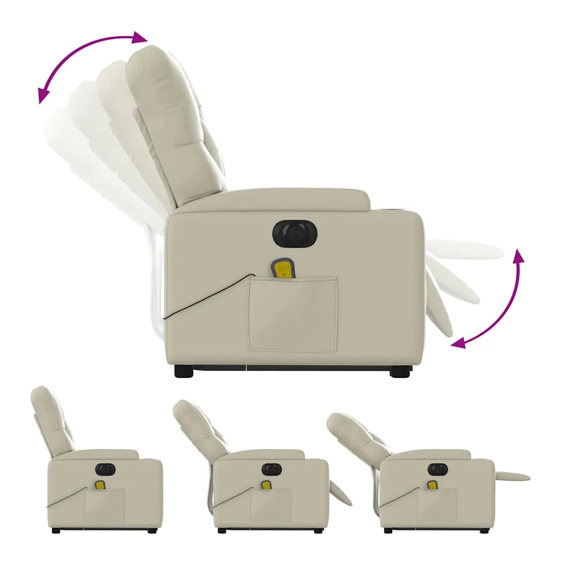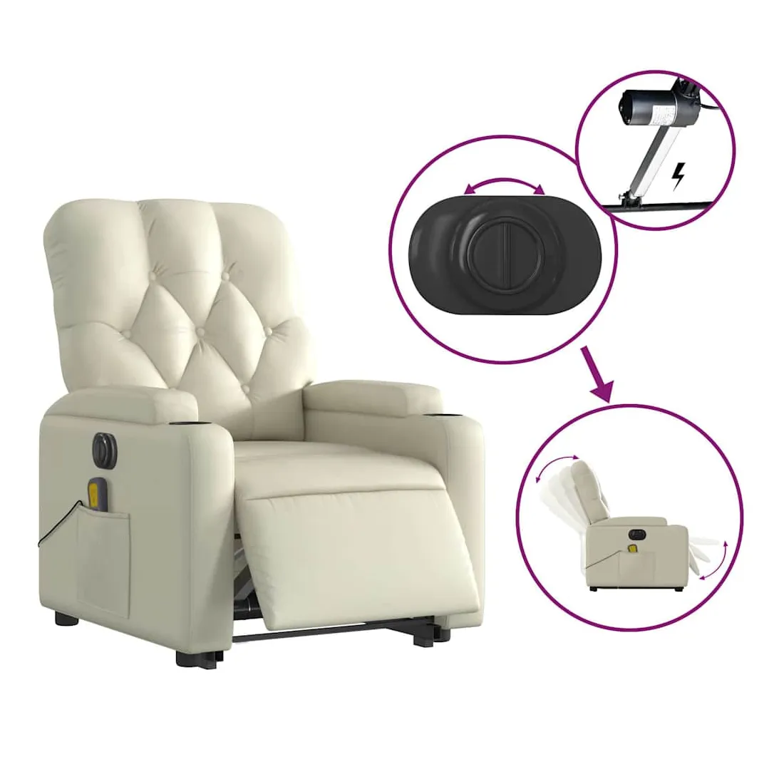 Asseyez-vous et détendez-vous dans ce fauteuil inclinable de massage électrique très confortable ! Fonction de levage électrique : ce fauteuil inclinable pour personnes âgées est équipé d'un moteur électrique pour la fonction de levage. Grâce à la fonction qui pousse toute la chaise vers le haut, vous pouvez facilement vous tenir debout sans stresser votre dos et vos genoux en appuyant simplement sur le bouton.Fonction d'inclinaison électrique : ce fauteuil inclinable est également équipé d'un moteur électrique qui permet de régler automatiquement le repose-pied et le dossier dans n'importe quelle position, selon votre confort, en appuyant simplement sur le bouton situé sur le côté du fauteuil. Cette fonction permet une inclinaison maximale de 135 degrés. En outre, le dossier peut revenir automatiquement à sa position d'origine par une simple pression sur le bouton.Fonction de vibration : les 6 points de massage vous permettent de faire l'expérience d'un massage mieux ciblé. De plus, la télécommande incluse vous permet de choisir différents programmes de massage. La fonction de massage est alimentée par le connecteur USB qui nécessite une source d'alimentation USB certifiée de 5 V (non fournie).Expérience de siège confortable : le siège, le dossier et les larges accoudoirs rembourrés épais recouverts de similicuir procurent une sensation confortable, vous faisant vous sentir enlacé lorsque vous êtes assis. Le similicuir est un matériau très résistant. Il est résistant aux taches, ce qui le rend facile à nettoyer avec un chiffon humide. La surface lisse donne également un aspect luxueux et la beauté du cuir véritable.Poche latérale pratique : ce fauteuil est doté d'une poche latérale pour ranger votre télécommande ou garder vos objets essentiels à portée de main.Cadre solide et stable : le cadre en bois et en métal offre une structure solide et une grande stabilité. Ce fauteuil inclinable est confortable et durable.