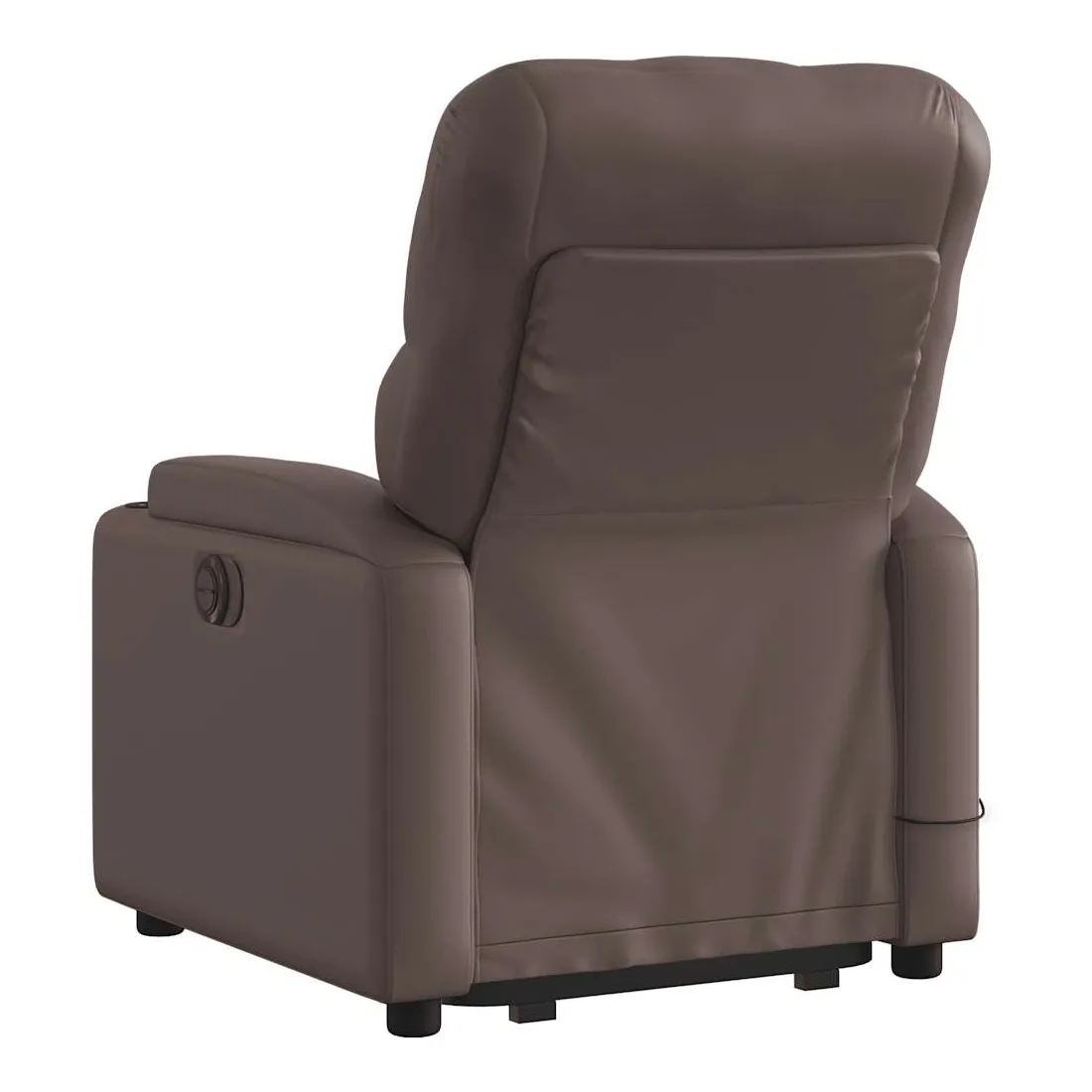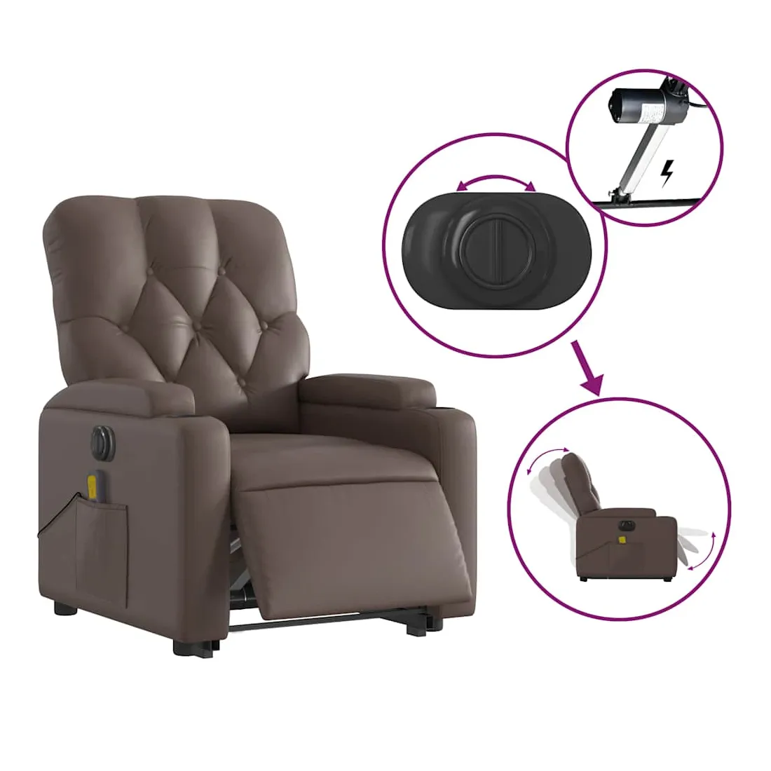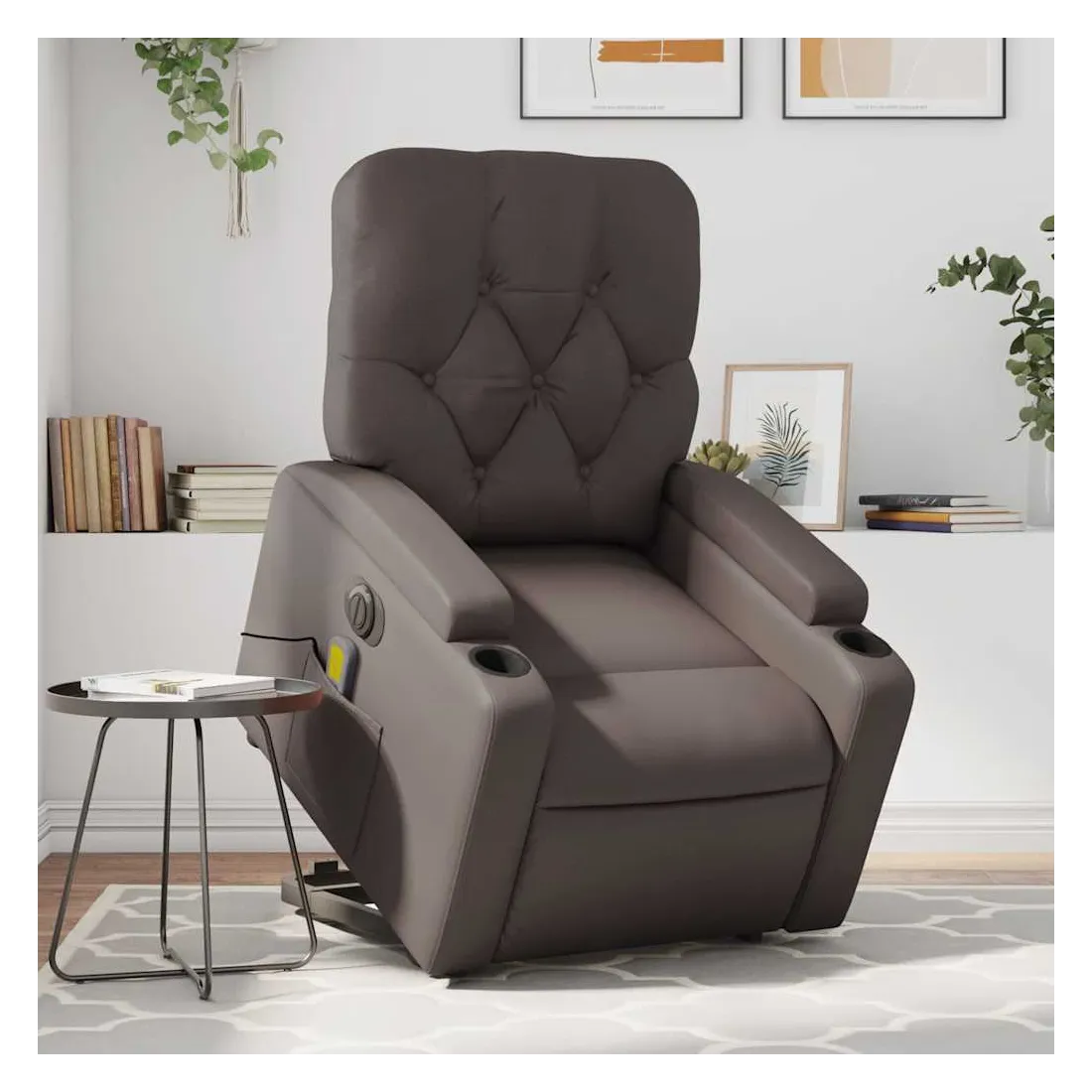 Asseyez-vous et détendez-vous dans ce fauteuil inclinable de massage électrique très confortable ! Fonction de levage électrique : ce fauteuil inclinable pour personnes âgées est équipé d'un moteur électrique pour la fonction de levage. Grâce à la fonction qui pousse toute la chaise vers le haut, vous pouvez facilement vous tenir debout sans stresser votre dos et vos genoux en appuyant simplement sur le bouton.Fonction d'inclinaison électrique : ce fauteuil inclinable est également équipé d'un moteur électrique qui permet de régler automatiquement le repose-pied et le dossier dans n'importe quelle position, selon votre confort, en appuyant simplement sur le bouton situé sur le côté du fauteuil. Cette fonction permet une inclinaison maximale de 135 degrés. En outre, le dossier peut revenir automatiquement à sa position d'origine par une simple pression sur le bouton.Fonction de vibration : les 6 points de massage vous permettent de faire l'expérience d'un massage mieux ciblé. De plus, la télécommande incluse vous permet de choisir différents programmes de massage. La fonction de massage est alimentée par le connecteur USB qui nécessite une source d'alimentation USB certifiée de 5 V (non fournie).Expérience de siège confortable : le siège, le dossier et les larges accoudoirs rembourrés épais recouverts de similicuir procurent une sensation confortable, vous faisant vous sentir enlacé lorsque vous êtes assis. Le similicuir est un matériau très résistant. Il est résistant aux taches, ce qui le rend facile à nettoyer avec un chiffon humide. La surface lisse donne également un aspect luxueux et la beauté du cuir véritable.Poche latérale pratique : ce fauteuil est doté d'une poche latérale pour ranger votre télécommande ou garder vos objets essentiels à portée de main.Cadre solide et stable : le cadre en bois et en métal offre une structure solide et une grande stabilité. Ce fauteuil inclinable est confortable et durable.