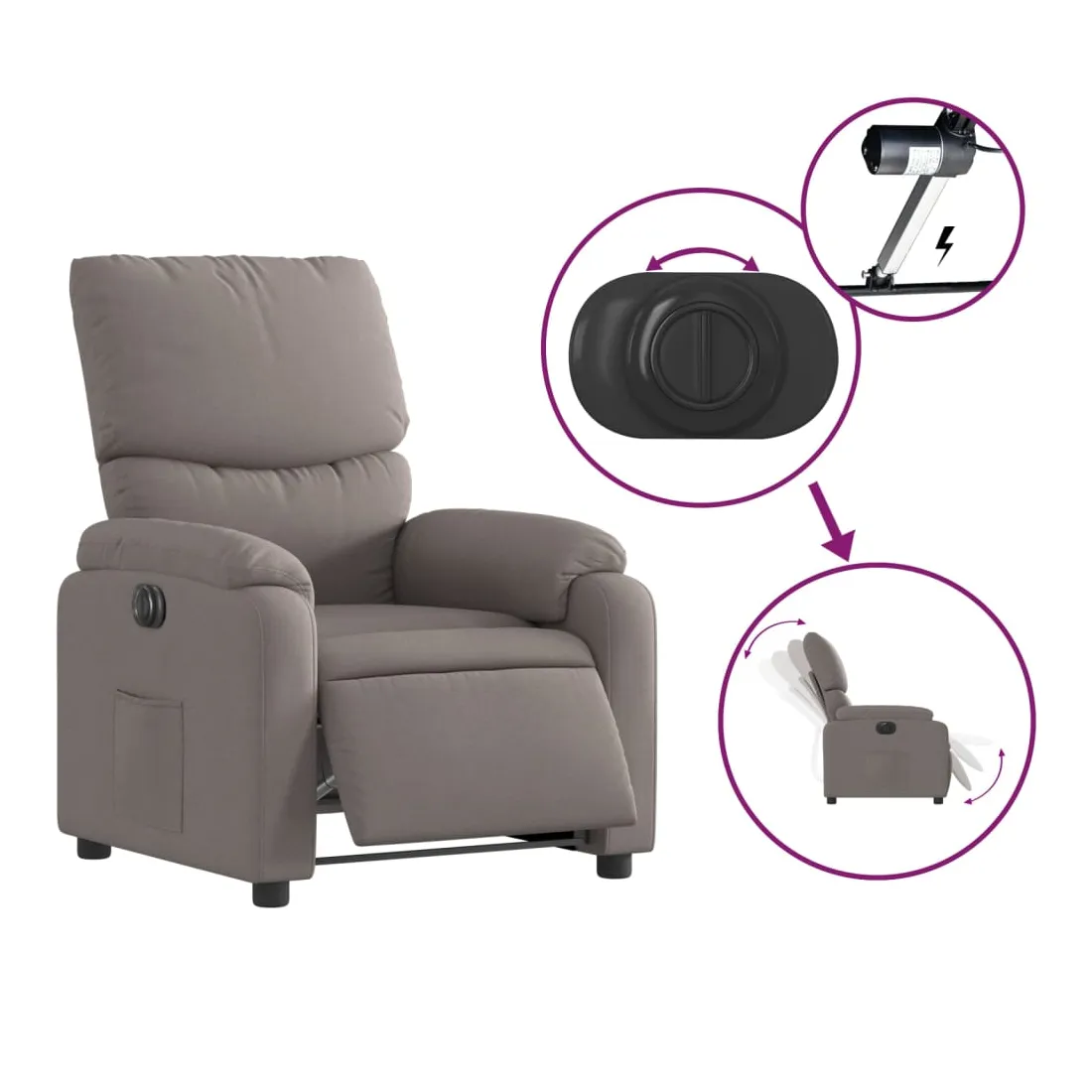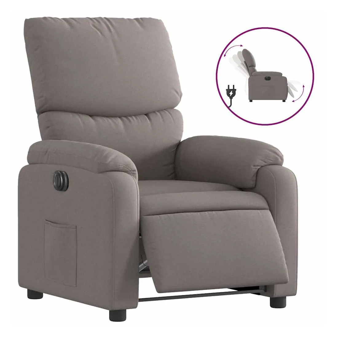 Asseyez-vous et détendez-vous dans ce fauteuil inclinable électrique très confortable ! Fonction d'inclinaison électrique : ce fauteuil inclinable est équipé d'un moteur électrique qui permet de régler automatiquement le repose-pied et le dossier dans n'importe quelle position, selon votre confort, en appuyant simplement sur le bouton situé sur le côté du fauteuil. Cette fonction permet une inclinaison maximale de 135 degrés. En outre, le dossier peut revenir automatiquement à sa position d'origine par une simple pression sur le bouton.Expérience d'assise confortable : le siège, le dossier et les larges accoudoirs bien rembourrés recouverts de tissu procurent une sensation confortable et chaleureuse, vous permettant de vous sentir enveloppé lorsque vous êtes assis. Le tissu présente un aspect simple et épuré et est respirant et durable.Poche latérale pratique : ce fauteuil est doté d'une poche latérale pour vous permettre de garder vos objets essentiels à portée de main.Cadre solide et stable : le cadre en bois et en métal offre une structure solide et une grande stabilité. Ce fauteuil inclinable est confortable et durable.