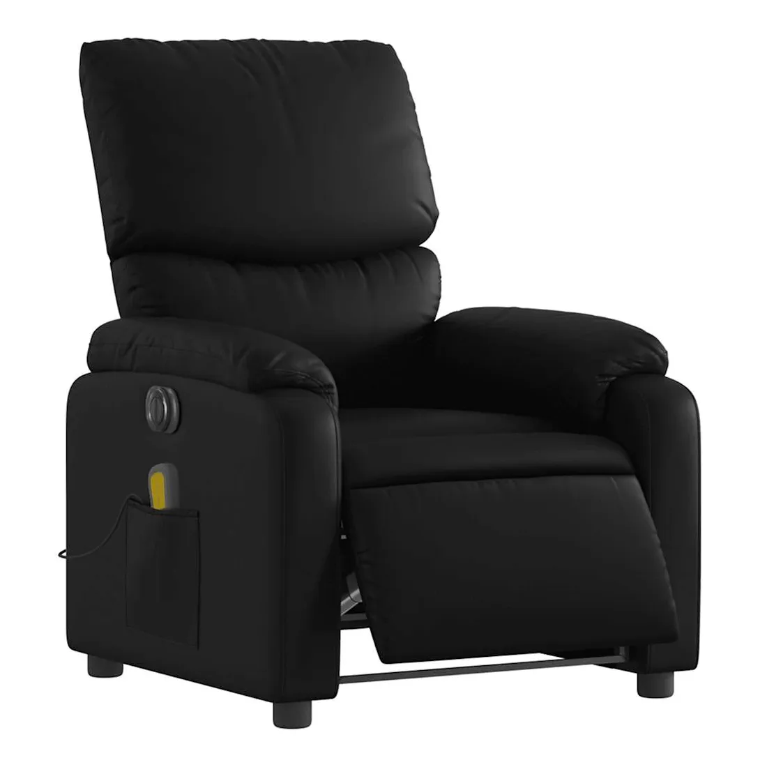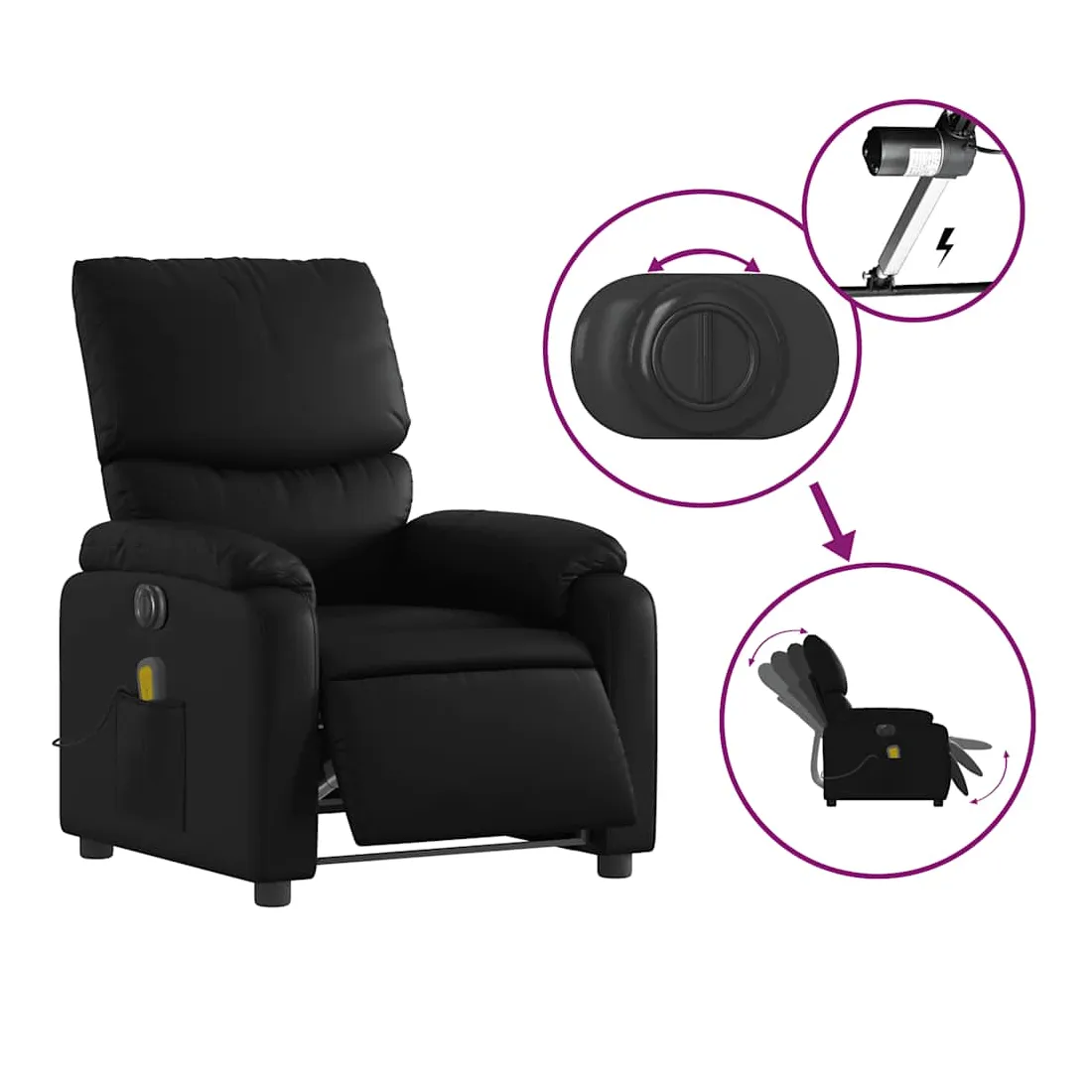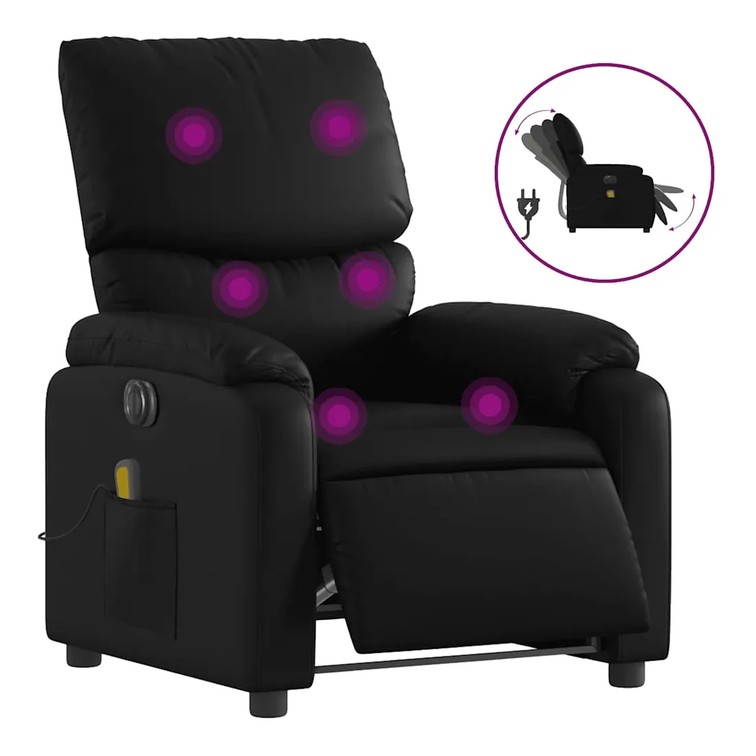 Asseyez-vous et détendez-vous dans ce fauteuil inclinable de massage électrique très confortable ! Fonction d'inclinaison électrique : ce fauteuil inclinable est équipé d'un moteur électrique qui permet de régler automatiquement le repose-pied et le dossier dans n'importe quelle position, selon votre confort, en appuyant simplement sur le bouton situé sur le côté du fauteuil. Cette fonction permet une inclinaison maximale de 135 degrés. En outre, le dossier peut revenir automatiquement à sa position d'origine par une simple pression sur le bouton.Fonction de vibration : les 6 points de massage vous permettent de faire l'expérience d'un massage mieux ciblé. De plus, la télécommande incluse vous permet de choisir différents programmes de massage. La fonction de massage est alimentée par le connecteur USB qui nécessite une source d'alimentation USB certifiée de 5 V (non fournie).Expérience de siège confortable : le siège, le dossier et les larges accoudoirs rembourrés épais recouverts de similicuir procurent une sensation confortable, vous faisant vous sentir enlacé lorsque vous êtes assis. Le similicuir est un matériau très résistant. Il est résistant aux taches, ce qui le rend facile à nettoyer avec un chiffon humide. La surface lisse donne également un aspect luxueux et la beauté du cuir véritable.Poche latérale pratique : ce fauteuil est doté d'une poche latérale pour ranger votre télécommande ou garder vos objets essentiels à portée de main.Cadre solide et stable : le cadre en bois et en métal offre une structure solide et une grande stabilité. Ce fauteuil inclinable est confortable et durable.