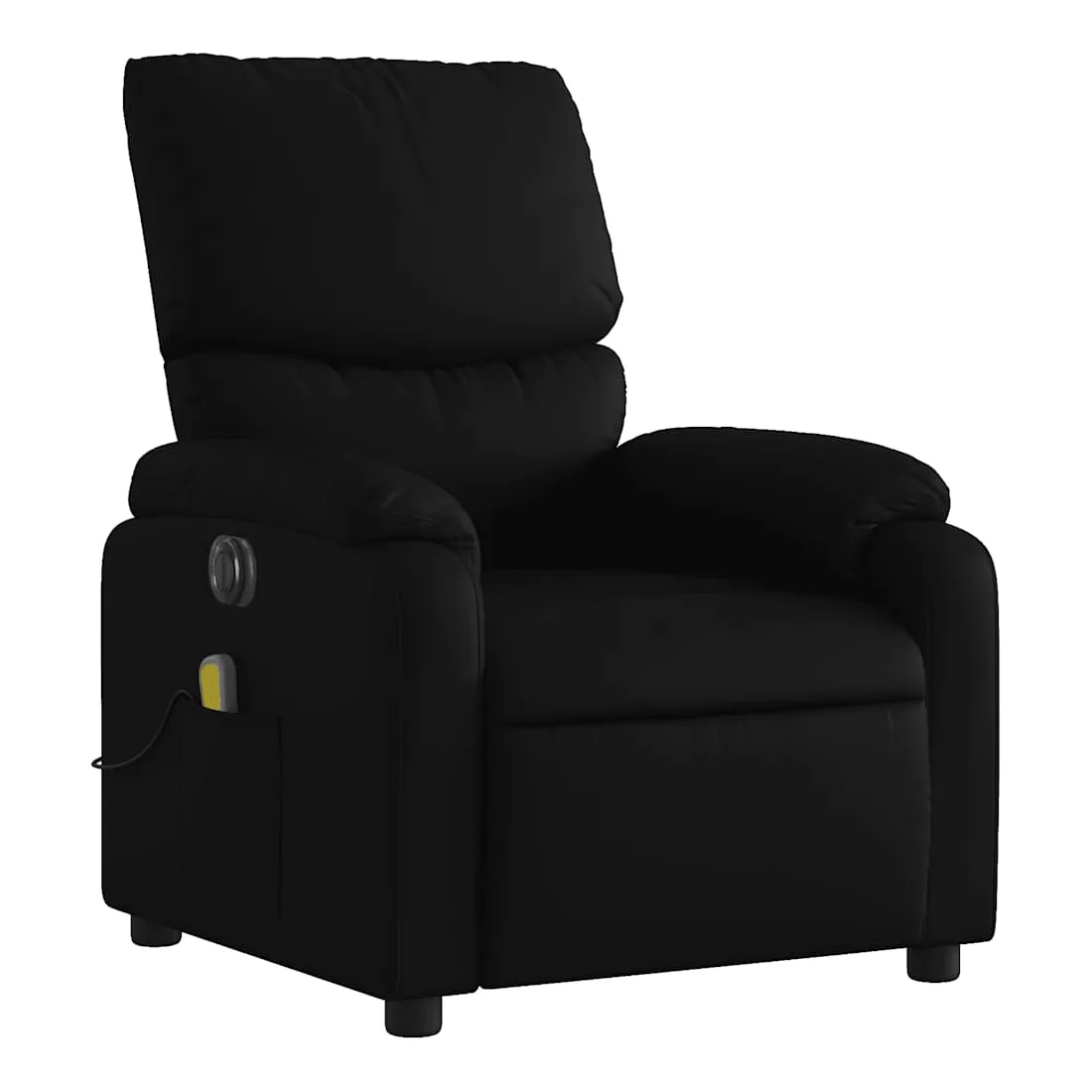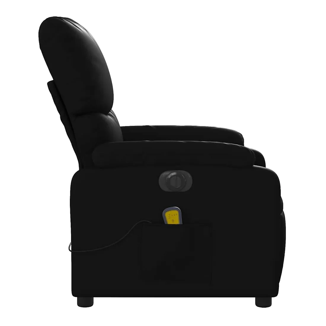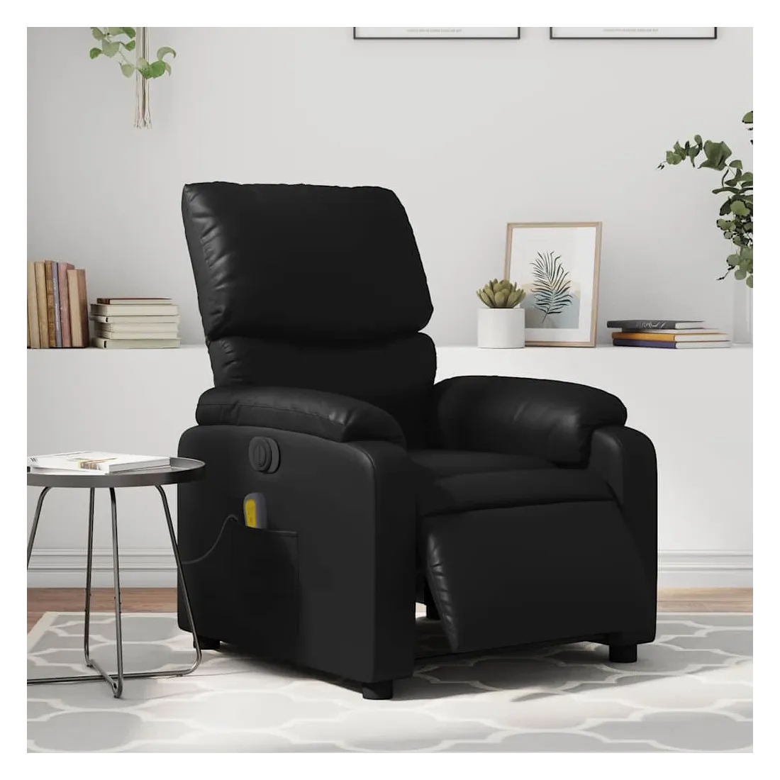 Asseyez-vous et détendez-vous dans ce fauteuil inclinable de massage électrique très confortable ! Fonction d'inclinaison électrique : ce fauteuil inclinable est équipé d'un moteur électrique qui permet de régler automatiquement le repose-pied et le dossier dans n'importe quelle position, selon votre confort, en appuyant simplement sur le bouton situé sur le côté du fauteuil. Cette fonction permet une inclinaison maximale de 135 degrés. En outre, le dossier peut revenir automatiquement à sa position d'origine par une simple pression sur le bouton.Fonction de vibration : les 6 points de massage vous permettent de faire l'expérience d'un massage mieux ciblé. De plus, la télécommande incluse vous permet de choisir différents programmes de massage. La fonction de massage est alimentée par le connecteur USB qui nécessite une source d'alimentation USB certifiée de 5 V (non fournie).Expérience de siège confortable : le siège, le dossier et les larges accoudoirs rembourrés épais recouverts de similicuir procurent une sensation confortable, vous faisant vous sentir enlacé lorsque vous êtes assis. Le similicuir est un matériau très résistant. Il est résistant aux taches, ce qui le rend facile à nettoyer avec un chiffon humide. La surface lisse donne également un aspect luxueux et la beauté du cuir véritable.Poche latérale pratique : ce fauteuil est doté d'une poche latérale pour ranger votre télécommande ou garder vos objets essentiels à portée de main.Cadre solide et stable : le cadre en bois et en métal offre une structure solide et une grande stabilité. Ce fauteuil inclinable est confortable et durable.