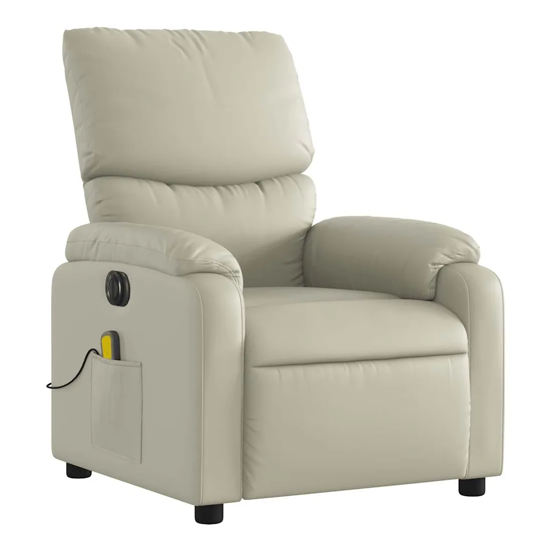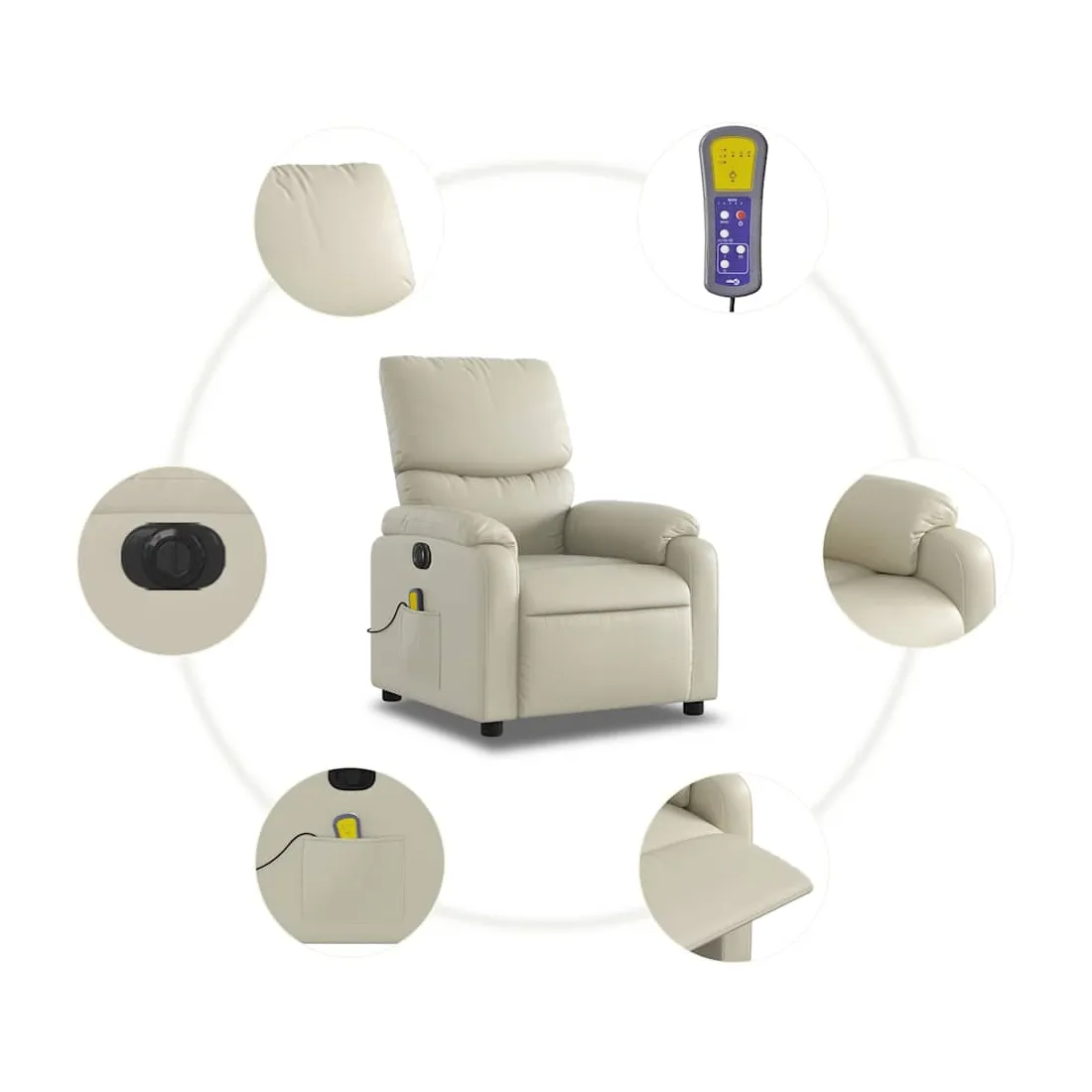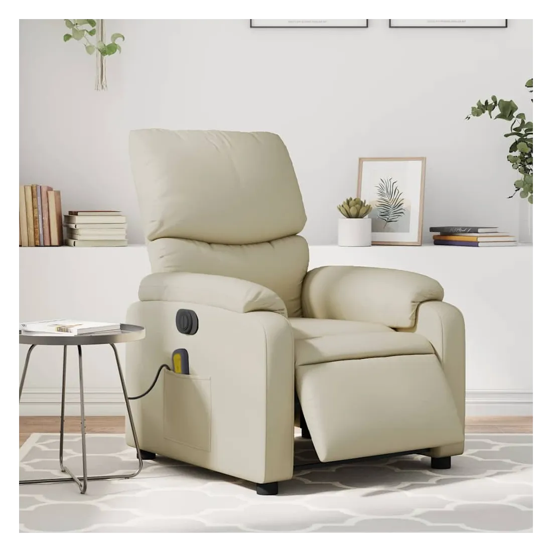 Asseyez-vous et détendez-vous dans ce fauteuil inclinable de massage électrique très confortable ! Fonction d'inclinaison électrique : ce fauteuil inclinable est équipé d'un moteur électrique qui permet de régler automatiquement le repose-pied et le dossier dans n'importe quelle position, selon votre confort, en appuyant simplement sur le bouton situé sur le côté du fauteuil. Cette fonction permet une inclinaison maximale de 135 degrés. En outre, le dossier peut revenir automatiquement à sa position d'origine par une simple pression sur le bouton.Fonction de vibration : les 6 points de massage vous permettent de faire l'expérience d'un massage mieux ciblé. De plus, la télécommande incluse vous permet de choisir différents programmes de massage. La fonction de massage est alimentée par le connecteur USB qui nécessite une source d'alimentation USB certifiée de 5 V (non fournie).Expérience de siège confortable : le siège, le dossier et les larges accoudoirs rembourrés épais recouverts de similicuir procurent une sensation confortable, vous faisant vous sentir enlacé lorsque vous êtes assis. Le similicuir est un matériau très résistant. Il est résistant aux taches, ce qui le rend facile à nettoyer avec un chiffon humide. La surface lisse donne également un aspect luxueux et la beauté du cuir véritable.Poche latérale pratique : ce fauteuil est doté d'une poche latérale pour ranger votre télécommande ou garder vos objets essentiels à portée de main.Cadre solide et stable : le cadre en bois et en métal offre une structure solide et une grande stabilité. Ce fauteuil inclinable est confortable et durable.