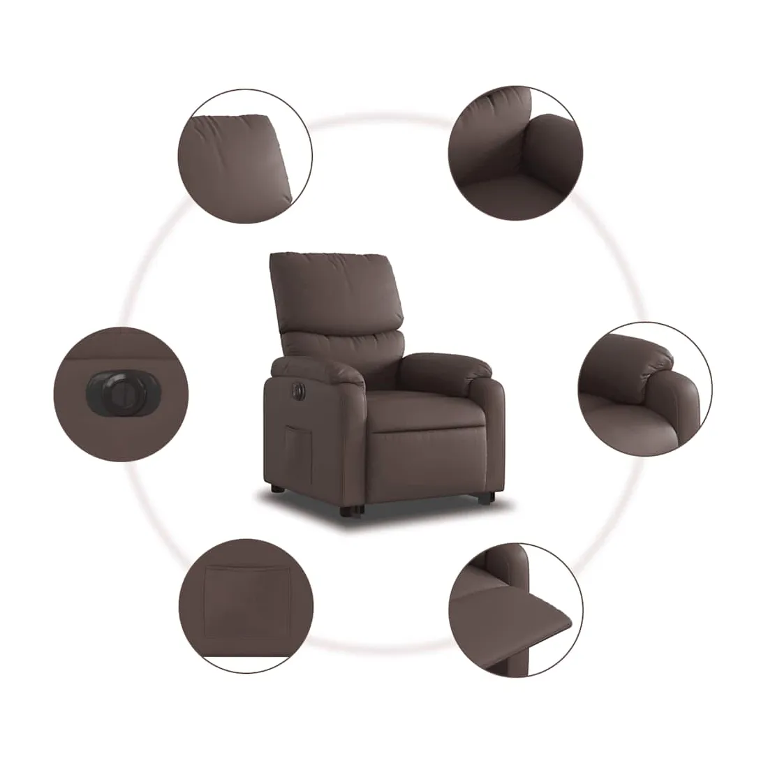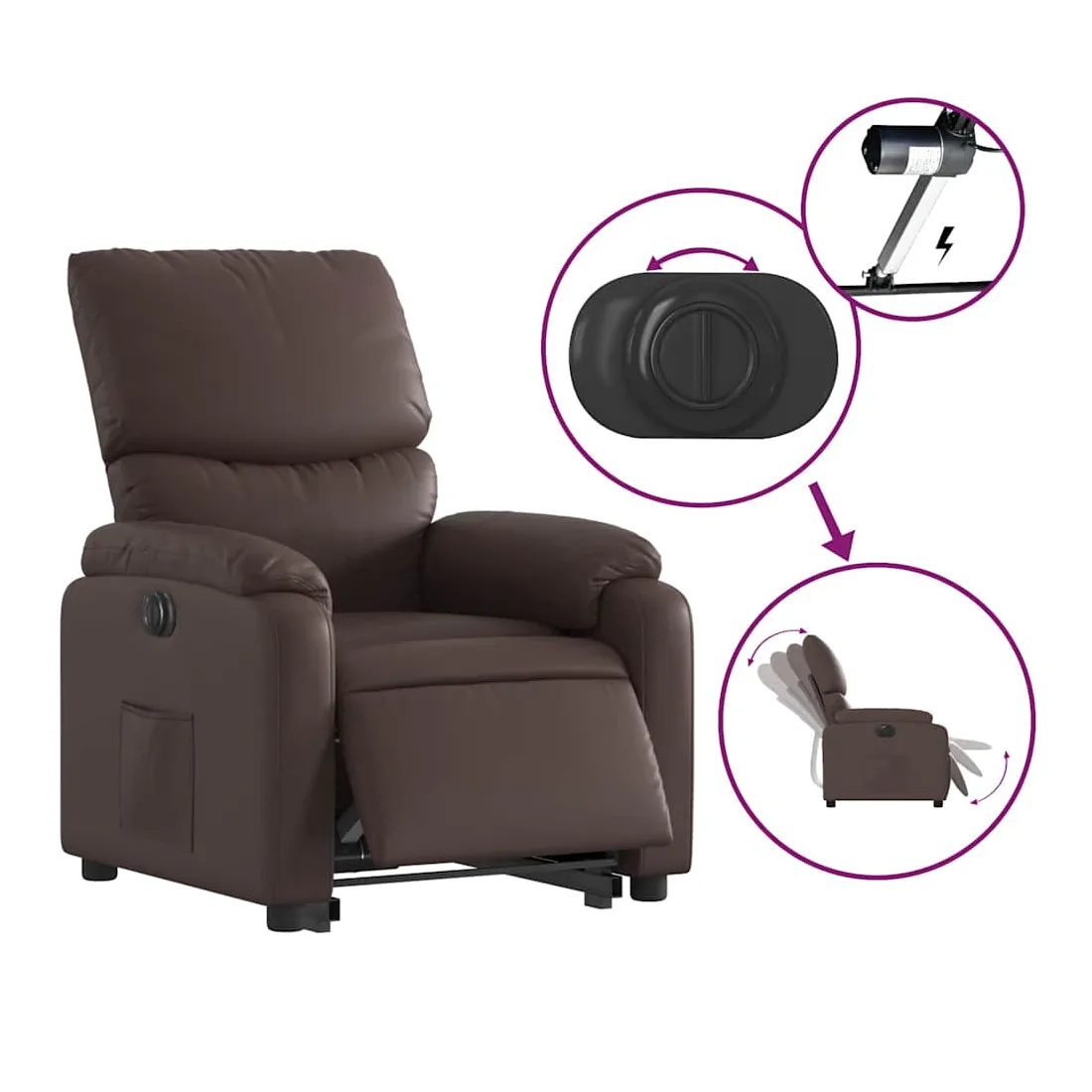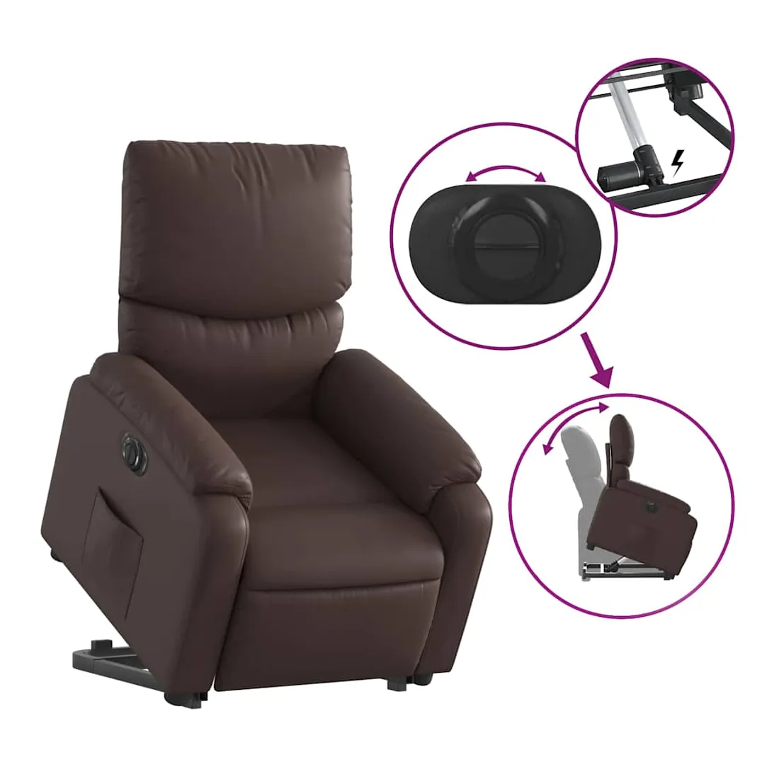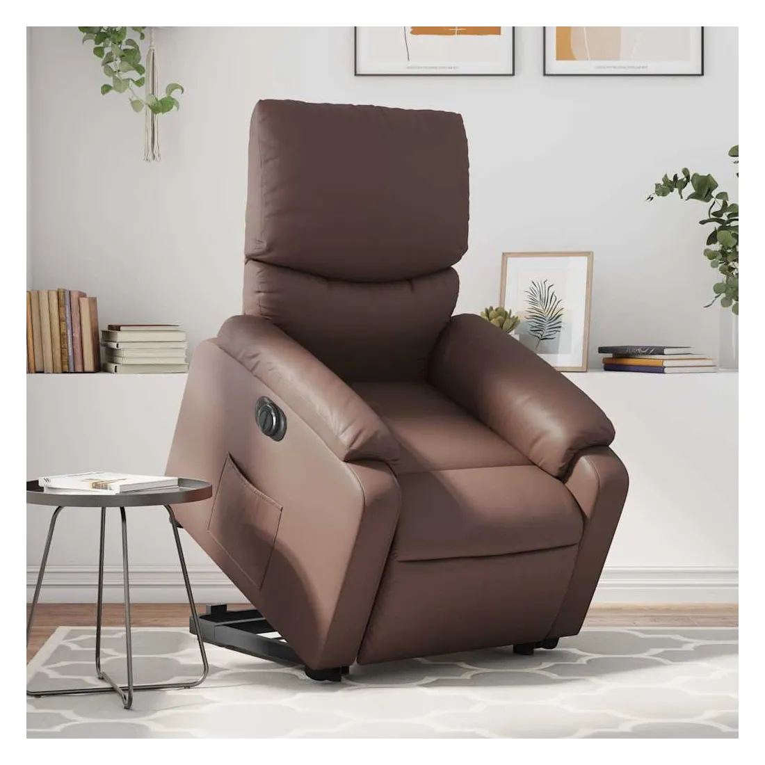 Asseyez-vous et détendez-vous dans ce fauteuil inclinable électrique très confortable ! Fonction de levage électrique : ce fauteuil inclinable pour personnes âgées est équipé d'un moteur électrique pour la fonction de levage. Grâce à la fonction qui pousse toute la chaise vers le haut, vous pouvez facilement vous tenir debout sans stresser votre dos et vos genoux en appuyant simplement sur le bouton.Fonction d'inclinaison électrique : ce fauteuil inclinable est également équipé d'un moteur électrique qui permet de régler automatiquement le repose-pied et le dossier dans n'importe quelle position, selon votre confort, en appuyant simplement sur le bouton situé sur le côté du fauteuil. Cette fonction permet une inclinaison maximale de 135 degrés. En outre, le dossier peut revenir automatiquement à sa position d'origine par une simple pression sur le bouton.Expérience de siège confortable : le siège, le dossier et les larges accoudoirs rembourrés épais recouverts de similicuir procurent une sensation confortable, vous faisant vous sentir enlacé lorsque vous êtes assis. Le similicuir est un matériau très résistant. Il est résistant aux taches, ce qui le rend facile à nettoyer avec un chiffon humide. La surface lisse donne également un aspect luxueux et la beauté du cuir véritable.Poche latérale pratique : ce fauteuil est doté d'une poche latérale pour vous permettre de garder vos objets essentiels à portée de main.Cadre solide et stable : le cadre en bois et en métal offre une structure solide et une grande stabilité. Ce fauteuil inclinable est confortable et durable.