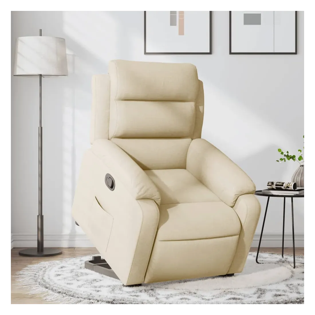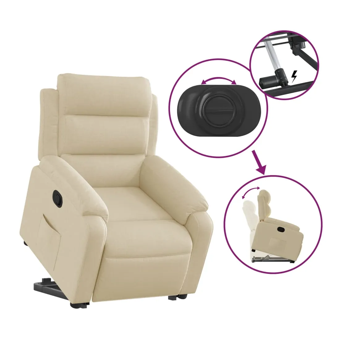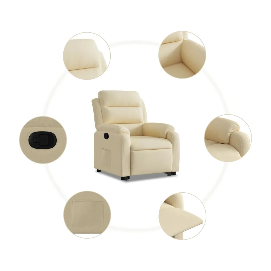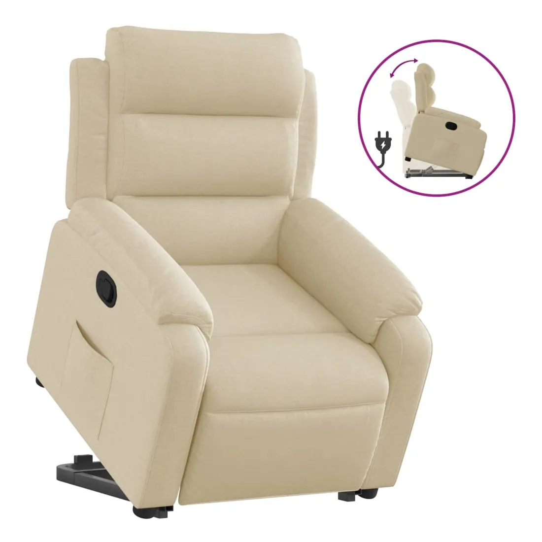 Asseyez-vous et détendez-vous dans ce fauteuil inclinable très confortable ! Fonction de levage électrique : ce fauteuil inclinable pour personnes âgées est équipé d'un moteur électrique pour la fonction de levage. Grâce à la fonction qui pousse toute la chaise vers le haut, vous pouvez facilement vous tenir debout sans stresser votre dos et vos genoux en appuyant simplement sur le bouton.Fonction d'inclinaison manuelle : ce fauteuil inclinable est doté d'une poignée du côté droit. Vous pouvez régler manuellement le repose-pieds et le dossier dans n'importe quelle position selon votre confort en tirant simplement sur la poignée. Cette fonction permet une inclinaison maximale de 135 degrés. De plus, le dossier peut revenir rapidement à sa position d'origine en tirant simplement sur la poignée.Expérience d'assise confortable : le siège, le dossier et les larges accoudoirs bien rembourrés recouverts de tissu procurent une sensation confortable et chaleureuse, vous permettant de vous sentir enveloppé lorsque vous êtes assis. Le tissu présente un aspect simple et épuré et est respirant et durable.Poche latérale pratique : ce fauteuil est doté d'une poche latérale pour vous permettre de garder vos objets essentiels à portée de main.Cadre solide et stable : le cadre en bois et en métal offre une structure solide et une grande stabilité. Ce fauteuil inclinable est confortable et durable.