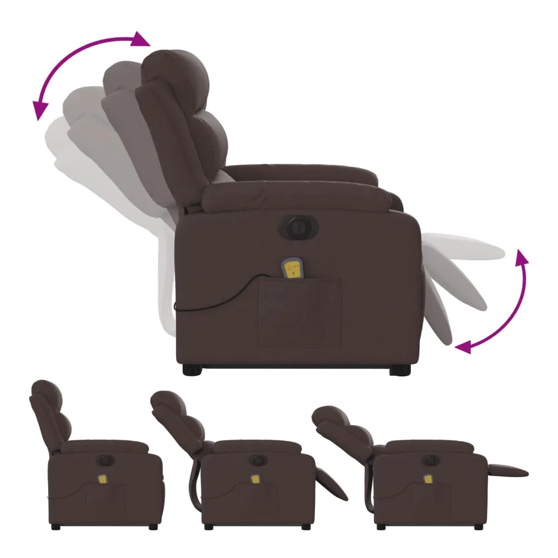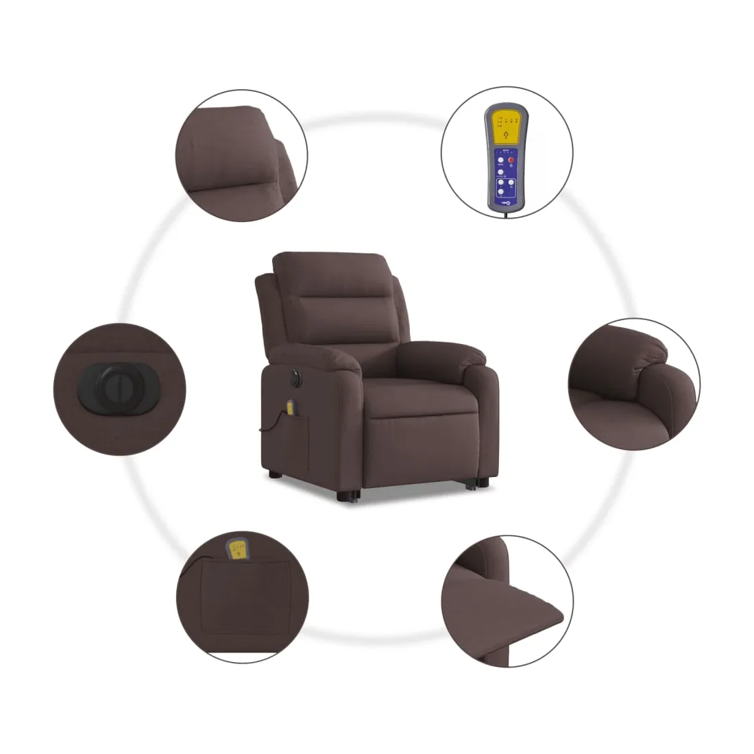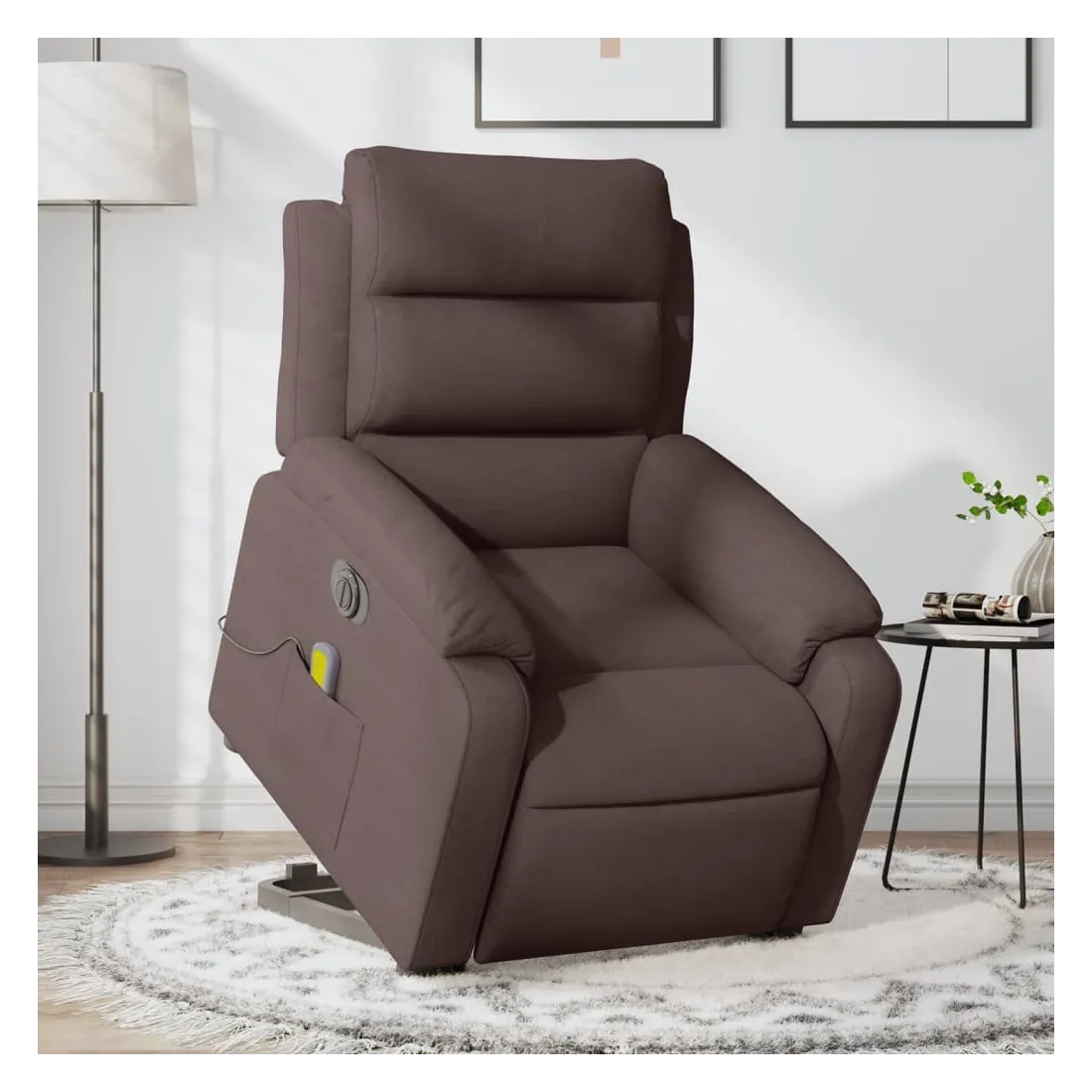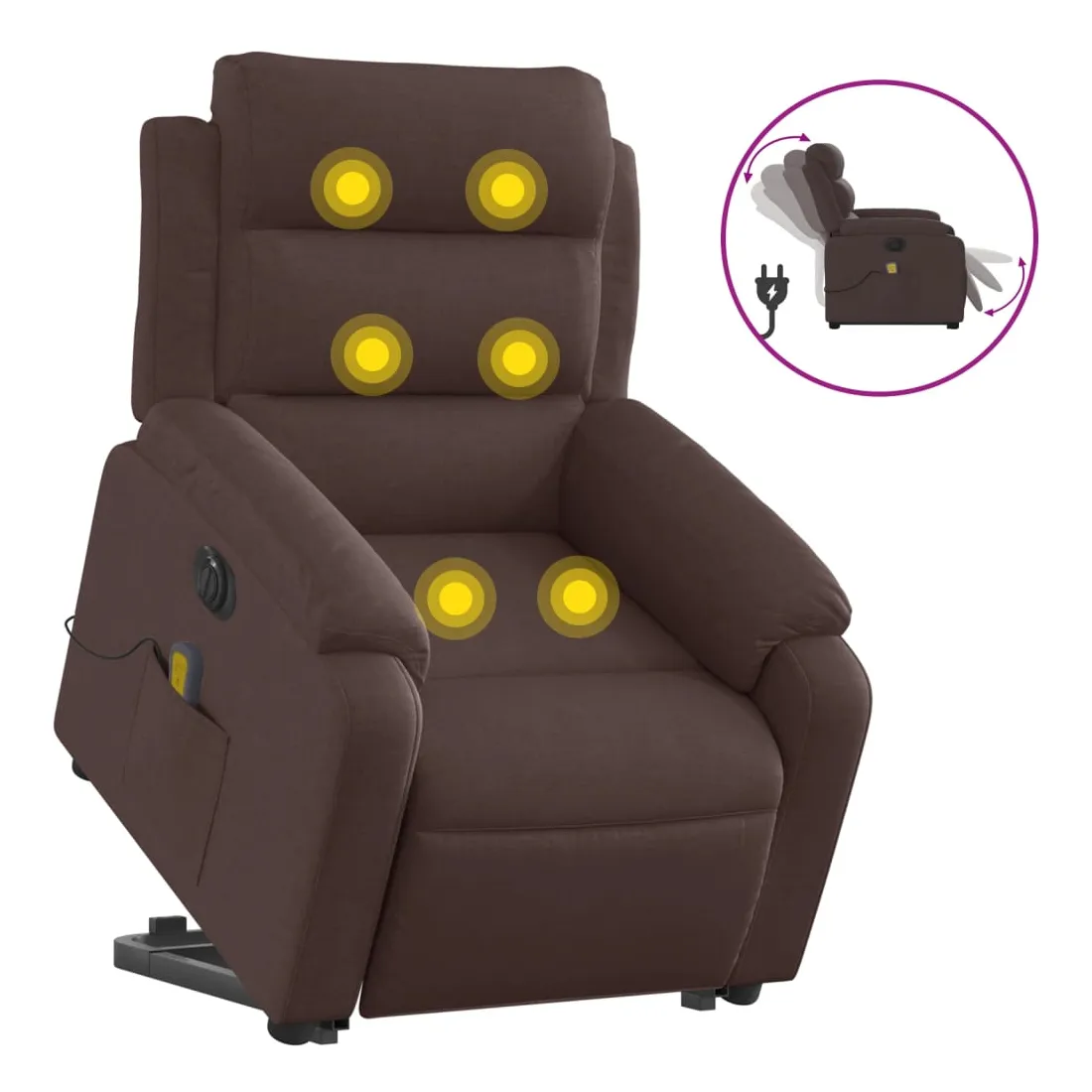 Asseyez-vous et détendez-vous dans ce fauteuil inclinable de massage électrique très confortable ! Fonction de levage électrique : ce fauteuil inclinable pour personnes âgées est équipé d'un moteur électrique pour la fonction de levage. Grâce à la fonction qui pousse toute la chaise vers le haut, vous pouvez facilement vous tenir debout sans stresser votre dos et vos genoux en appuyant simplement sur le bouton.Fonction d'inclinaison électrique : ce fauteuil inclinable est également équipé d'un moteur électrique qui permet de régler automatiquement le repose-pied et le dossier dans n'importe quelle position, selon votre confort, en appuyant simplement sur le bouton situé sur le côté du fauteuil. Cette fonction permet une inclinaison maximale de 135 degrés. En outre, le dossier peut revenir automatiquement à sa position d'origine par une simple pression sur le bouton.Fonction de vibration : les 6 points de massage vous permettent de faire l'expérience d'un massage mieux ciblé. De plus, la télécommande incluse vous permet de choisir différents programmes de massage. La fonction de massage est alimentée par le connecteur USB qui nécessite une source d'alimentation USB certifiée de 5 V (non fournie).Expérience d'assise confortable : le siège, le dossier et les larges accoudoirs bien rembourrés recouverts de tissu procurent une sensation confortable et chaleureuse, vous permettant de vous sentir enveloppé lorsque vous êtes assis. Le tissu présente un aspect simple et épuré et est respirant et durable.Poche latérale pratique : ce fauteuil est doté d'une poche latérale pour ranger votre télécommande ou garder vos objets essentiels à portée de main.Cadre solide et stable : le cadre en bois et en métal offre une structure solide et une grande stabilité. Ce fauteuil inclinable est confortable et durable.