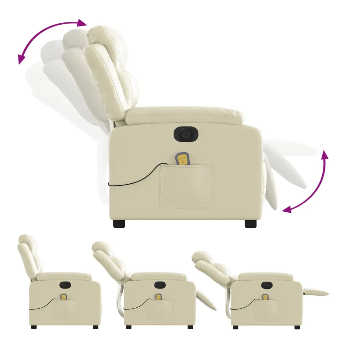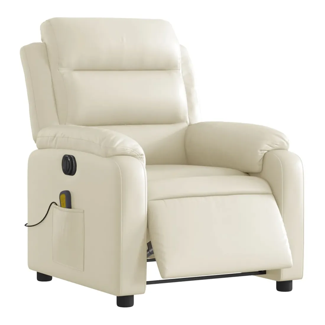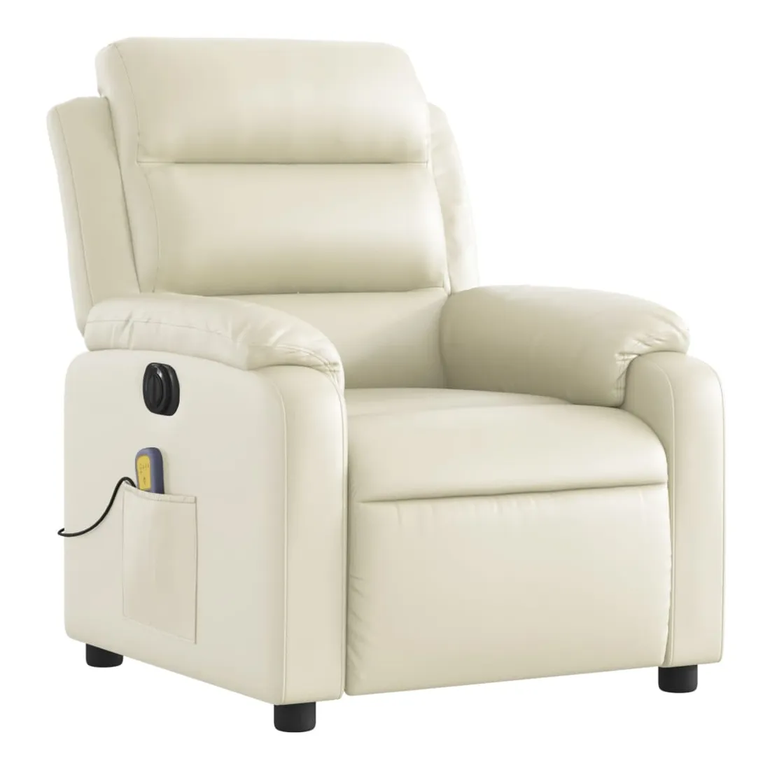 Asseyez-vous et détendez-vous dans ce fauteuil inclinable de massage électrique très confortable ! Fonction d'inclinaison électrique : ce fauteuil inclinable est équipé d'un moteur électrique qui permet de régler automatiquement le repose-pied et le dossier dans n'importe quelle position, selon votre confort, en appuyant simplement sur le bouton situé sur le côté du fauteuil. Cette fonction permet une inclinaison maximale de 135 degrés. En outre, le dossier peut revenir automatiquement à sa position d'origine par une simple pression sur le bouton.Fonction de vibration : les 6 points de massage vous permettent de faire l'expérience d'un massage mieux ciblé. De plus, la télécommande incluse vous permet de choisir différents programmes de massage. La fonction de massage est alimentée par le connecteur USB qui nécessite une source d'alimentation USB certifiée de 5 V (non fournie).Expérience de siège confortable : le siège, le dossier et les larges accoudoirs rembourrés épais recouverts de similicuir procurent une sensation confortable et chaleureuse, vous faisant vous sentir enlacé lorsque vous êtes assis. Le simili cuir est un matériau très résistant. Il est résistant aux taches, ce qui le rend facile à nettoyer avec un chiffon humide. La surface lisse donne également un aspect luxueux et la beauté du cuir véritable.Poche latérale pratique : ce fauteuil est doté d'une poche latérale pour ranger votre télécommande ou garder vos objets essentiels à portée de main.Cadre solide et stable : le cadre en bois et en métal offre une structure solide et une grande stabilité. Ce fauteuil inclinable est confortable et durable.
