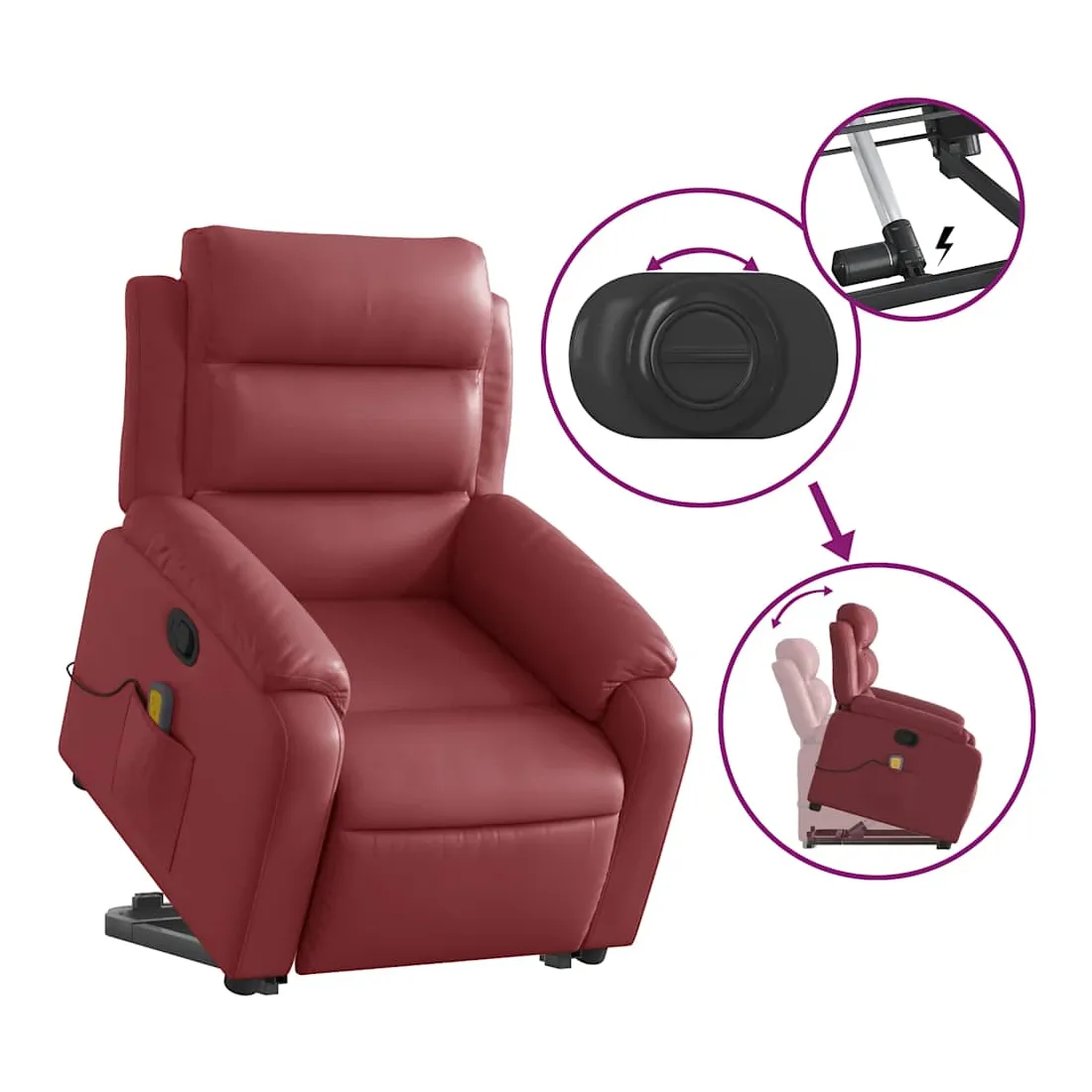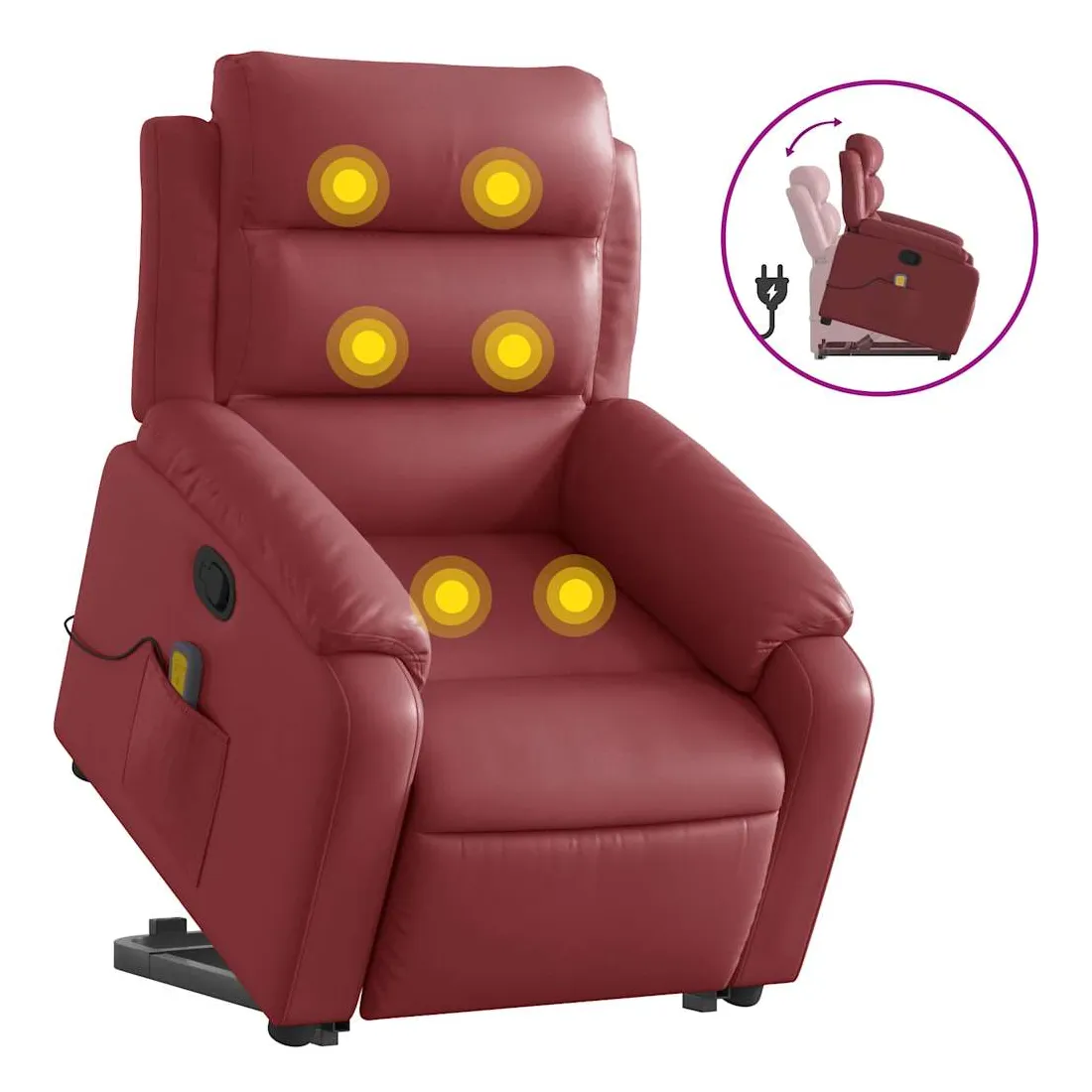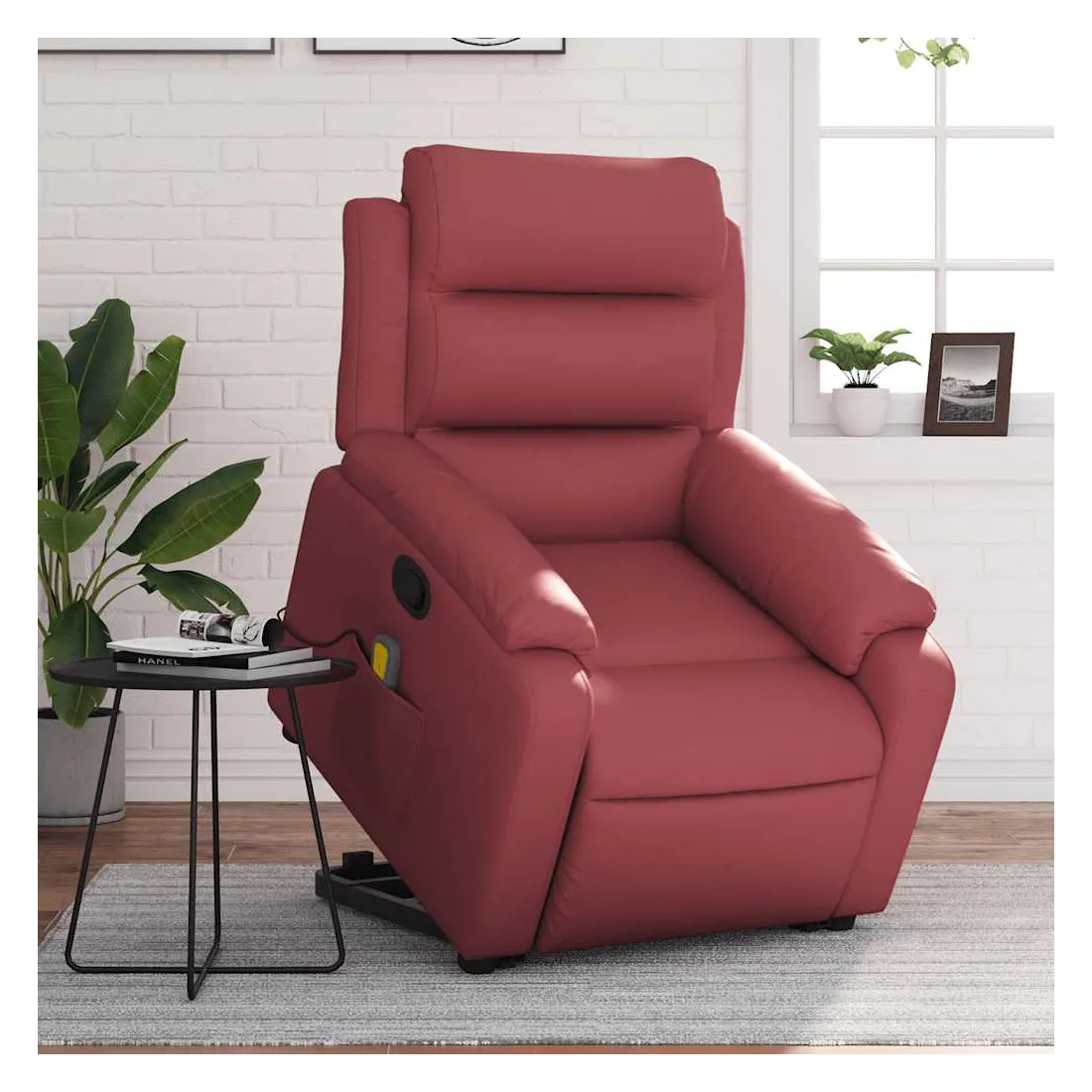 Asseyez-vous et détendez-vous dans ce fauteuil inclinable de massage très confortable ! Fonction de levage électrique : ce fauteuil inclinable pour personnes âgées est équipé d'un moteur électrique pour la fonction de levage. Grâce à la fonction qui pousse toute la chaise vers le haut, vous pouvez facilement vous tenir debout sans stresser votre dos et vos genoux en appuyant simplement sur le bouton.Fonction d'inclinaison manuelle : ce fauteuil inclinable est doté d'une poignée du côté droit. Vous pouvez régler manuellement le repose-pieds et le dossier dans n'importe quelle position selon votre confort en tirant simplement sur la poignée. Cette fonction permet une inclinaison maximale de 135 degrés. De plus, le dossier peut revenir rapidement à sa position d'origine en tirant simplement sur la poignée.Fonction de vibration : les 6 points de massage vous permettent de faire l'expérience d'un massage mieux ciblé. De plus, la télécommande incluse vous permet de choisir différents programmes de massage. La fonction de massage est alimentée par le connecteur USB qui nécessite une source d'alimentation USB certifiée de 5 V (non fournie).Expérience de siège confortable : le siège, le dossier et les larges accoudoirs rembourrés épais recouverts de similicuir procurent une sensation confortable et chaleureuse, vous faisant vous sentir enlacé lorsque vous êtes assis. Le simili cuir est un matériau très résistant. Il est résistant aux taches, ce qui le rend facile à nettoyer avec un chiffon humide. La surface lisse donne également un aspect luxueux et la beauté du cuir véritable.Poche latérale pratique : ce fauteuil est doté d'une poche latérale pour ranger votre télécommande ou garder vos objets essentiels à portée de main.Cadre solide et stable : le cadre en bois et en métal offre une structure solide et une grande stabilité. Ce fauteuil inclinable est confortable et durable.
