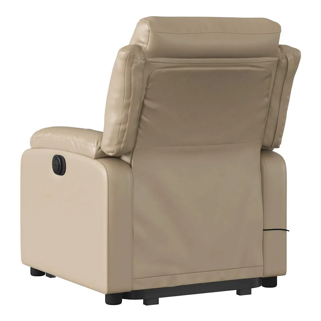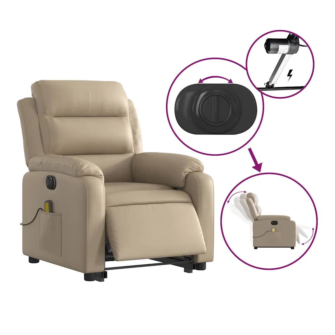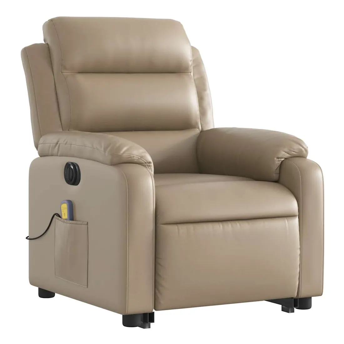 Asseyez-vous et détendez-vous dans ce fauteuil inclinable de massage électrique très confortable ! Fonction de levage électrique : ce fauteuil inclinable pour personnes âgées est équipé d'un moteur électrique pour la fonction de levage. Grâce à la fonction qui pousse toute la chaise vers le haut, vous pouvez facilement vous tenir debout sans stresser votre dos et vos genoux en appuyant simplement sur le bouton.Fonction d'inclinaison électrique : ce fauteuil inclinable est également équipé d'un moteur électrique qui permet de régler automatiquement le repose-pied et le dossier dans n'importe quelle position, selon votre confort, en appuyant simplement sur le bouton situé sur le côté du fauteuil. Cette fonction permet une inclinaison maximale de 135 degrés. En outre, le dossier peut revenir automatiquement à sa position d'origine par une simple pression sur le bouton.Fonction de vibration : les 6 points de massage vous permettent de faire l'expérience d'un massage mieux ciblé. De plus, la télécommande incluse vous permet de choisir différents programmes de massage. La fonction de massage est alimentée par le connecteur USB qui nécessite une source d'alimentation USB certifiée de 5 V (non fournie).Expérience de siège confortable : le siège, le dossier et les larges accoudoirs rembourrés épais recouverts de similicuir procurent une sensation confortable et chaleureuse, vous faisant vous sentir enlacé lorsque vous êtes assis. Le simili cuir est un matériau très résistant. Il est résistant aux taches, ce qui le rend facile à nettoyer avec un chiffon humide. La surface lisse donne également un aspect luxueux et la beauté du cuir véritable.Poche latérale pratique : ce fauteuil est doté d'une poche latérale pour ranger votre télécommande ou garder vos objets essentiels à portée de main.Cadre solide et stable : le cadre en bois et en métal offre une structure solide et une grande stabilité. Ce fauteuil inclinable est confortable et durable.