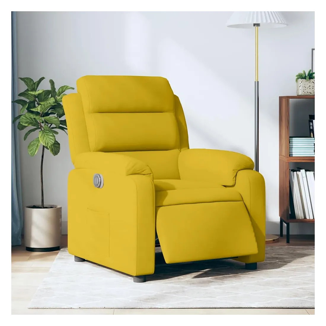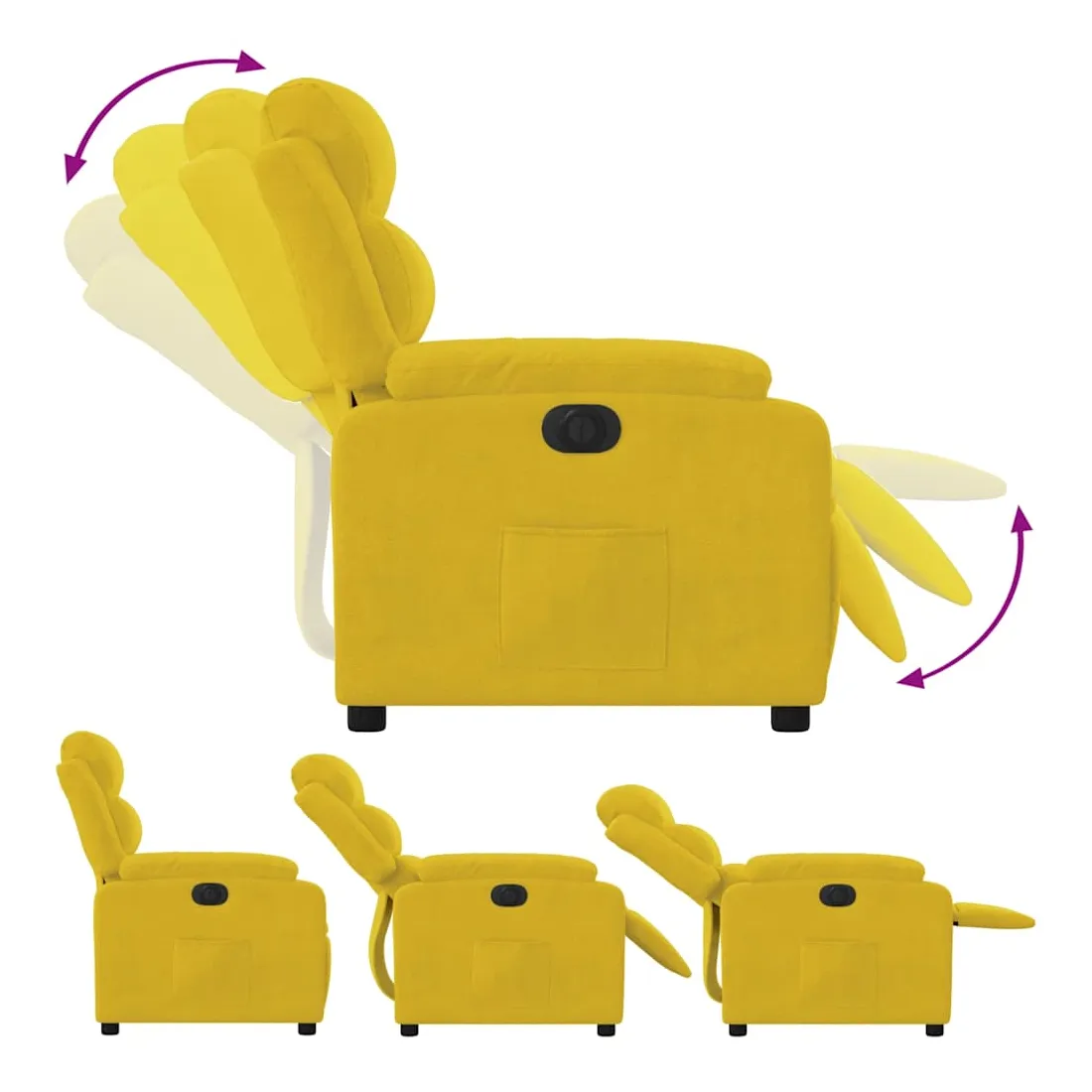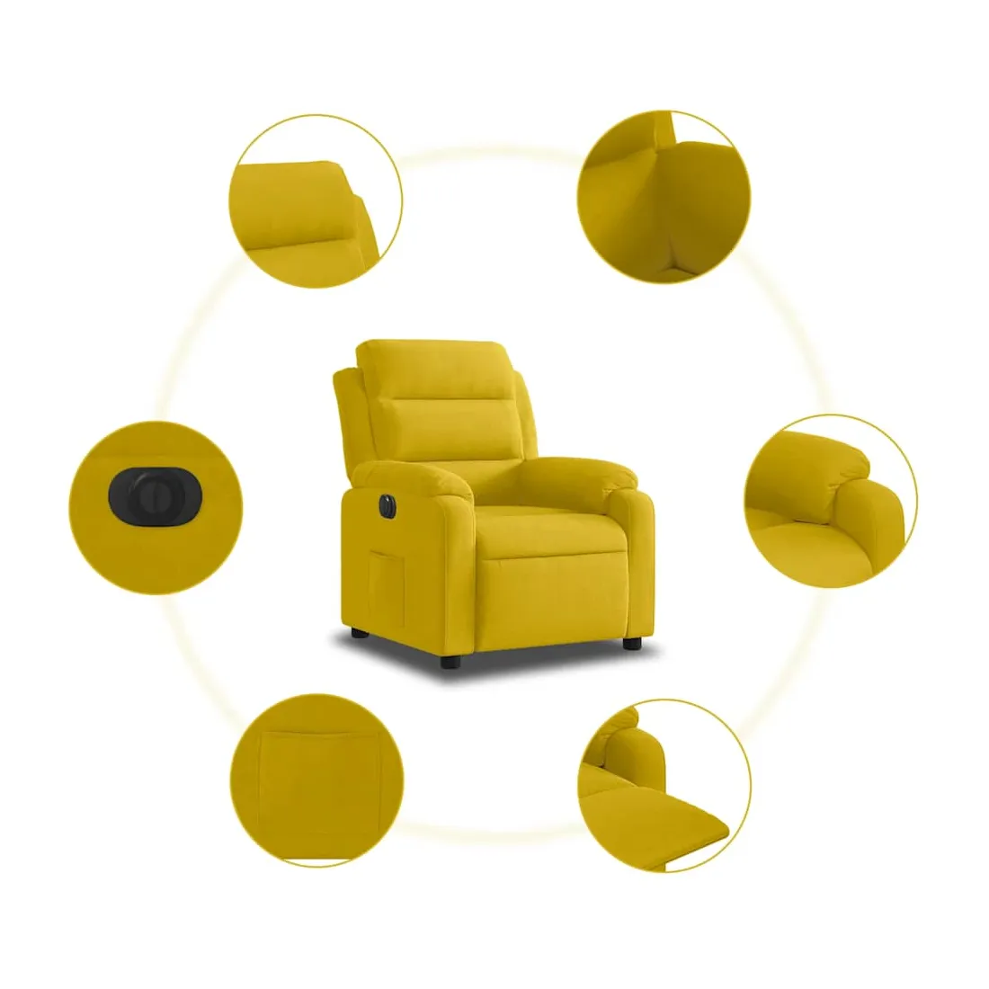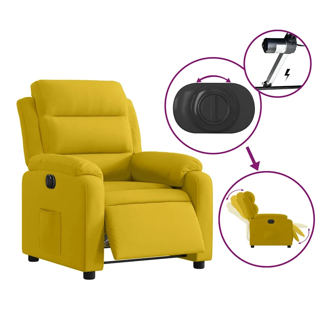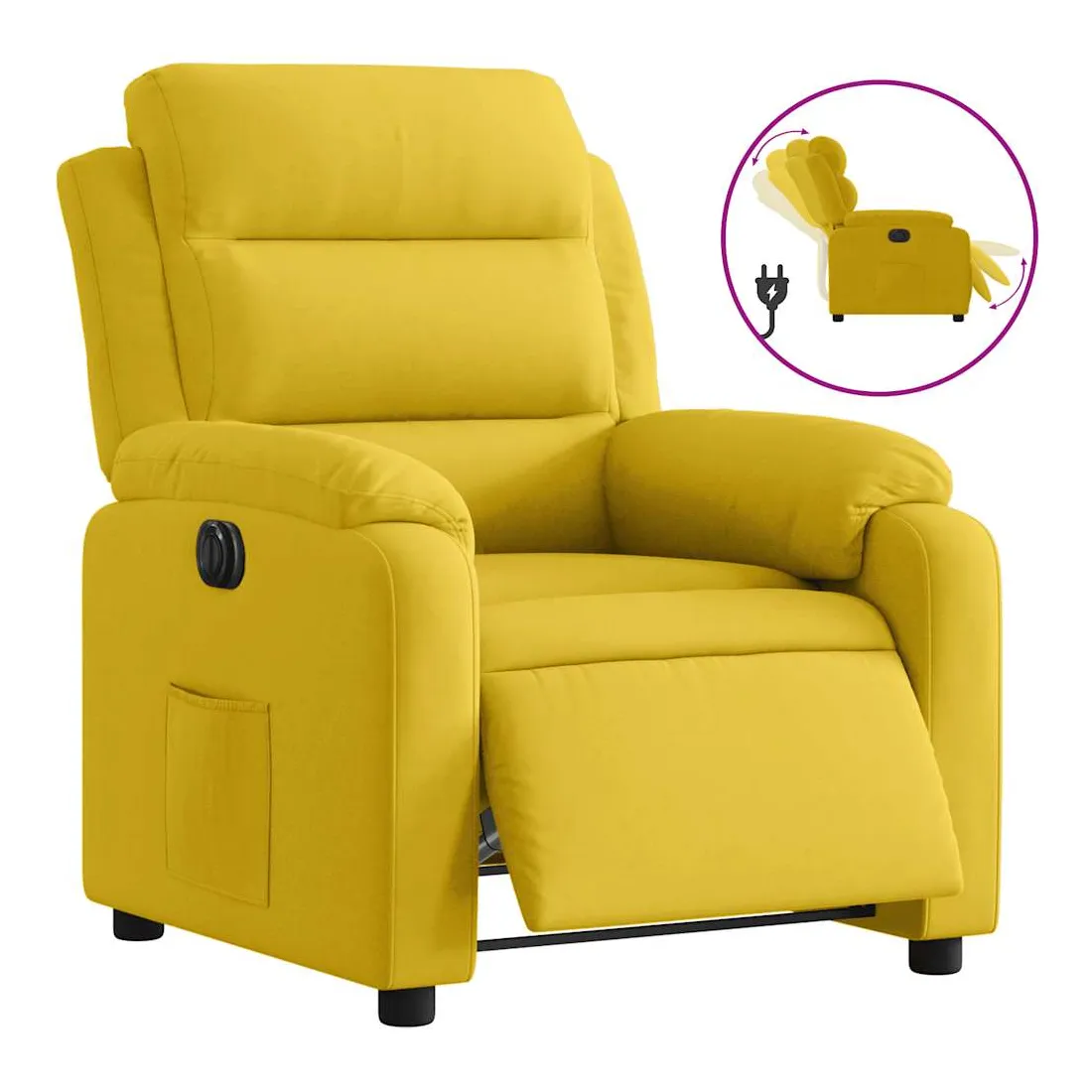 Asseyez-vous et détendez-vous dans ce fauteuil inclinable électrique très confortable ! Fonction d'inclinaison électrique : ce fauteuil inclinable est équipé d'un moteur électrique qui permet de régler automatiquement le repose-pied et le dossier dans n'importe quelle position, selon votre confort, en appuyant simplement sur le bouton situé sur le côté du fauteuil. Cette fonction permet une inclinaison maximale de 135 degrés. En outre, le dossier peut revenir automatiquement à sa position d'origine par une simple pression sur le bouton.Expérience d'assise confortable : le siège, le dossier et les larges accoudoirs rembourrés épais recouverts de velours procurent une sensation confortable et chaleureuse, vous faisant vous sentir enlacé lorsque vous êtes assis. Le velours est un tissu doux et confortable qui est agréable sur la peau.Poche latérale pratique : ce fauteuil est doté d'une poche latérale pour vous permettre de garder vos objets essentiels à portée de main.Cadre solide et stable : le cadre en bois et en métal offre une structure solide et une grande stabilité. Ce fauteuil inclinable est confortable et durable.