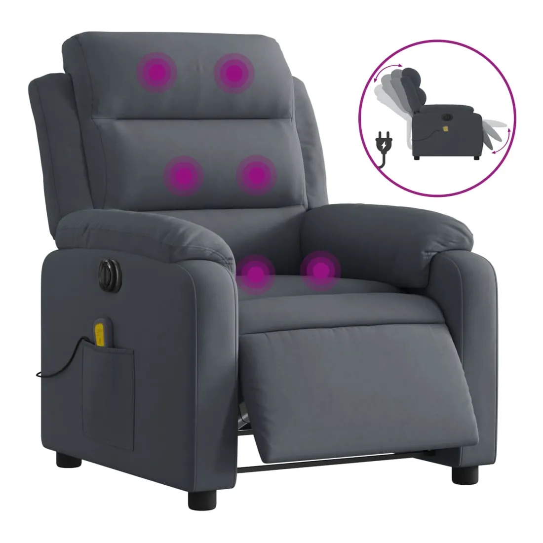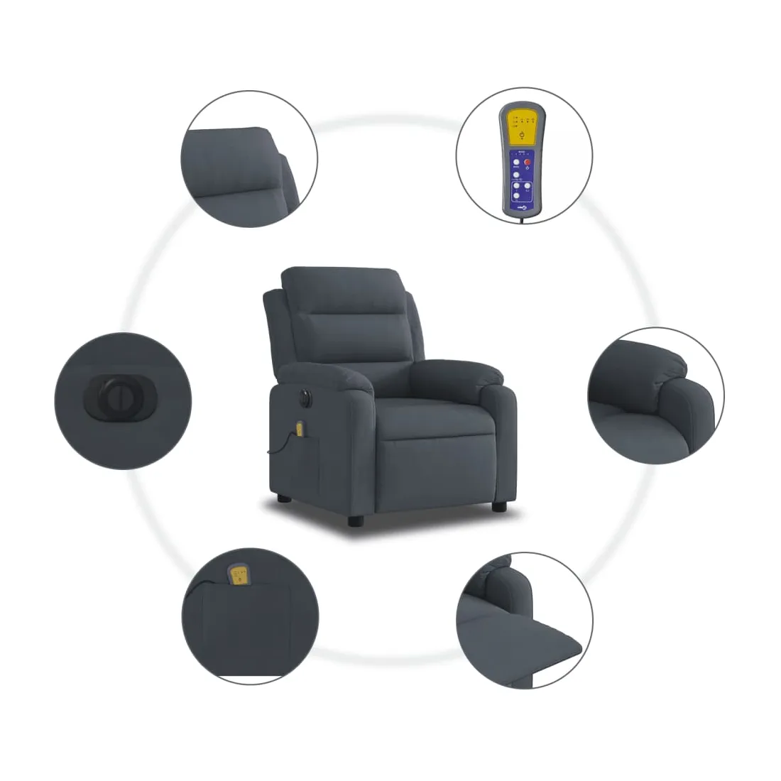 Asseyez-vous et détendez-vous dans ce fauteuil inclinable de massage électrique très confortable ! Fonction d'inclinaison électrique : ce fauteuil inclinable est équipé d'un moteur électrique qui permet de régler automatiquement le repose-pied et le dossier dans n'importe quelle position, selon votre confort, en appuyant simplement sur le bouton situé sur le côté du fauteuil. Cette fonction permet une inclinaison maximale de 135 degrés. En outre, le dossier peut revenir automatiquement à sa position d'origine par une simple pression sur le bouton.Fonction de vibration : les 6 points de massage vous permettent de faire l'expérience d'un massage mieux ciblé. De plus, la télécommande incluse vous permet de choisir différents programmes de massage. La fonction de massage est alimentée par le connecteur USB qui nécessite une source d'alimentation USB certifiée de 5 V (non fournie).Expérience d'assise confortable : le siège, le dossier et les larges accoudoirs rembourrés épais recouverts de velours procurent une sensation confortable et chaleureuse, vous faisant vous sentir enlacé lorsque vous êtes assis. Le velours est un tissu doux et confortable qui est agréable sur la peau.Poche latérale pratique : ce fauteuil est doté d'une poche latérale pour ranger votre télécommande ou garder vos objets essentiels à portée de main.Cadre solide et stable : le cadre en bois et en métal offre une structure solide et une grande stabilité. Ce fauteuil inclinable est confortable et durable.