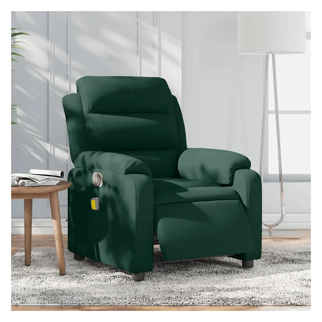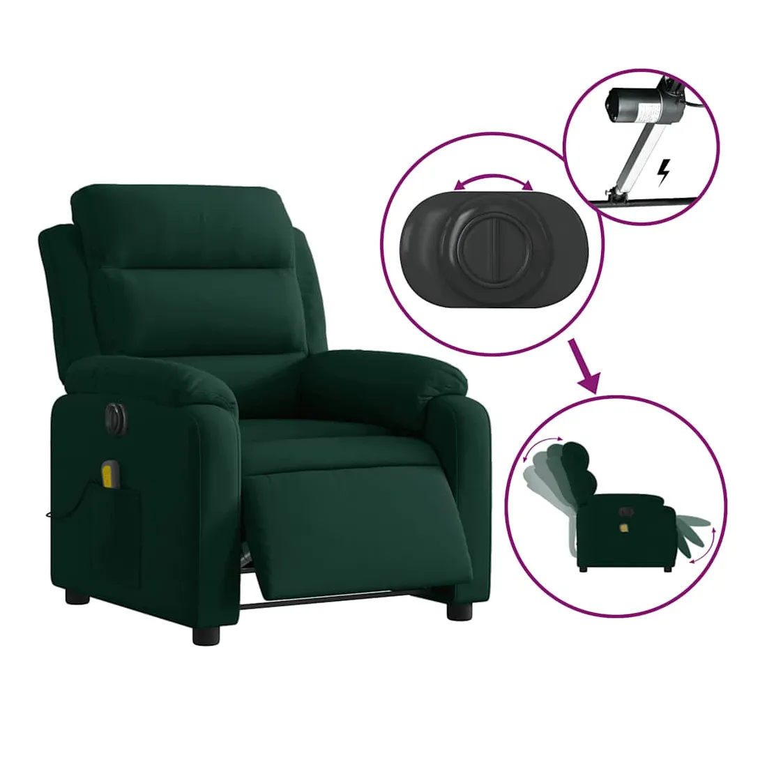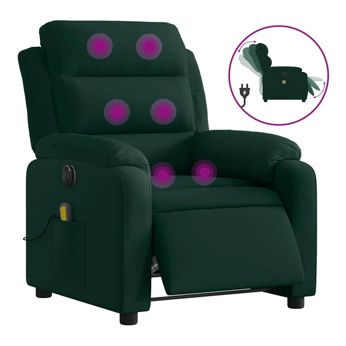 Asseyez-vous et détendez-vous dans ce fauteuil inclinable de massage électrique très confortable ! Fonction d'inclinaison électrique : ce fauteuil inclinable est équipé d'un moteur électrique qui permet de régler automatiquement le repose-pied et le dossier dans n'importe quelle position, selon votre confort, en appuyant simplement sur le bouton situé sur le côté du fauteuil. Cette fonction permet une inclinaison maximale de 135 degrés. En outre, le dossier peut revenir automatiquement à sa position d'origine par une simple pression sur le bouton.Fonction de vibration : les 6 points de massage vous permettent de faire l'expérience d'un massage mieux ciblé. De plus, la télécommande incluse vous permet de choisir différents programmes de massage. La fonction de massage est alimentée par le connecteur USB qui nécessite une source d'alimentation USB certifiée de 5 V (non fournie).Expérience d'assise confortable : le siège, le dossier et les larges accoudoirs rembourrés épais recouverts de velours procurent une sensation confortable et chaleureuse, vous faisant vous sentir enlacé lorsque vous êtes assis. Le velours est un tissu doux et confortable qui est agréable sur la peau.Poche latérale pratique : ce fauteuil est doté d'une poche latérale pour ranger votre télécommande ou garder vos objets essentiels à portée de main.Cadre solide et stable : le cadre en bois et en métal offre une structure solide et une grande stabilité. Ce fauteuil inclinable est confortable et durable.