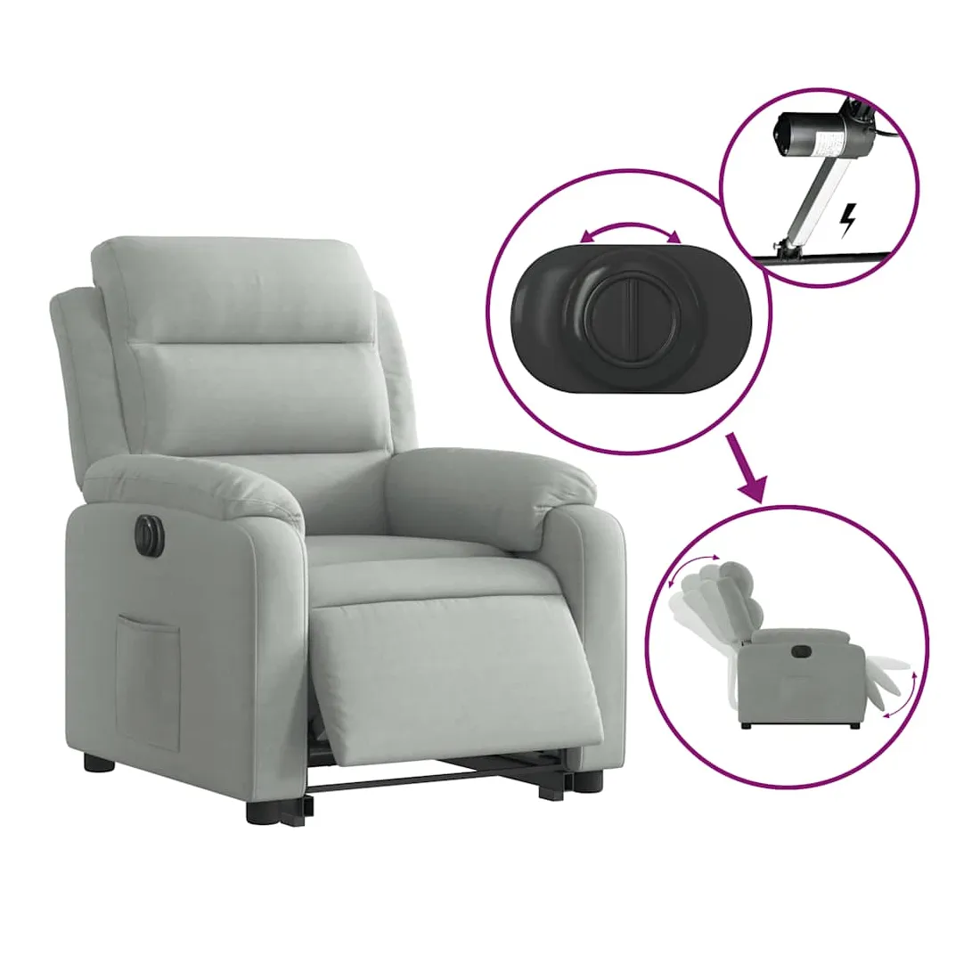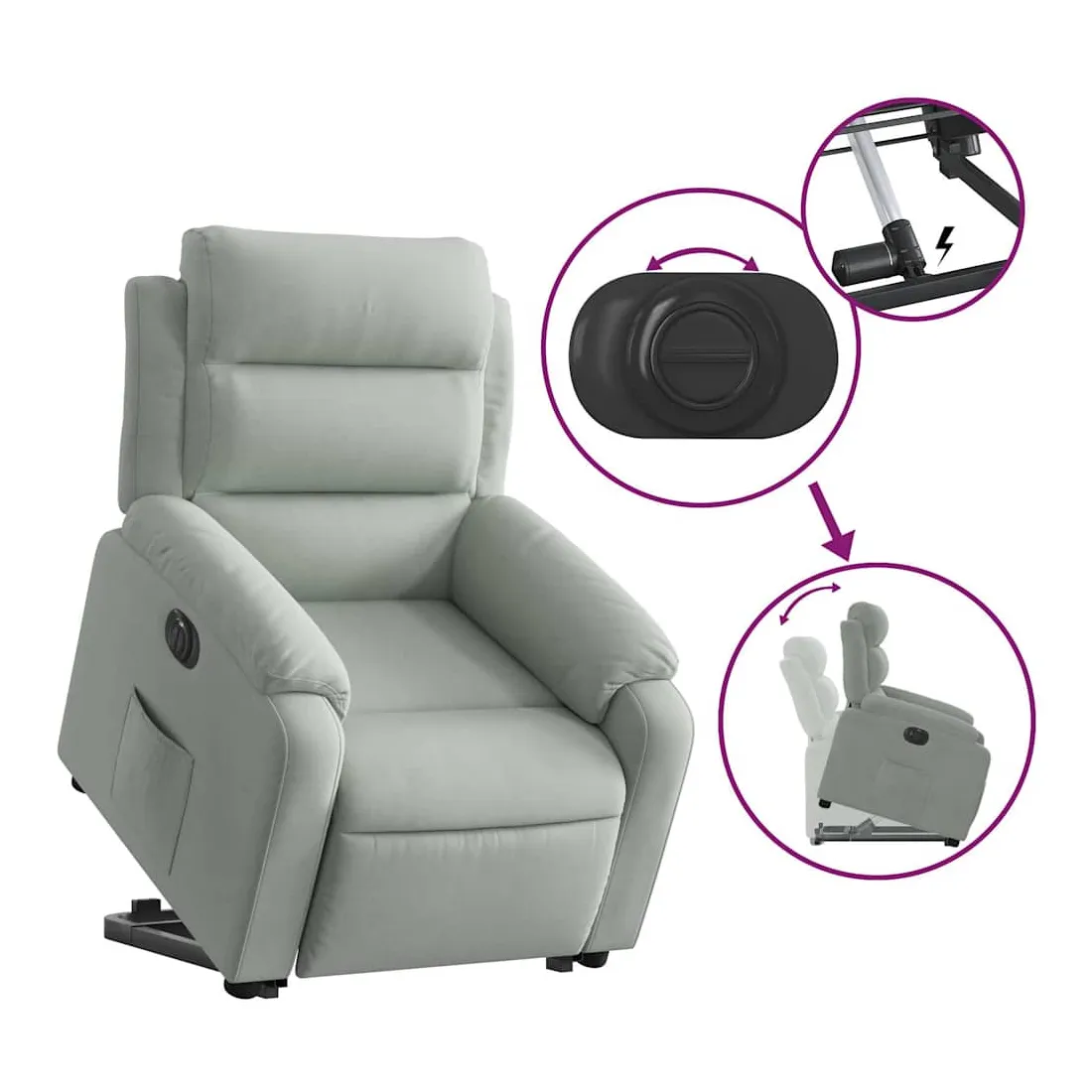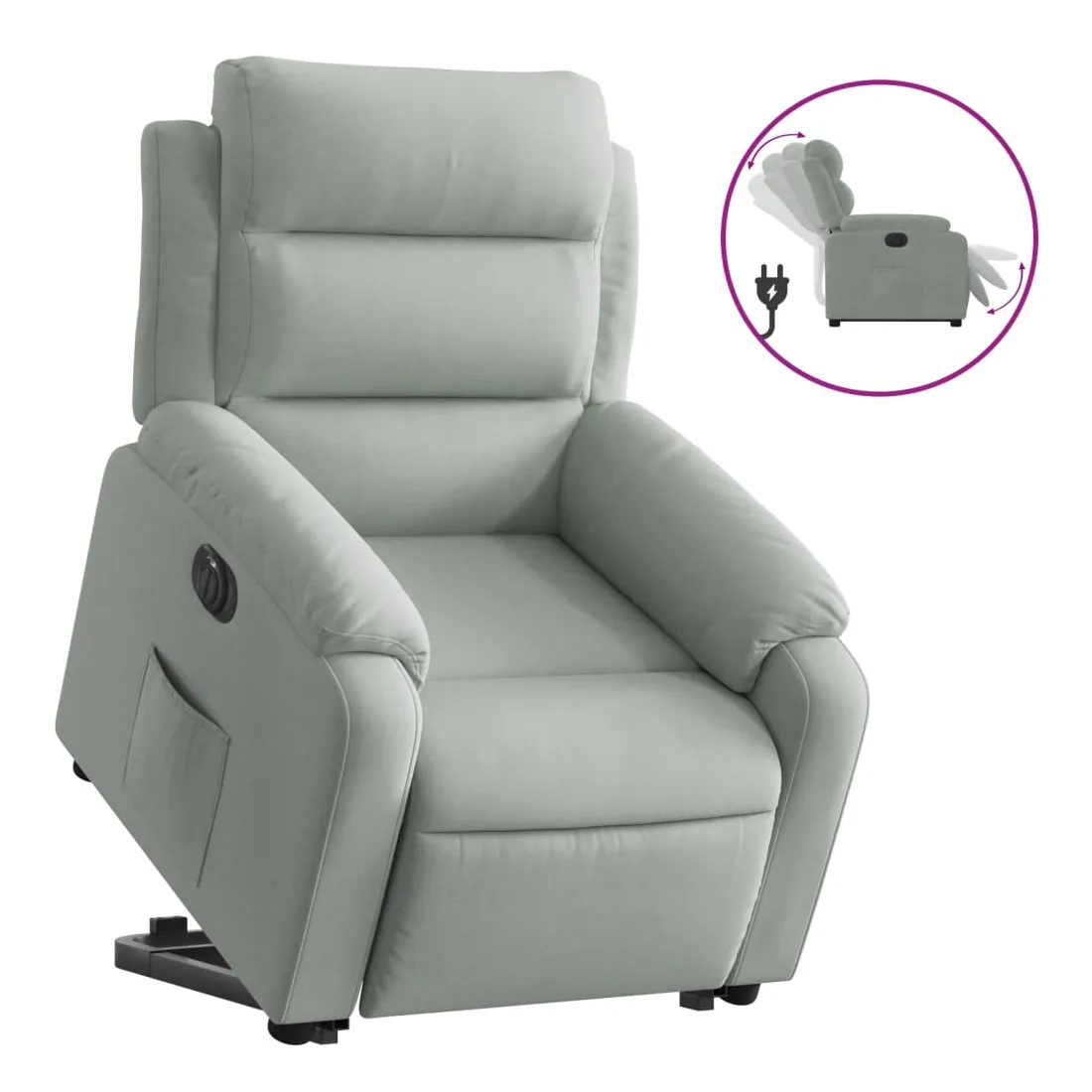 Asseyez-vous et détendez-vous dans ce fauteuil inclinable électrique très confortable ! Fonction de levage électrique : ce fauteuil inclinable pour personnes âgées est équipé d'un moteur électrique pour la fonction de levage. Grâce à la fonction qui pousse toute la chaise vers le haut, vous pouvez facilement vous tenir debout sans stresser votre dos et vos genoux en appuyant simplement sur le bouton.Fonction d'inclinaison électrique : ce fauteuil inclinable est également équipé d'un moteur électrique qui permet de régler automatiquement le repose-pied et le dossier dans n'importe quelle position, selon votre confort, en appuyant simplement sur le bouton situé sur le côté du fauteuil. Cette fonction permet une inclinaison maximale de 135 degrés. En outre, le dossier peut revenir automatiquement à sa position d'origine par une simple pression sur le bouton.Expérience d'assise confortable : le siège, le dossier et les larges accoudoirs rembourrés épais recouverts de velours procurent une sensation confortable et chaleureuse, vous faisant vous sentir enlacé lorsque vous êtes assis. Le velours est un tissu doux et confortable qui est agréable sur la peau.Poche latérale pratique : ce fauteuil est doté d'une poche latérale pour vous permettre de garder vos objets essentiels à portée de main.Cadre solide et stable : le cadre en bois et en métal offre une structure solide et une grande stabilité. Ce fauteuil inclinable est confortable et durable.