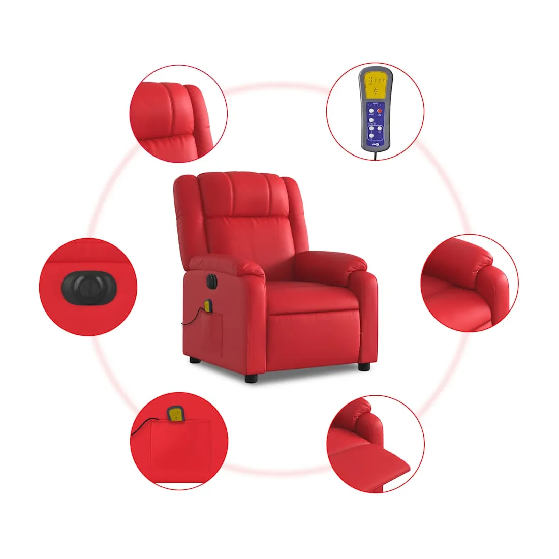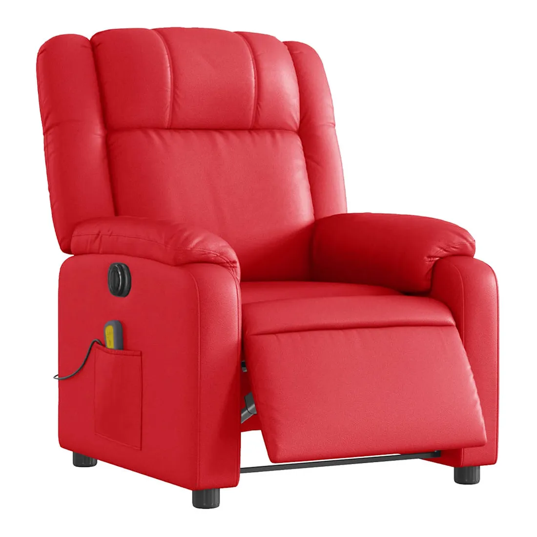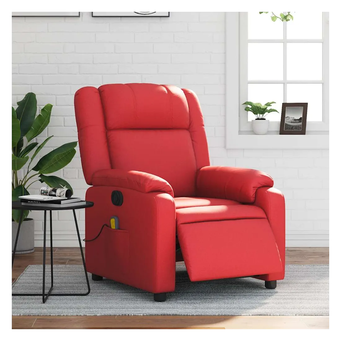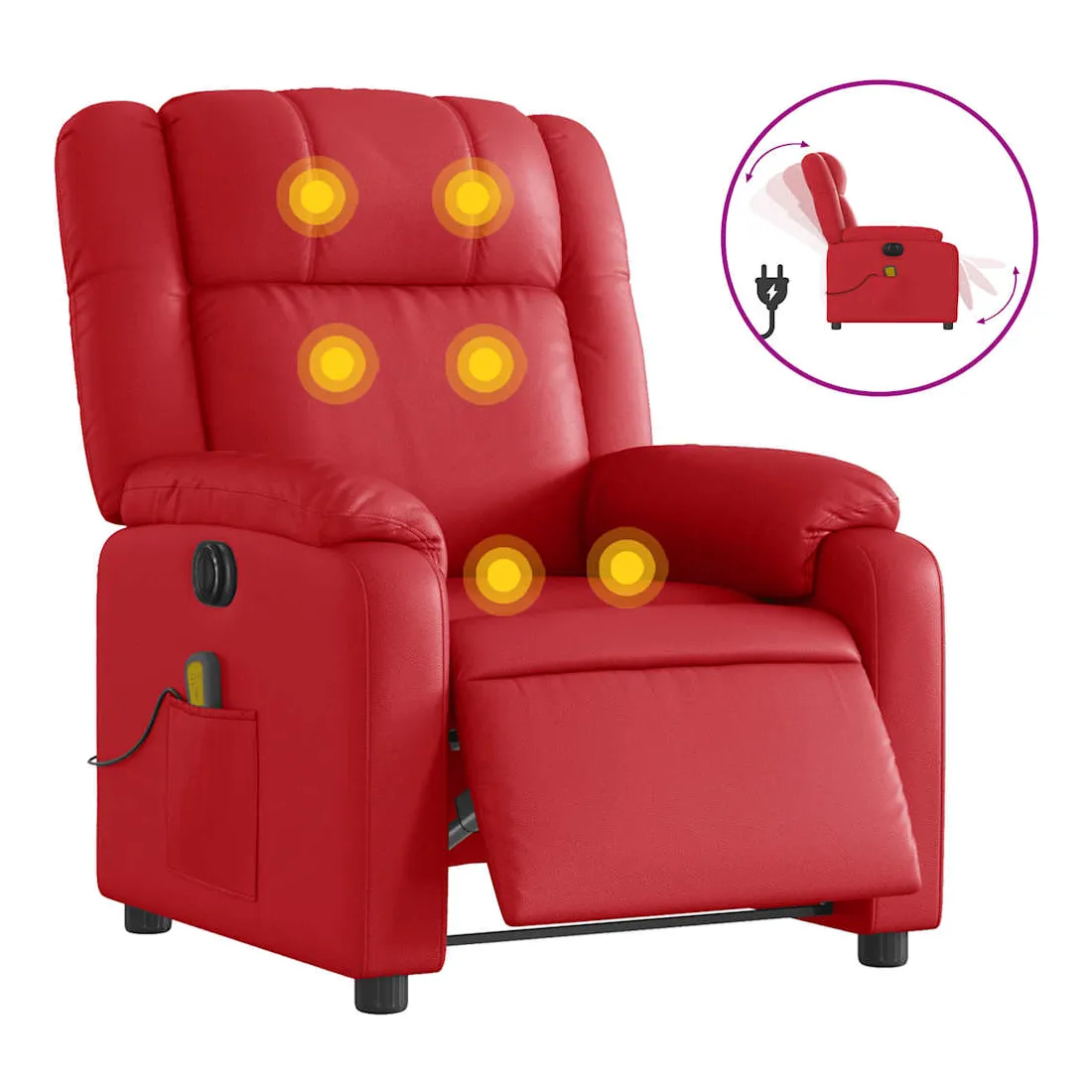 Asseyez-vous et détendez-vous dans ce fauteuil inclinable de massage électrique très confortable ! Fonction d'inclinaison électrique : ce fauteuil inclinable est équipé d'un moteur électrique qui permet de régler automatiquement le repose-pied et le dossier dans n'importe quelle position, selon votre confort, en appuyant simplement sur le bouton situé sur le côté du fauteuil. Cette fonction permet une inclinaison maximale de 135 degrés. En outre, le dossier peut revenir automatiquement à sa position d'origine par une simple pression sur le bouton.Fonction de vibration : les 6 points de massage vous permettent de faire l'expérience d'un massage mieux ciblé. De plus, la télécommande incluse vous permet de choisir différents programmes de massage. La fonction de massage est alimentée par le connecteur USB qui nécessite une source d'alimentation USB certifiée de 5 V (non fournie).Expérience de siège confortable : le siège, le dossier et les larges accoudoirs rembourrés épais recouverts de similicuir procurent une sensation confortable et chaleureuse, vous faisant vous sentir enlacé lorsque vous êtes assis. Le simili cuir est un matériau très résistant. Il est résistant aux taches, ce qui le rend facile à nettoyer avec un chiffon humide. La surface lisse donne également un aspect luxueux et la beauté du cuir véritable.Poche latérale pratique : ce fauteuil est doté d'une poche latérale pour ranger votre télécommande ou garder vos objets essentiels à portée de main.Cadre solide et stable : le cadre en bois et en métal offre une structure solide et une grande stabilité. Ce fauteuil inclinable est confortable et durable.