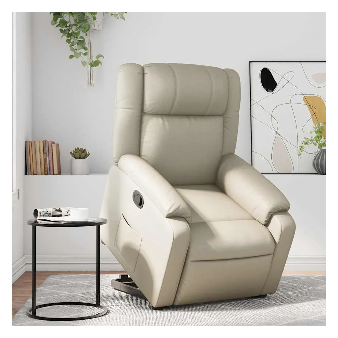 Asseyez-vous et détendez-vous dans ce fauteuil inclinable très confortable ! Fonction de levage électrique : ce fauteuil inclinable pour personnes âgées est équipé d'un moteur électrique pour la fonction de levage. Grâce à la fonction qui pousse toute la chaise vers le haut, vous pouvez facilement vous tenir debout sans stresser votre dos et vos genoux en appuyant simplement sur le bouton.Fonction d'inclinaison manuelle : ce fauteuil inclinable est doté d'une poignée du côté droit. Vous pouvez régler manuellement le repose-pieds et le dossier dans n'importe quelle position selon votre confort en tirant simplement sur la poignée. Cette fonction permet une inclinaison maximale de 135 degrés. De plus, le dossier peut revenir rapidement à sa position d'origine en tirant simplement sur la poignée.Expérience de siège confortable : le siège, le dossier et les larges accoudoirs rembourrés épais recouverts de similicuir procurent une sensation confortable et chaleureuse, vous faisant vous sentir enlacé lorsque vous êtes assis. Le simili cuir est un matériau très résistant. Il est résistant aux taches, ce qui le rend facile à nettoyer avec un chiffon humide. La surface lisse donne également un aspect luxueux et la beauté du cuir véritable.Poche latérale pratique : ce fauteuil est doté d'une poche latérale pour vous permettre de garder vos objets essentiels à portée de main.Cadre solide et stable : le cadre en bois et en métal offre une structure solide et une grande stabilité. Ce fauteuil inclinable est confortable et durable.